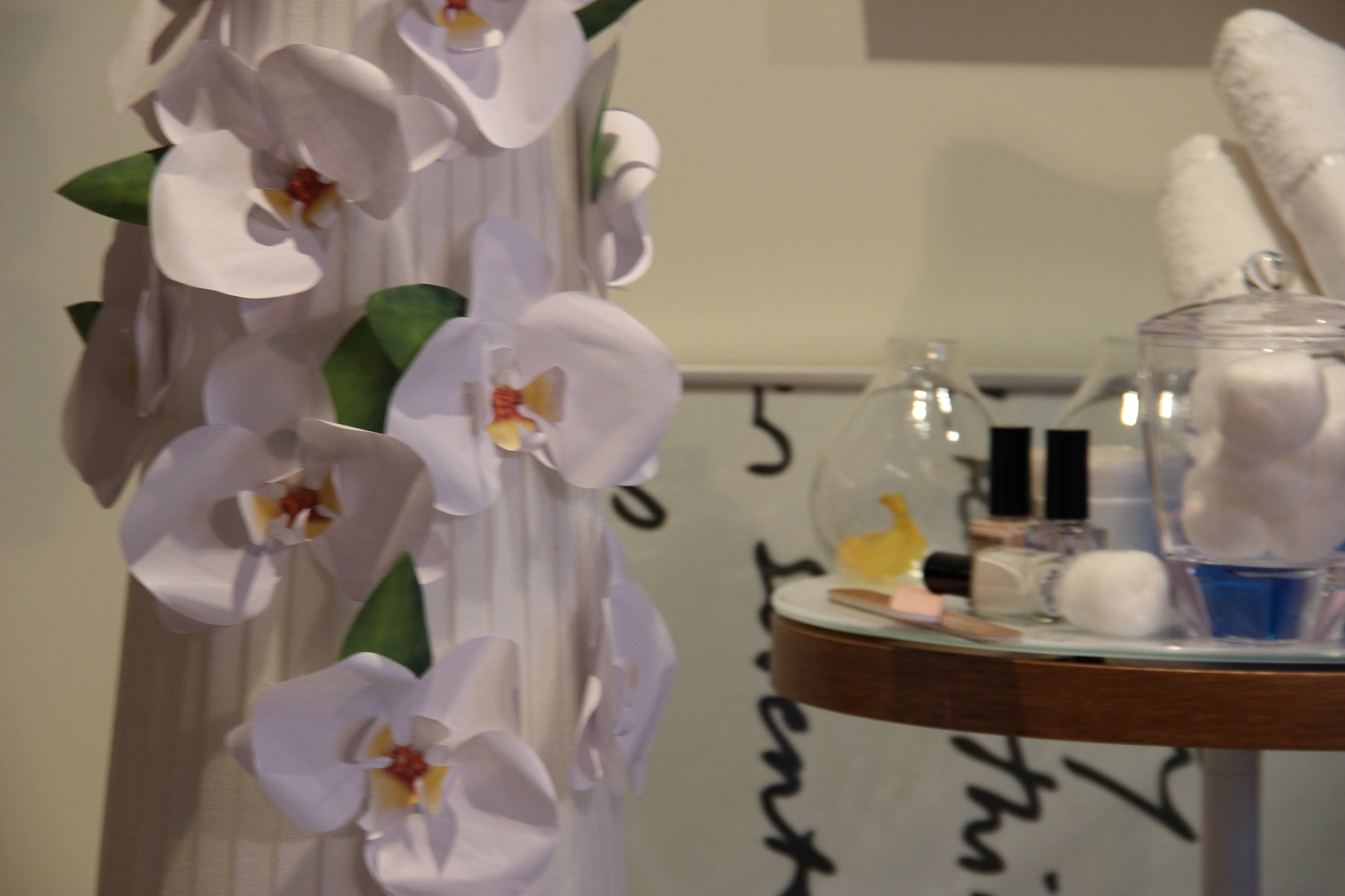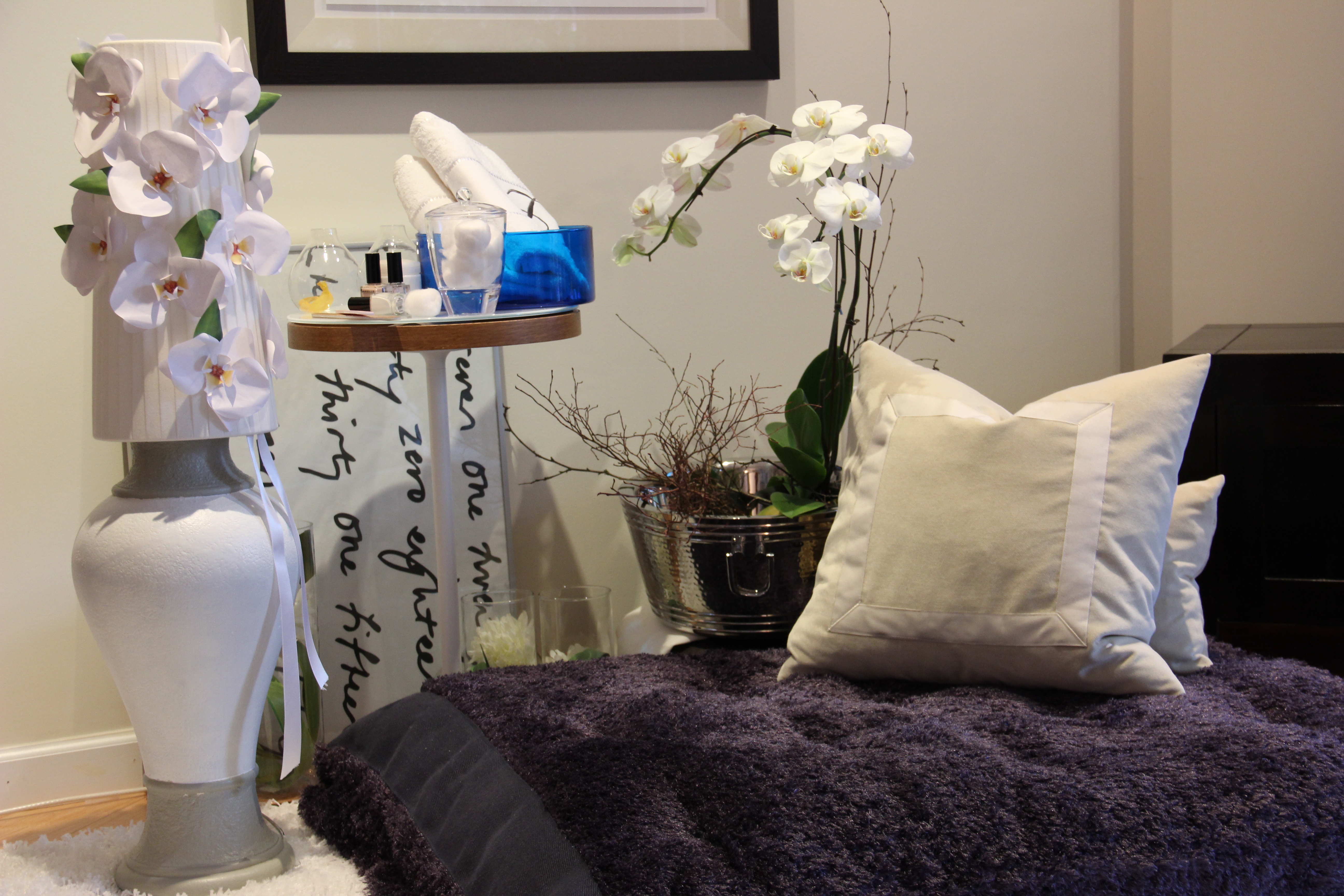 For that “spa feeling look” that I was striving to achieve, I found a template (http://www.ellinee.com/blog/diy-paper-orchid/) for creating these beautiful paper orchids, and luckily I came to find a suitable white lamp shade at my close by Home Sense store.