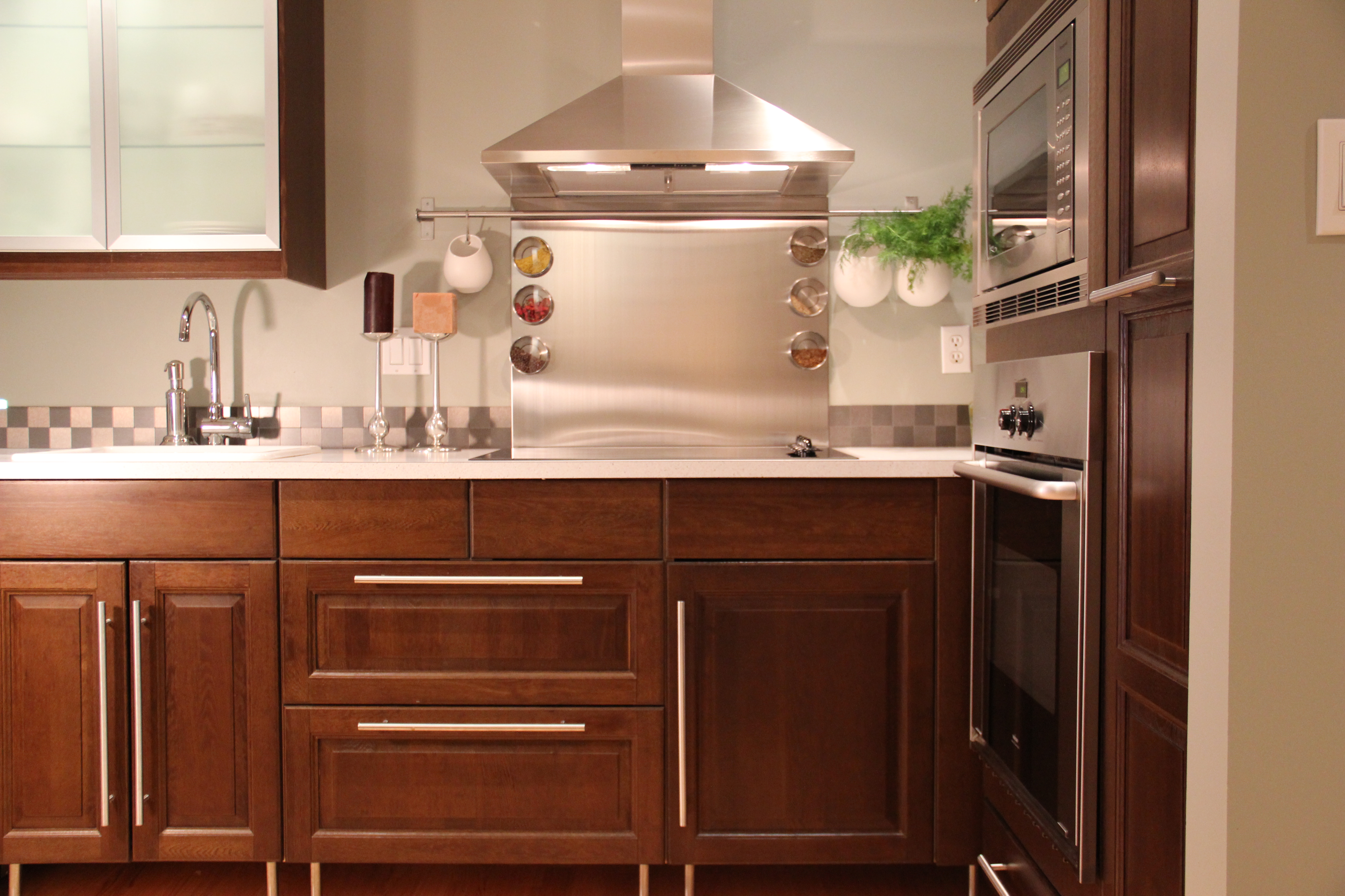Instead of placing upper cabinets all around the walls, I decided to place a stainless steel hood over the cooking range so to ad a more appealing and modern look to the space. I left some spacing in between the wall cabinets and the range hood, and I think that, visually, it worked quite well.