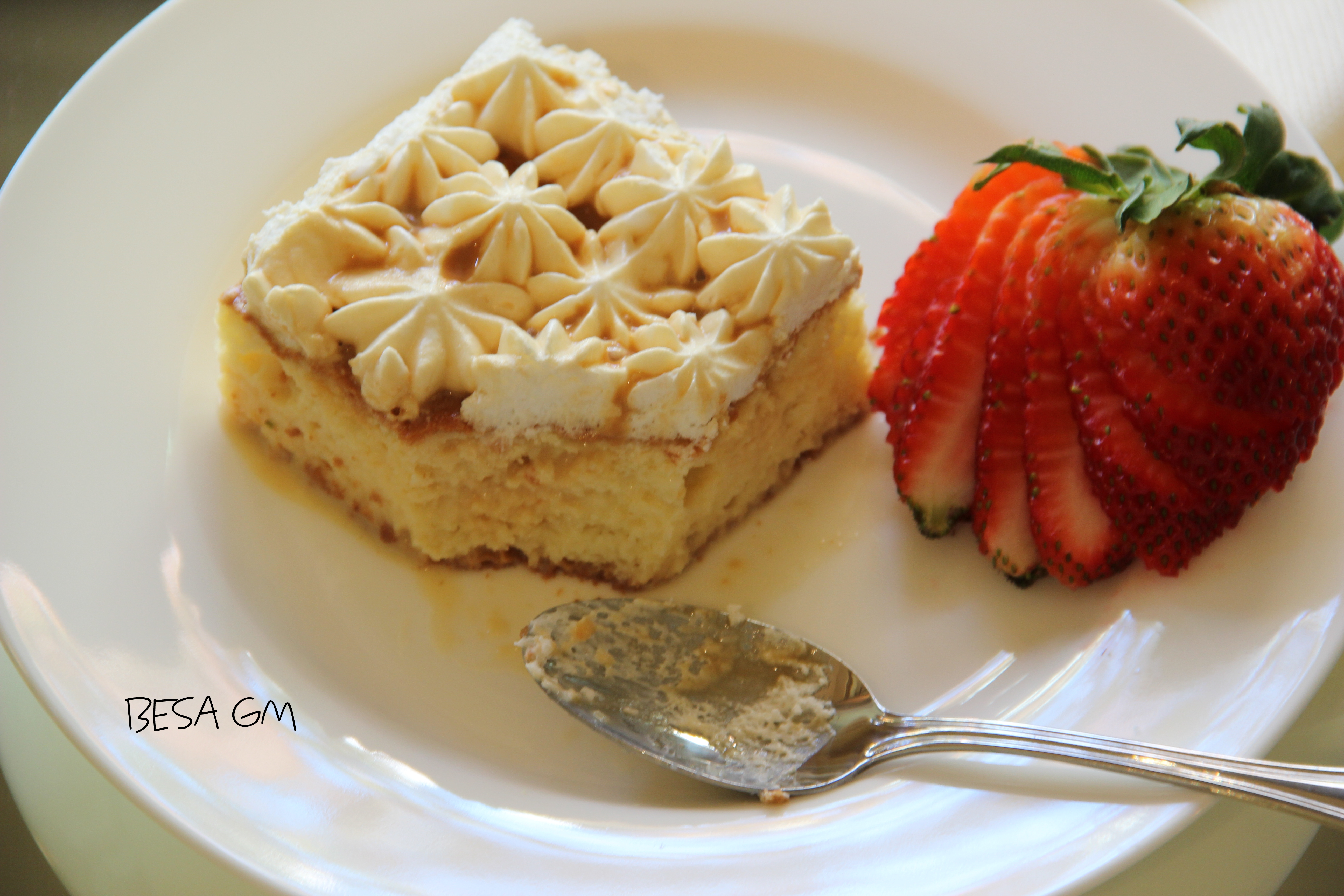 Lately, this recipe has become extremely popular in my home country, so if you are a Tres Leches fun you will find the “TRE LEQE” cake everywhere over there: in restaurants as a desert; in coffee shops; bakeries; supermarkets, and even in grocery stores. If you happen to be invited as a guest or if you are paying a simple short visit to someone over there, be prepared that most likely you will be served with the “tre leqe”, because this cake has currently reached its popularity peak and has become the “cake to be served” kind of cake.