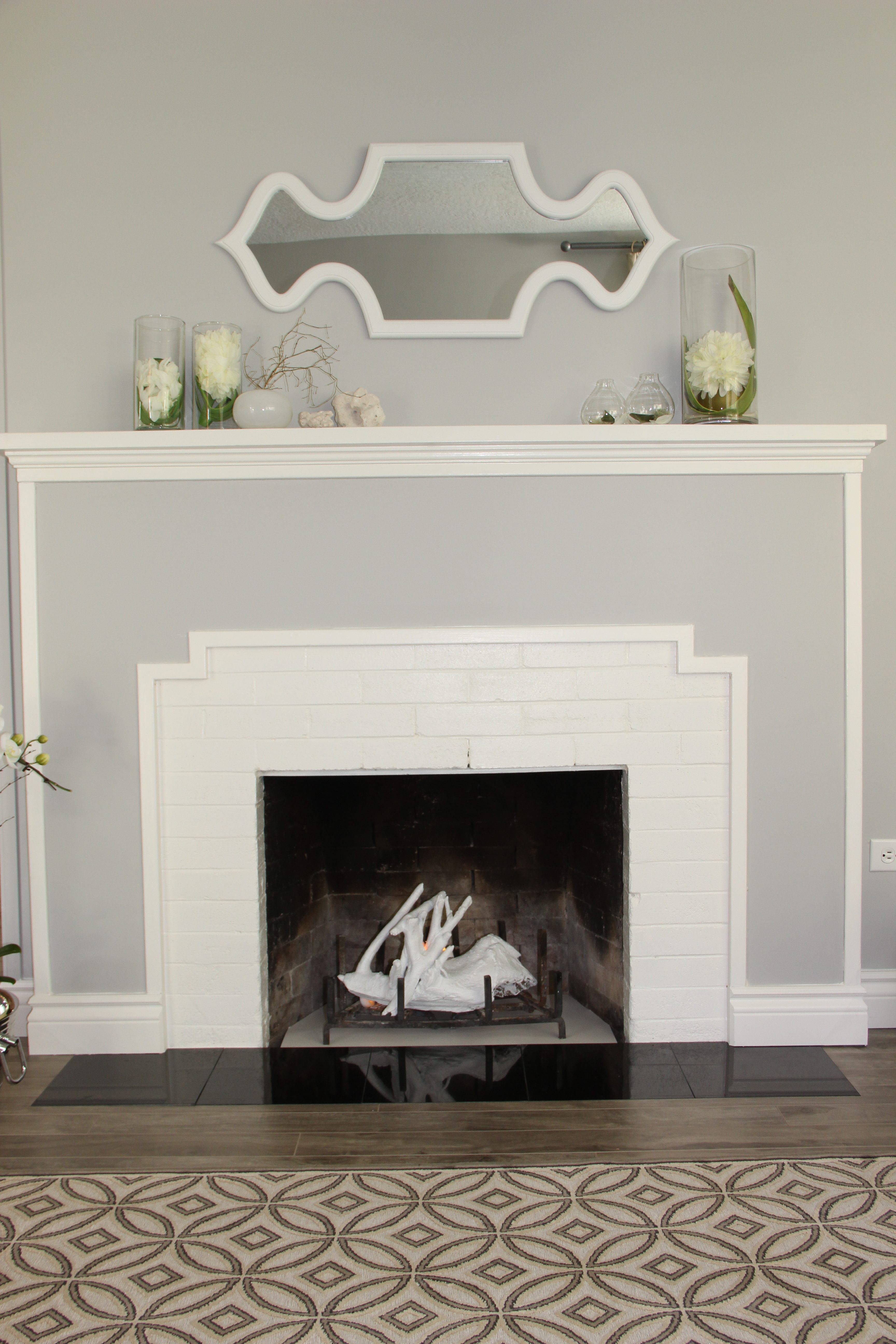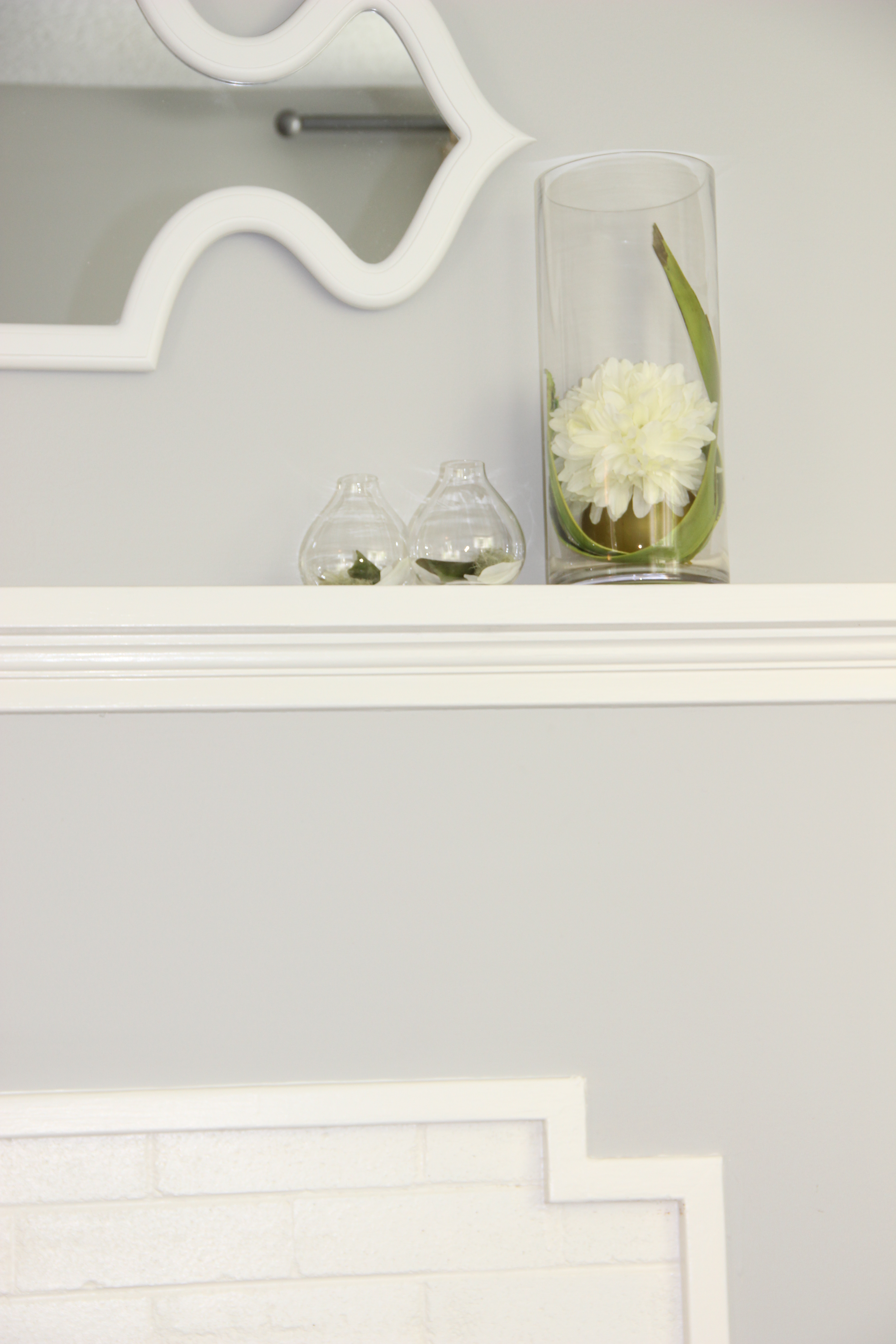 I painted the frame in white so it would nicely blend with the fireplace trim. For the decor I used these glass vases which I already had them from last year. I filled them each with silk white flower and added some greenery for color. Fresh cut flowers, such as white hydrangeas blossoms would suit better, but I just did not have them at the time of creating this design. Adjacent the large glass vase I placed two small oval shaped laboratory glasses from CB2. To add color, I also placed some moss and dried rhododendron leaves in those tiny ones.I also added a white round shaped glass vase from Ikea and two beach rocks collected in one of our recent vacations.
