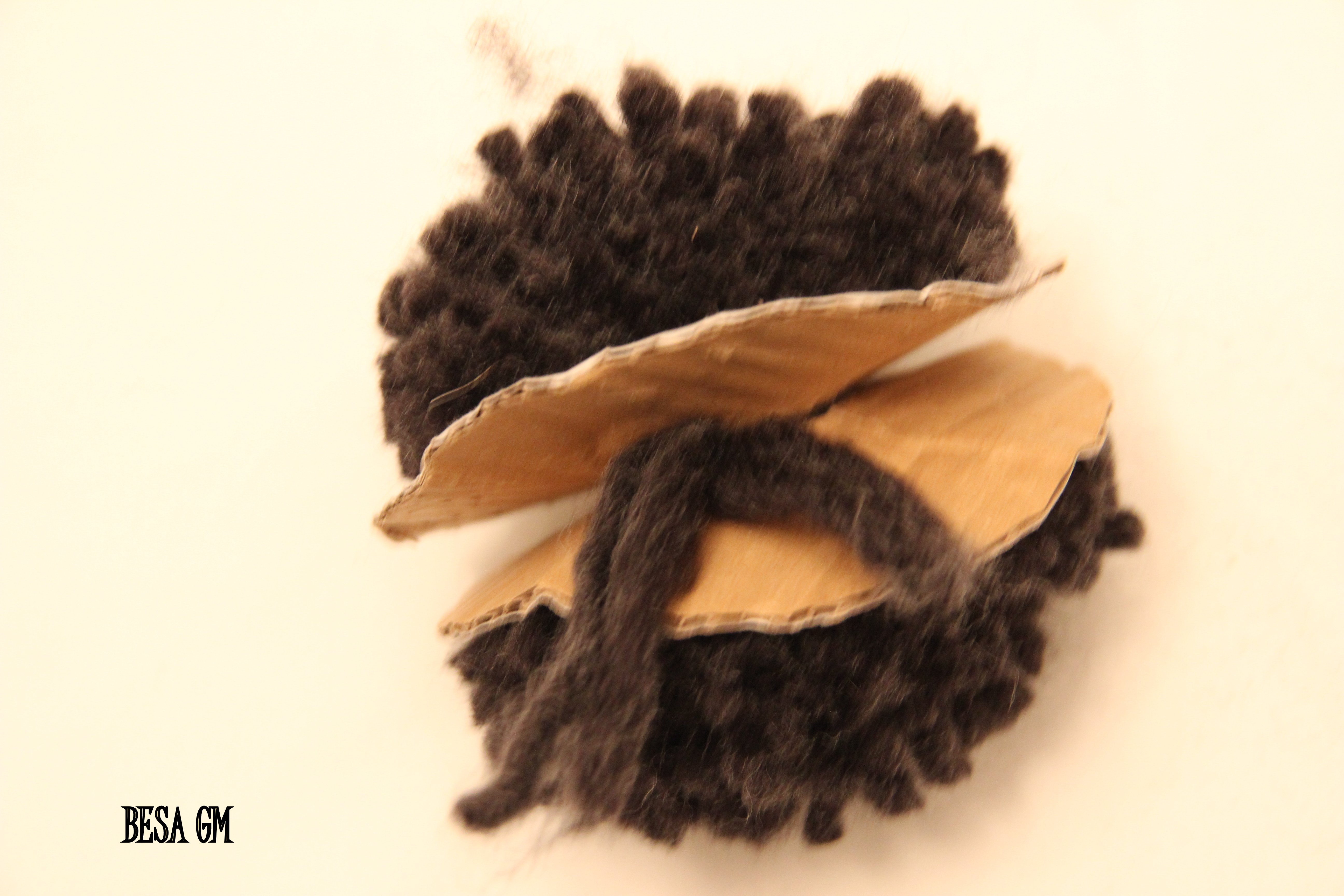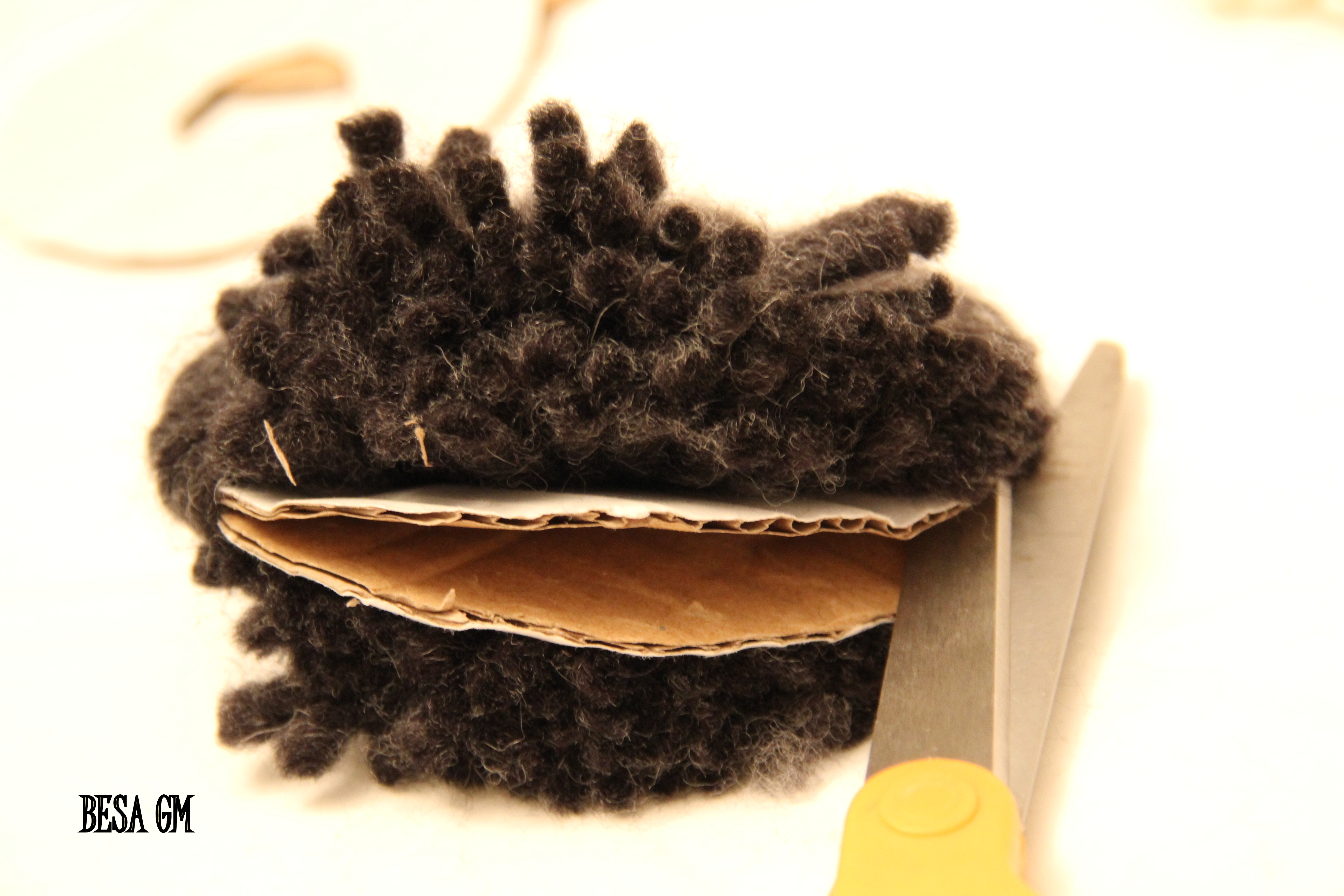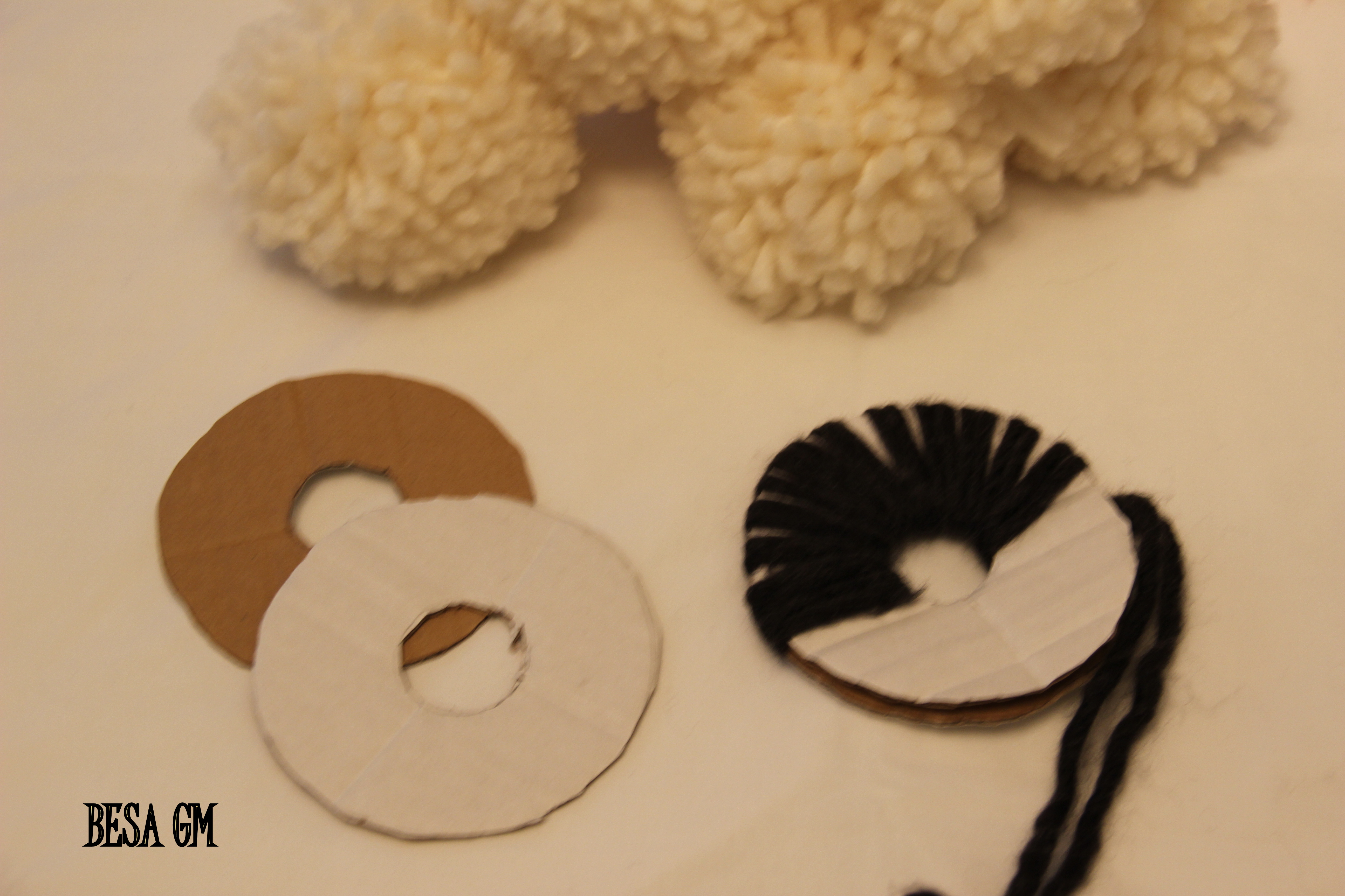 To create pompoms I made 2 cardboard rings (3 inches in diameter) as shown below. I started wrapping the yearn around the ring about several times until I wrapped about 18 yards (for each pom).