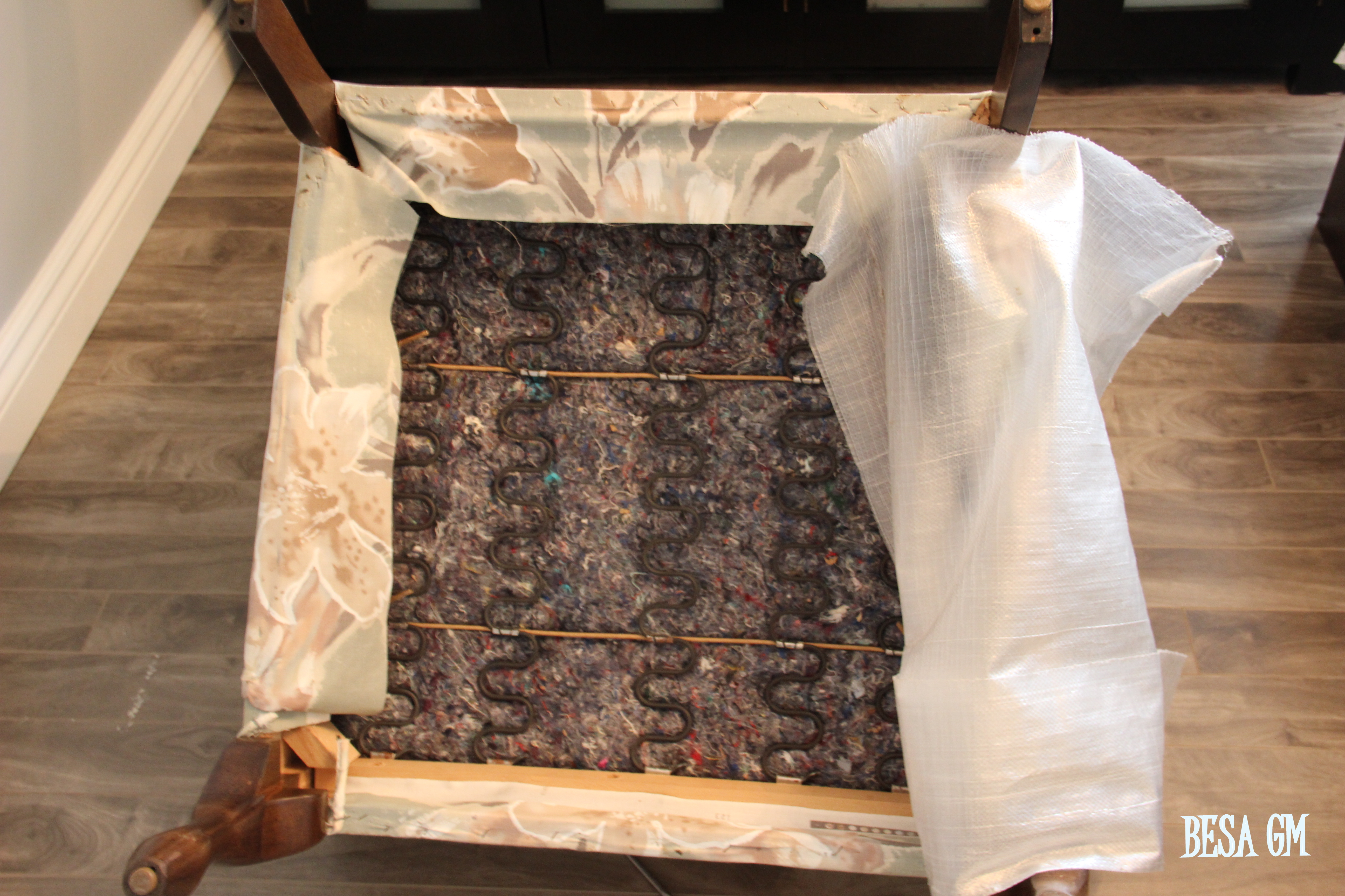I started with stripping off the fabric from the chair. Where to start? You start there where the staples are visible. In my chair the staples were visible at the bottom of the chair. I started at the bottom, and then I removed the back of the chair.