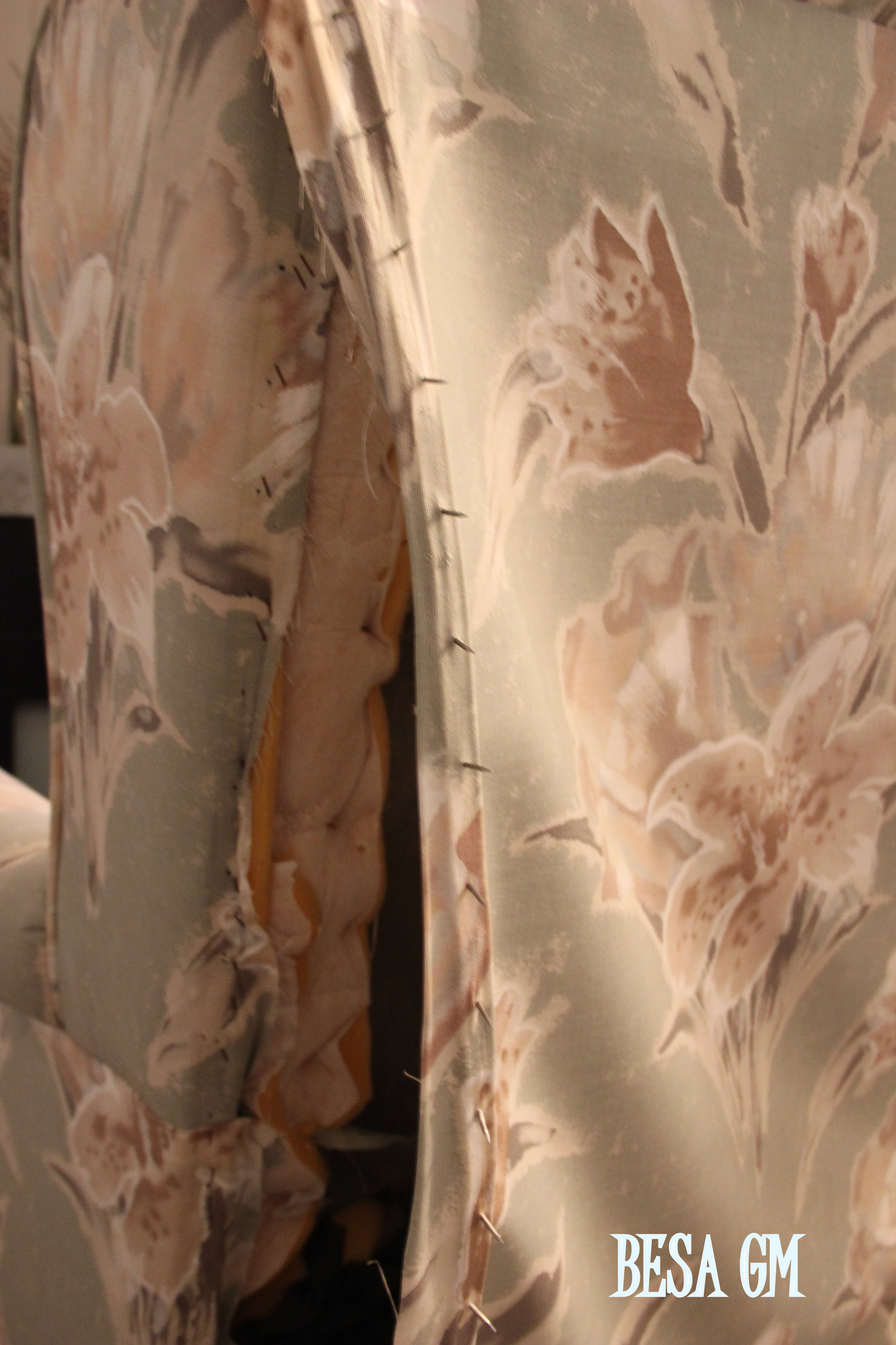 Pulling the fabric while stapling is very important, as you will get a tight and nice professional finish. My fabric was not a thicker one so I found the pulling part quite challenging in a way. Another challenge was the fabric repeat pattern. The repeat was every meeter, so considering that I only had five meters (very small amount considering the wide repeat) I had to be extra careful with the pattern placement without jeopardizing the overall design.