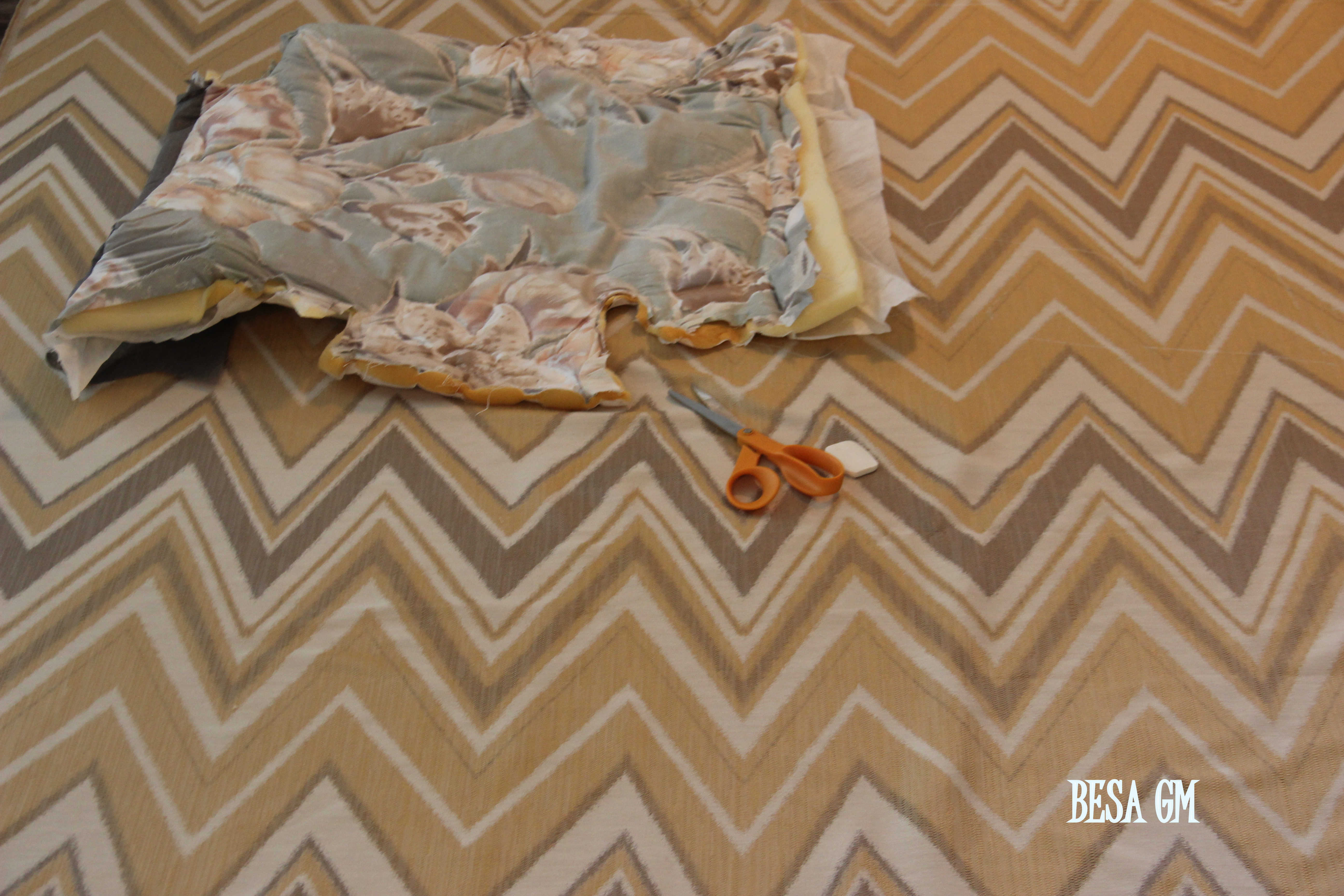 I laid the fabric for cutting, and considering that I had to work around the fabric repeat pattern I had to cut one piece at a time. First I chose which part of the design I wanted to appear on the back of the chair, ( grey zig zag line) and then worked around that design.