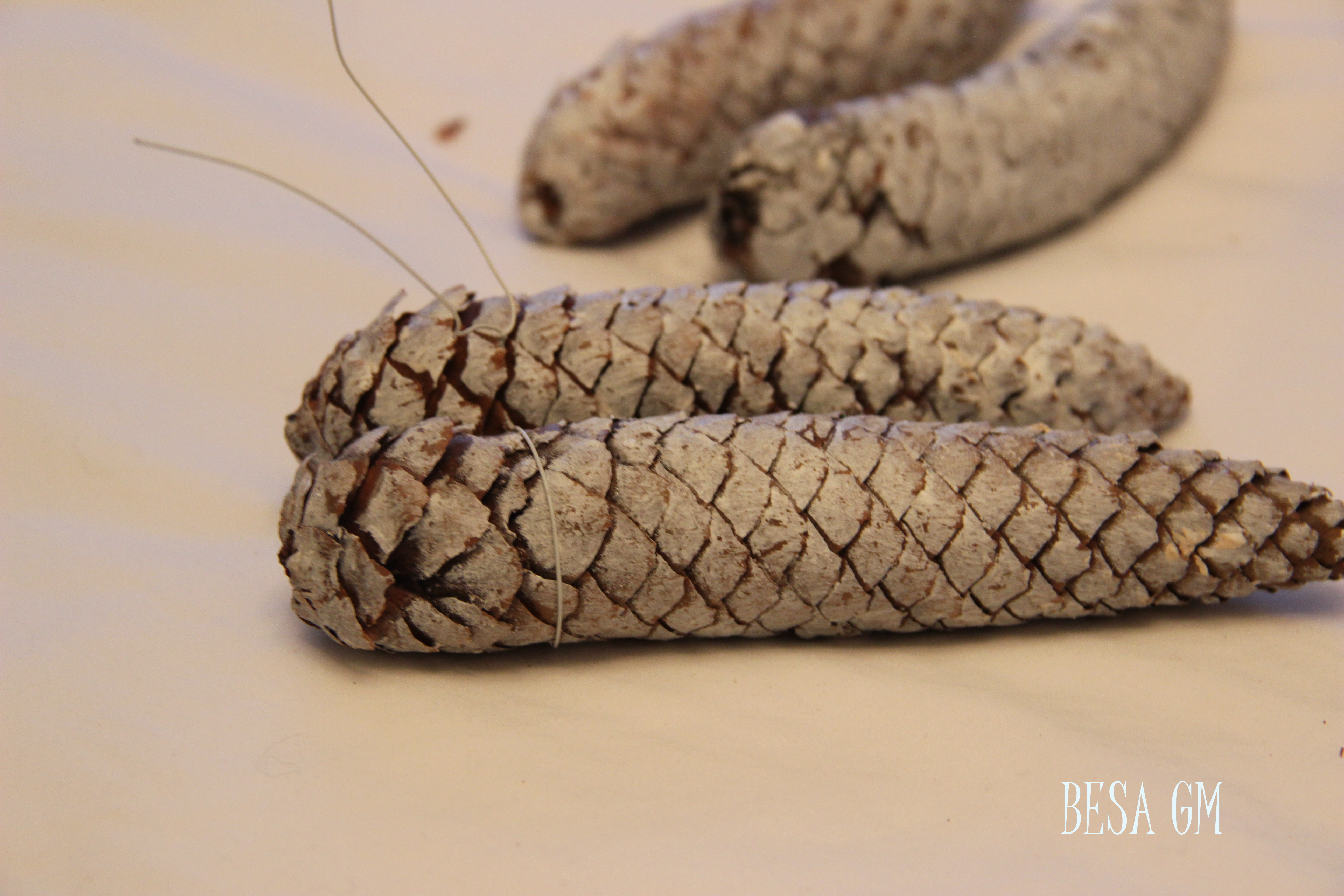 Using wire, I tied a set of two white painted pine cones and attached several sets on the wreath.