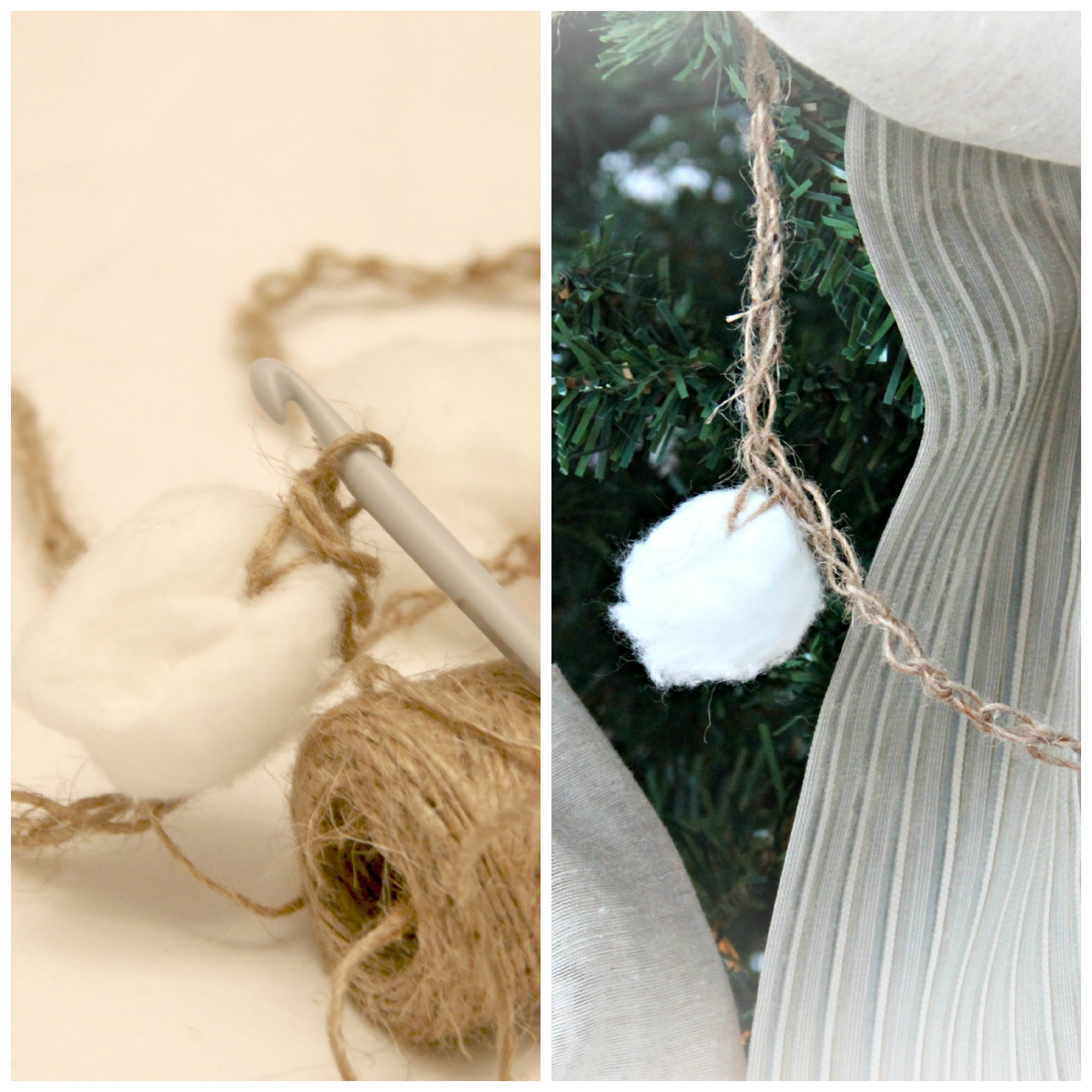 I handmade this very simple, yet beautiful, garland using natural materials: twine and cotton balls. Using a crochet needle I made chain loops and added a cotton ball on every 12 inch distance. The garland added an organic feel to the tree decor.