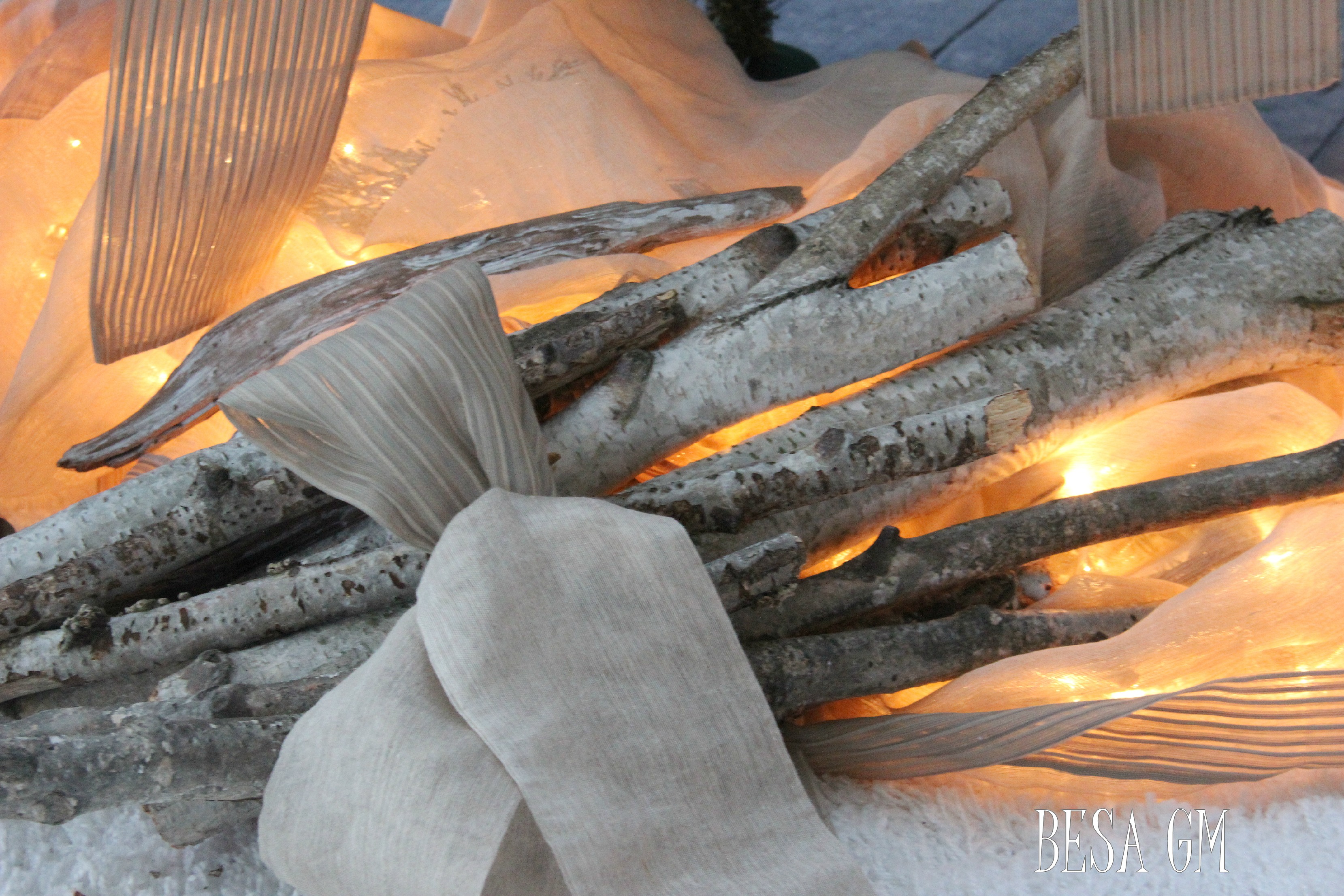 For further styling of the tree corner, I used eco friendly led Christmas lights, and few thick branches of a birch tree. I collected these branches this fall when a huge branch fell onto our yard.