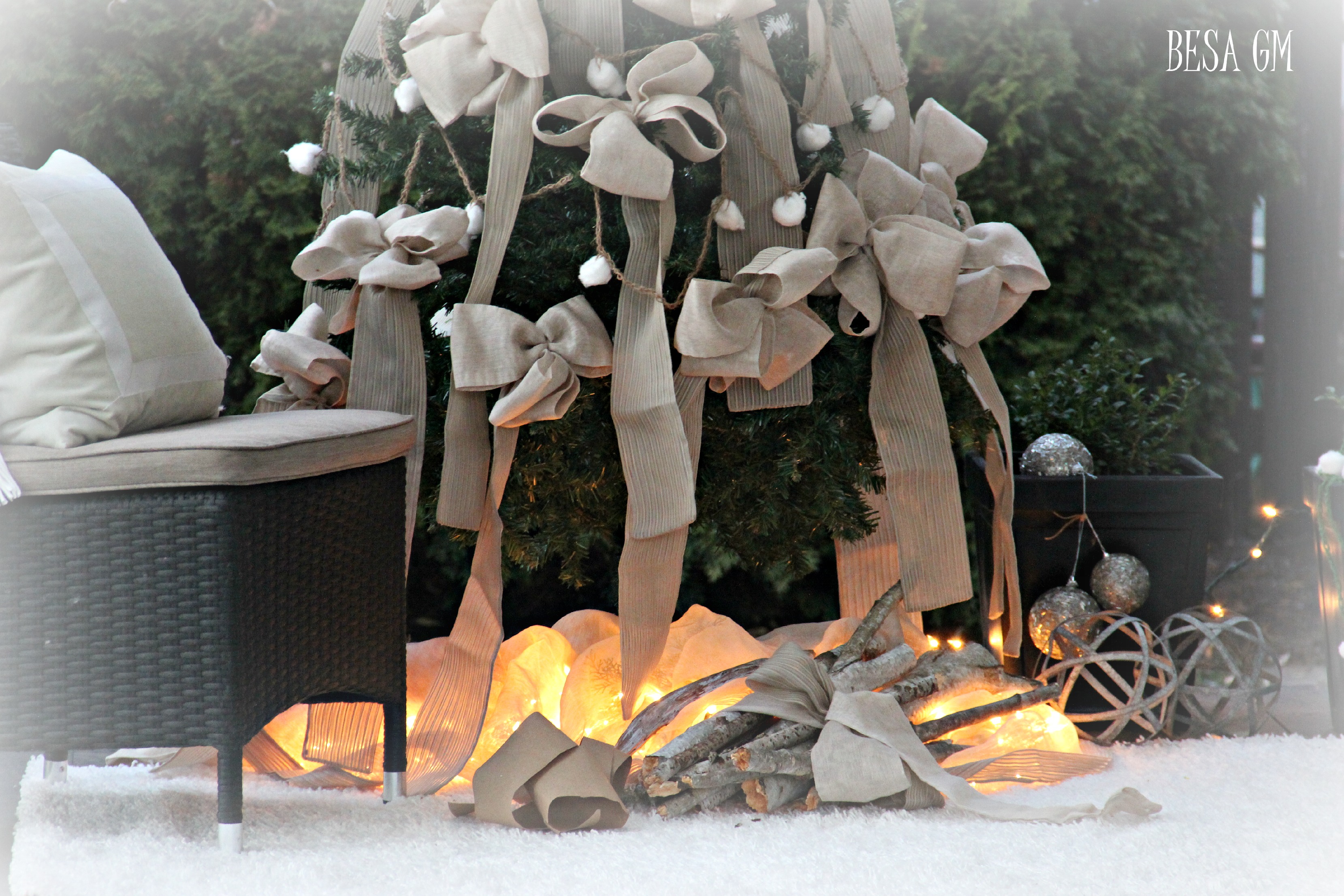 I have donated almost all tree ornaments, and I am not buying new ones. Instead, I made these giant natural color bows from the repurposed material. Each of these pieces used to create these bows served as “a slipcover” for plastic vertical blinds in my condo. Some of you may giggle and call me crazy, but yes, I did make sheer slipcovers for those ugly plastic vertical blinds.