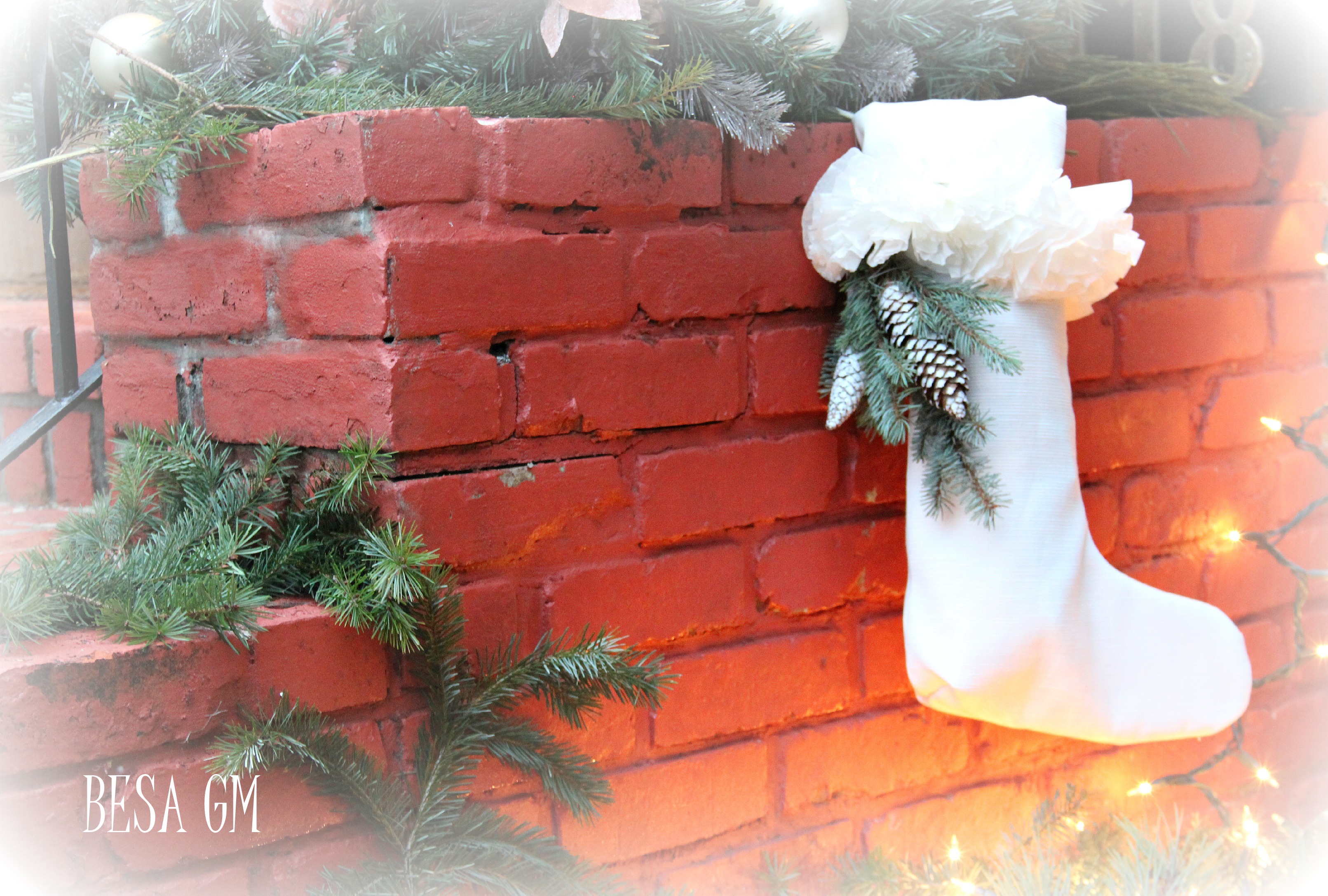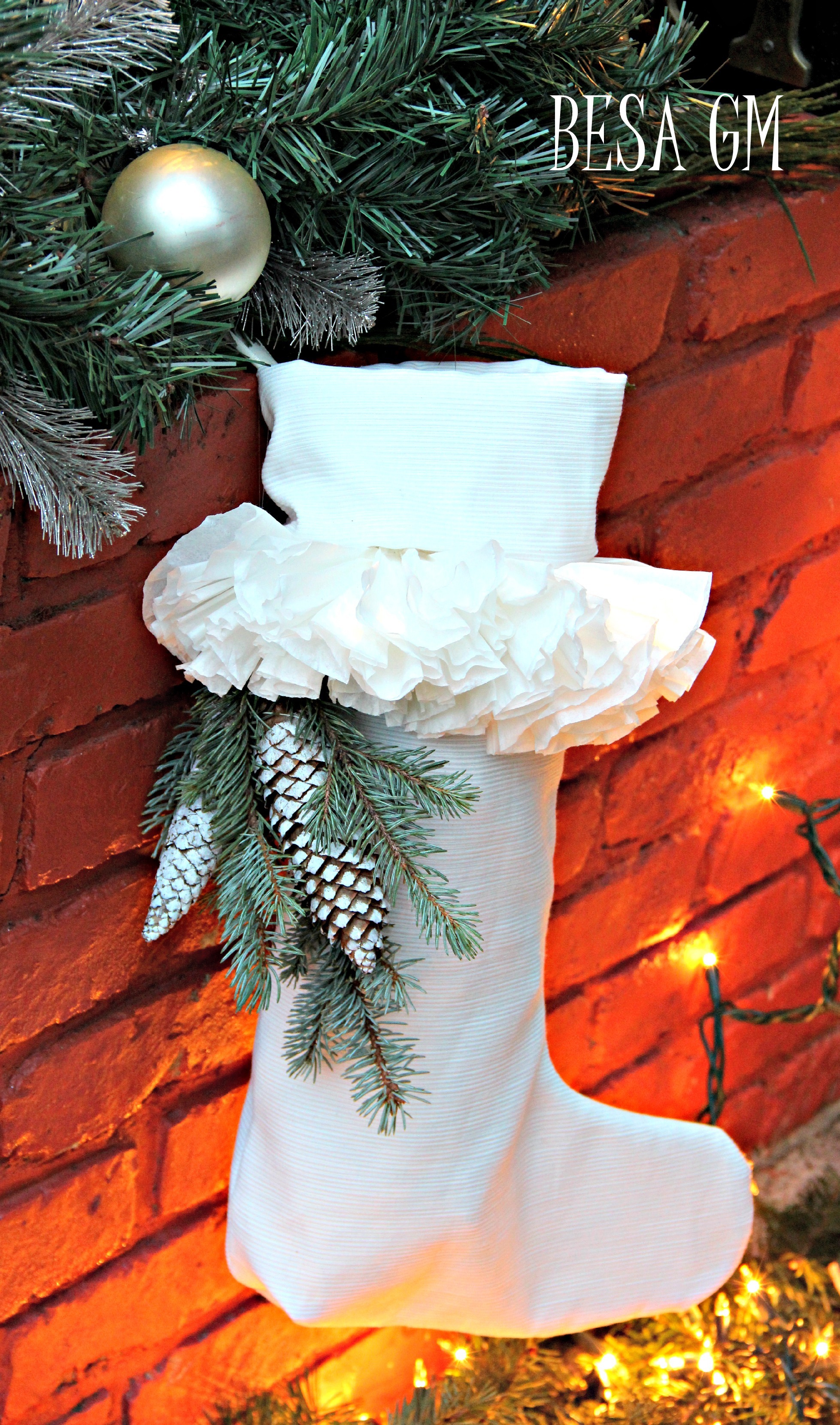After cutting, I placed the cut stockings right sides together. I stitched around edges, leaving top open. I made a triangle stitch at the stocking heal to enhance the heal portion for a more natural look. Then, I turned stocking right side out. Four inches below the stocking top, I aded ruffles made out of coffee filters which were left overs from my previous coffee filter wall art project.