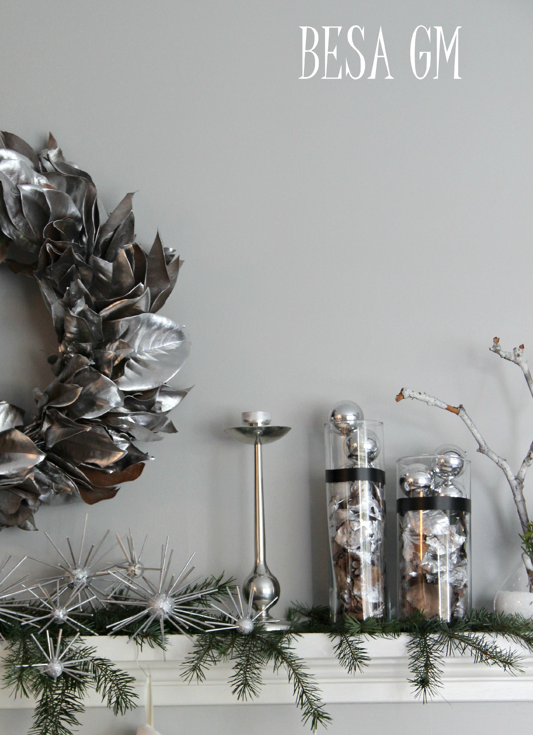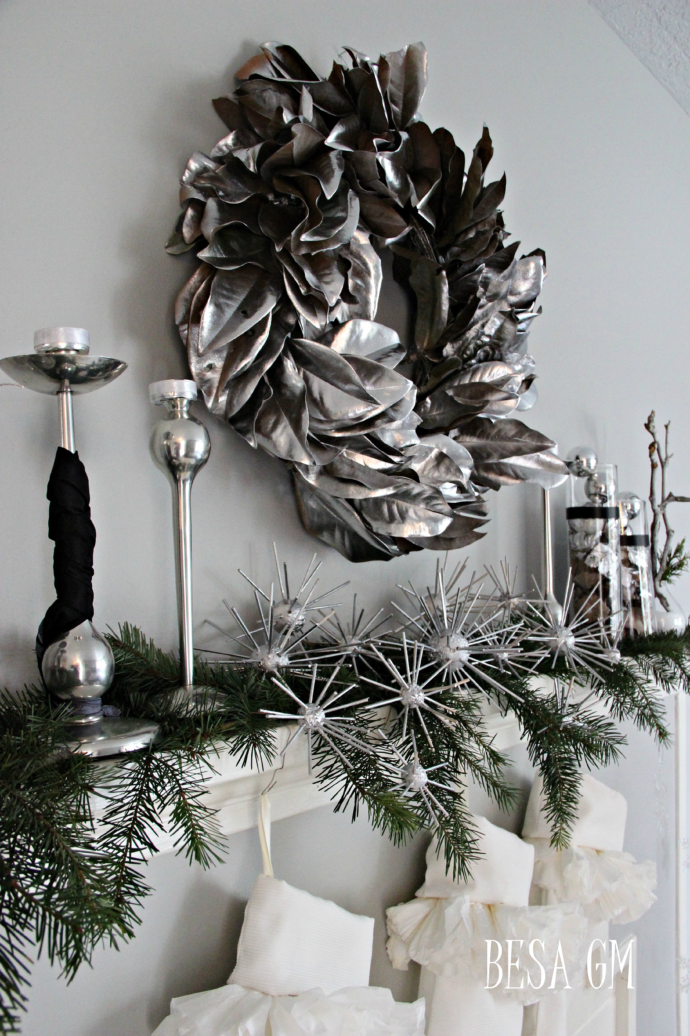 Above the mantel I placed the Magnolia Wreath spray painted in silver, so this way I created a tone-on-tone decor using all shades of silver.