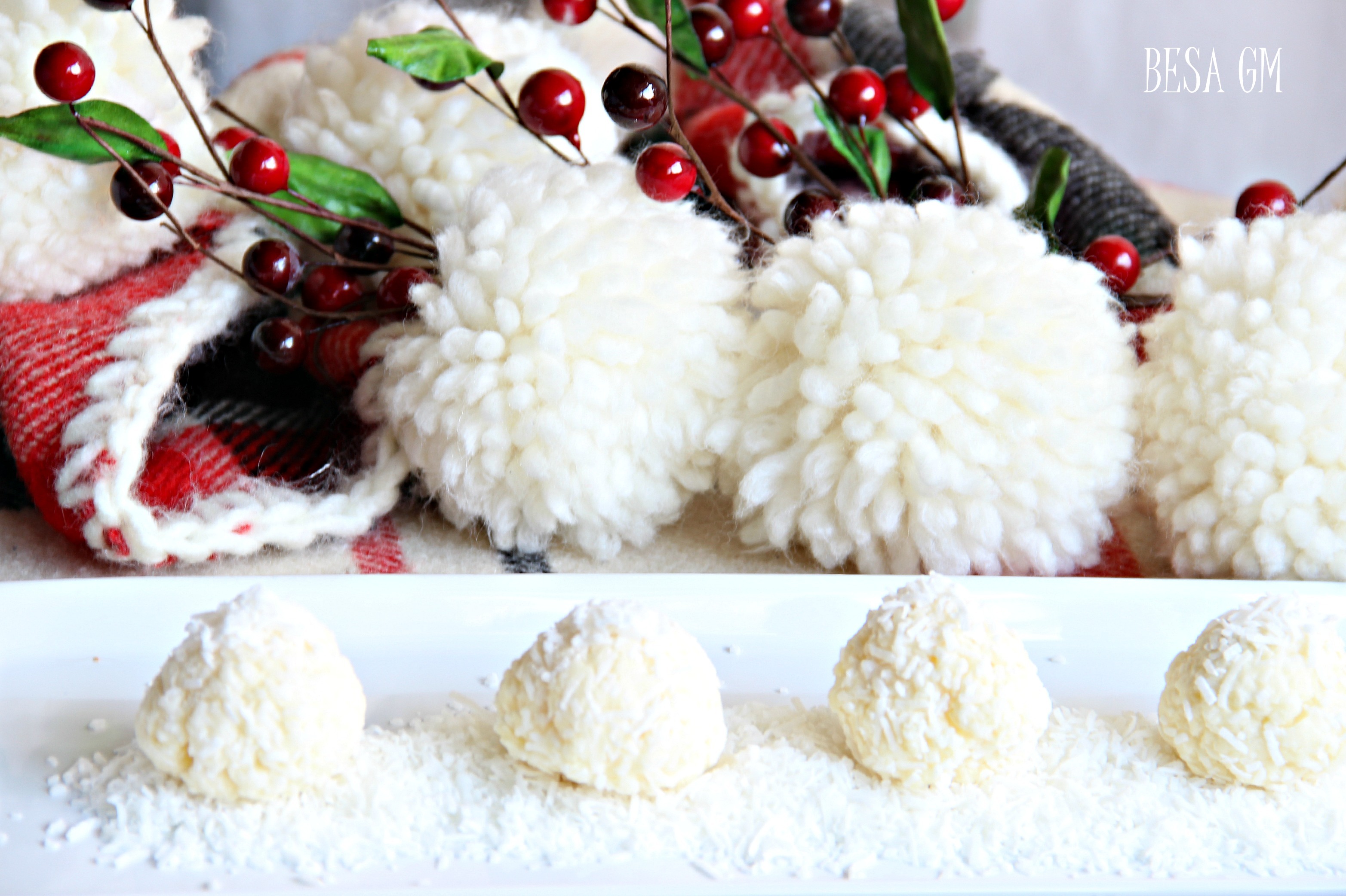 Qumeshti i kondenzuar, qumeshti pluhur dhe gjalpa perzihen mire. Mases i shtohen fluskat e kokosit, perzihen mire dhe masa futet ne frigorifer dhe lihet te qendroj aty perafersisht 30 min. Nxjeret nga frigoriferi dhe fillohet perpunimi duke formesuar toptha te vegjel ne madhesi te ares se vogel. Nese masa ngjitet ne duar i shtoni kokos deri sa te behet mase e lehte per perpunim. Ne mes te topthit i fusni nje bajame, dhe e rumbullaksoni topthin perseri duke e kaluar pastaje topthin ne fluska kokosi. I vendosni ne frigorifer dhe i leni te qendrojne aty deri para se ti servoni.