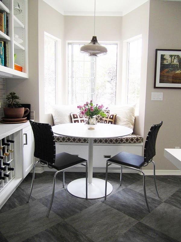 Small bay window space is greately utilized by this small banquette which has added a distinguished, modern look to this rather small kitchen. Another example how banquettes are great solution for small spaces.