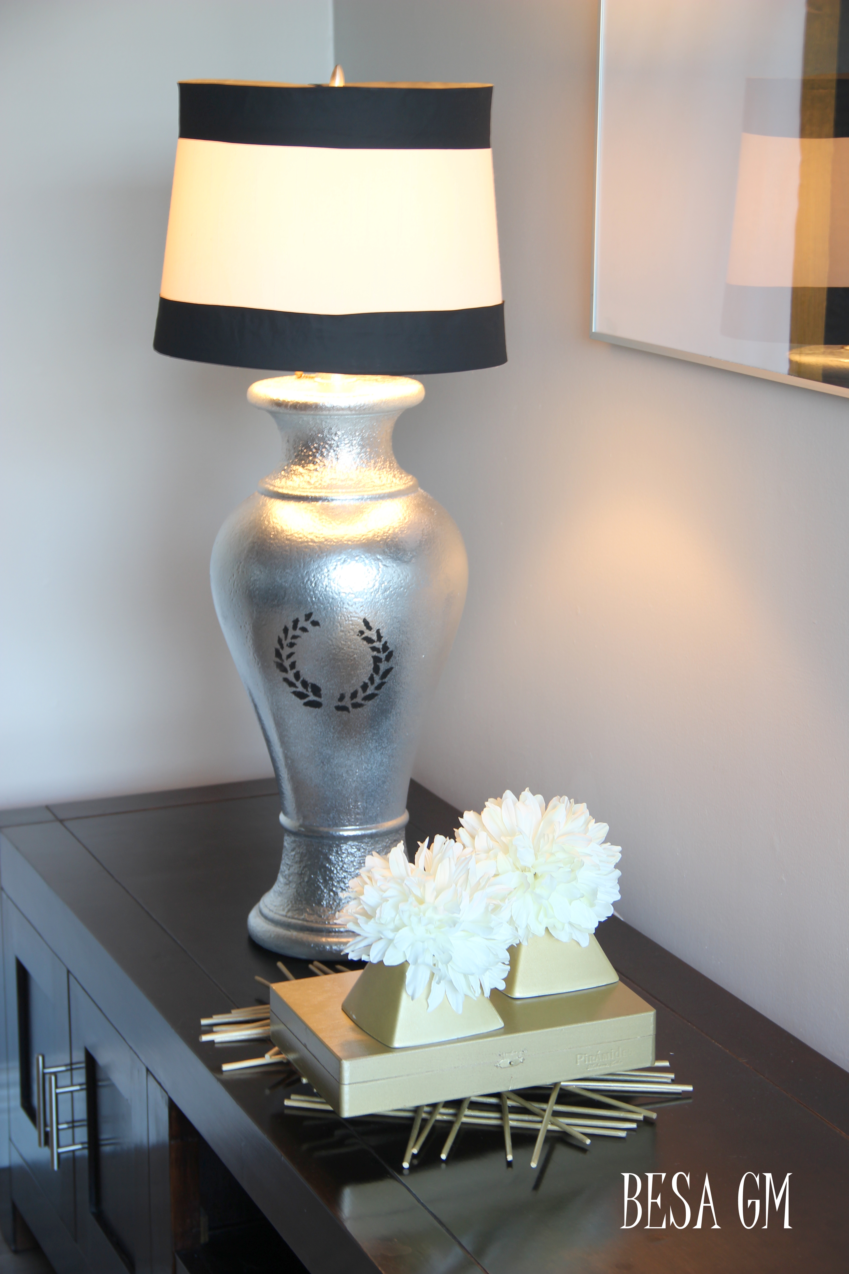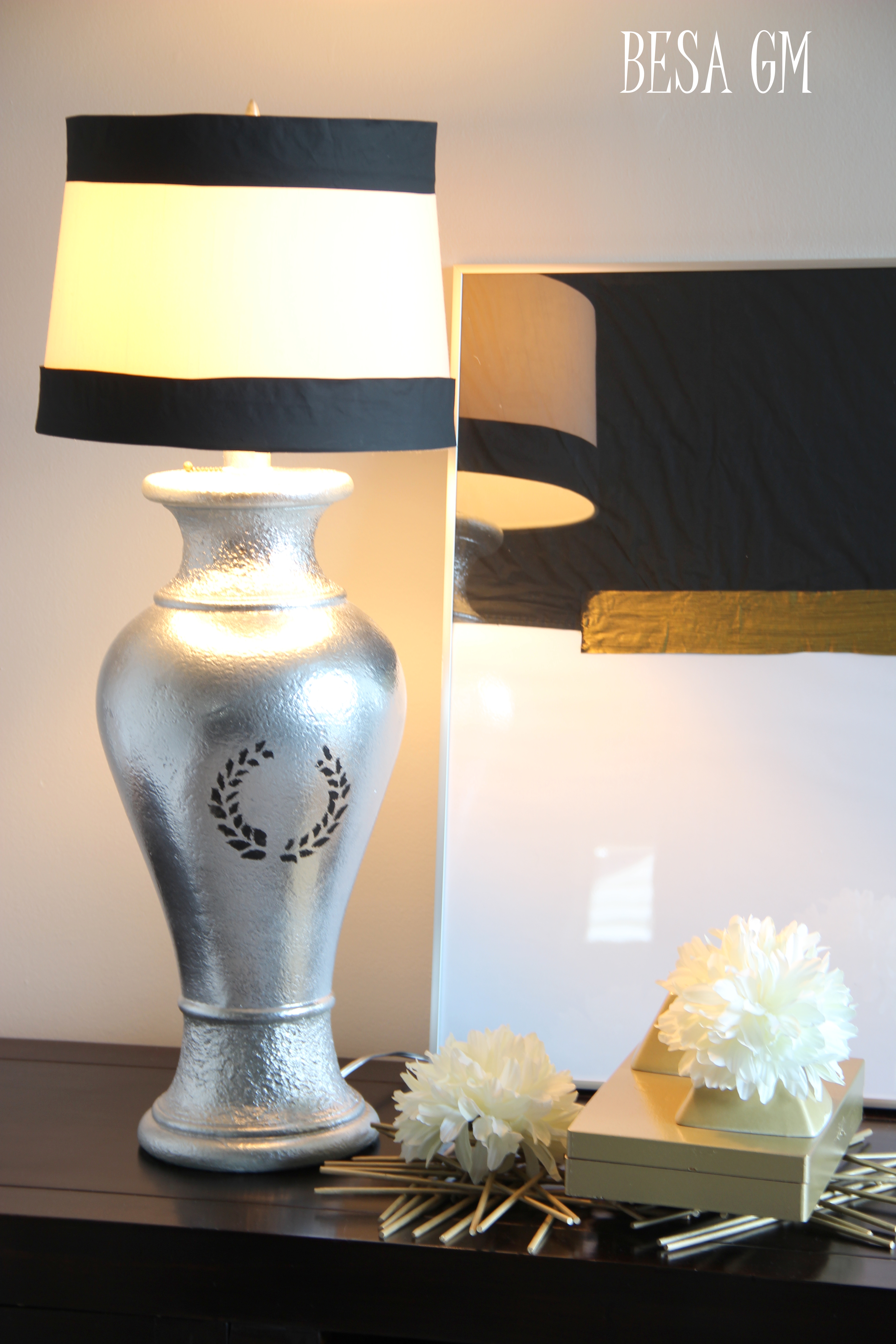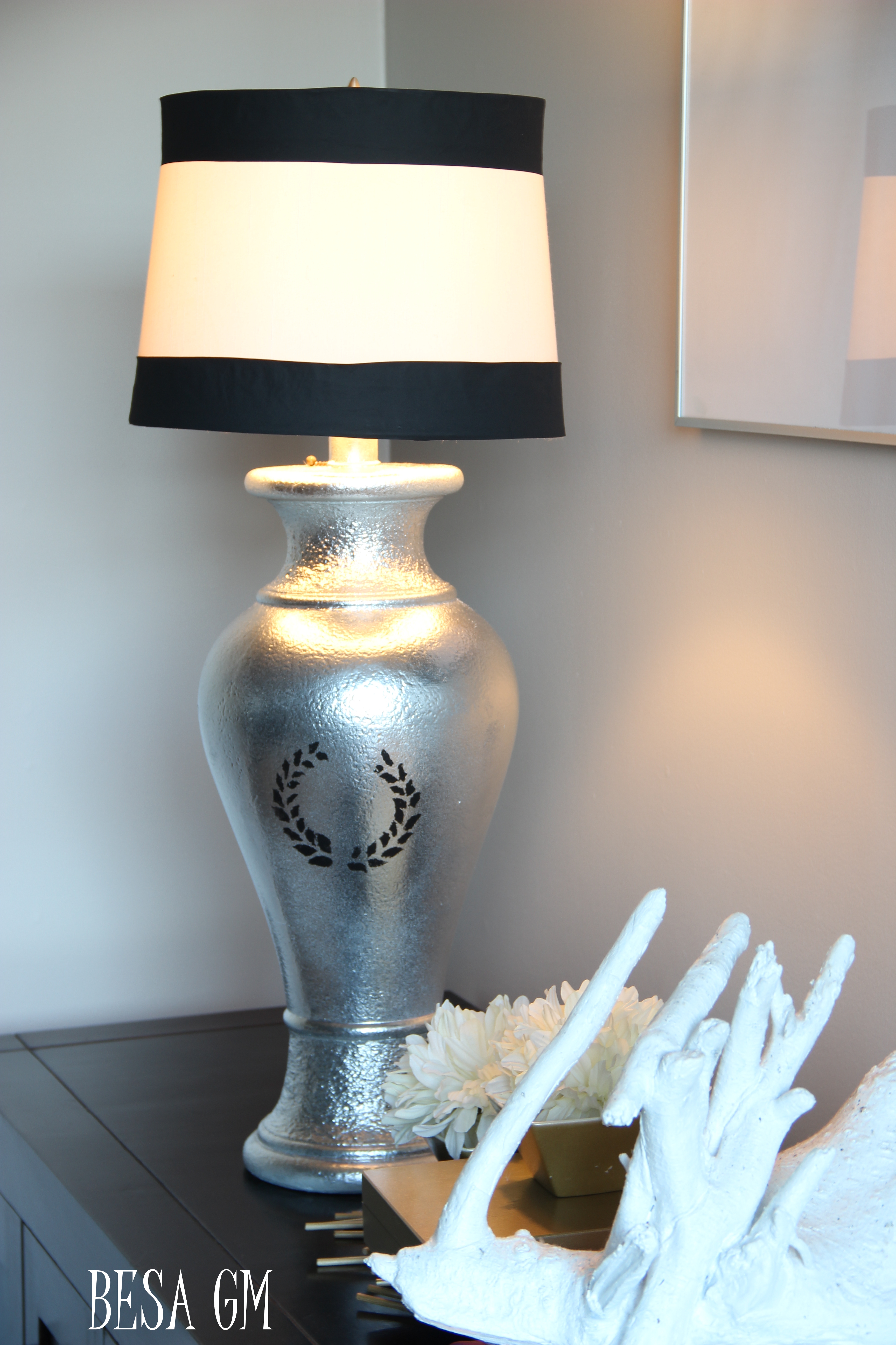 The silver look came partly because I had the silver spray paint “ in stock”. The shade was another item that I already had, so I was only required to come up with the idea of remodeling the shade. Well, considering that I love quick and easy projects I decided that a black 2 inch stripe around the shade’s top and the bottom edge would be quick and easy and would look nice, and it certainly did.