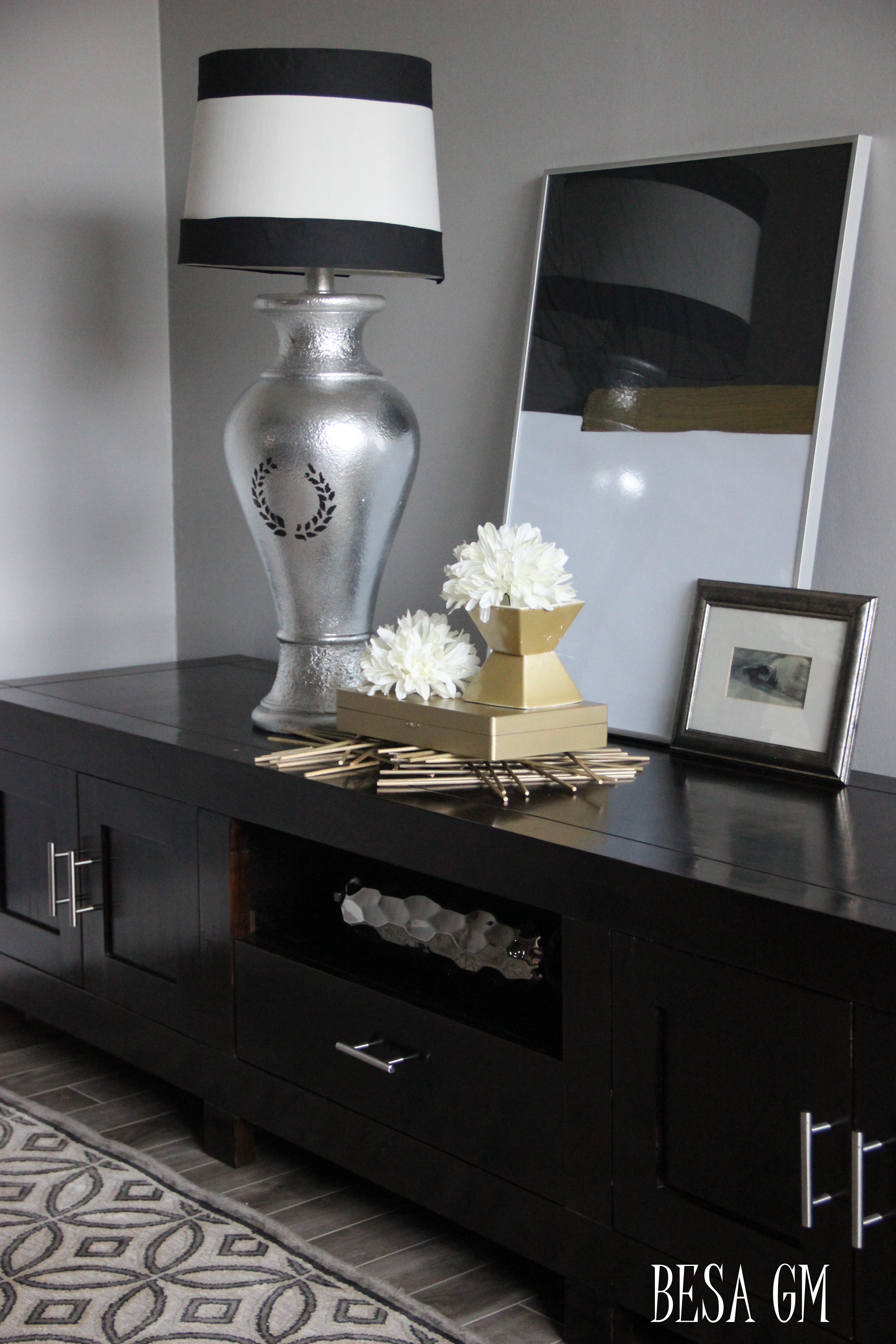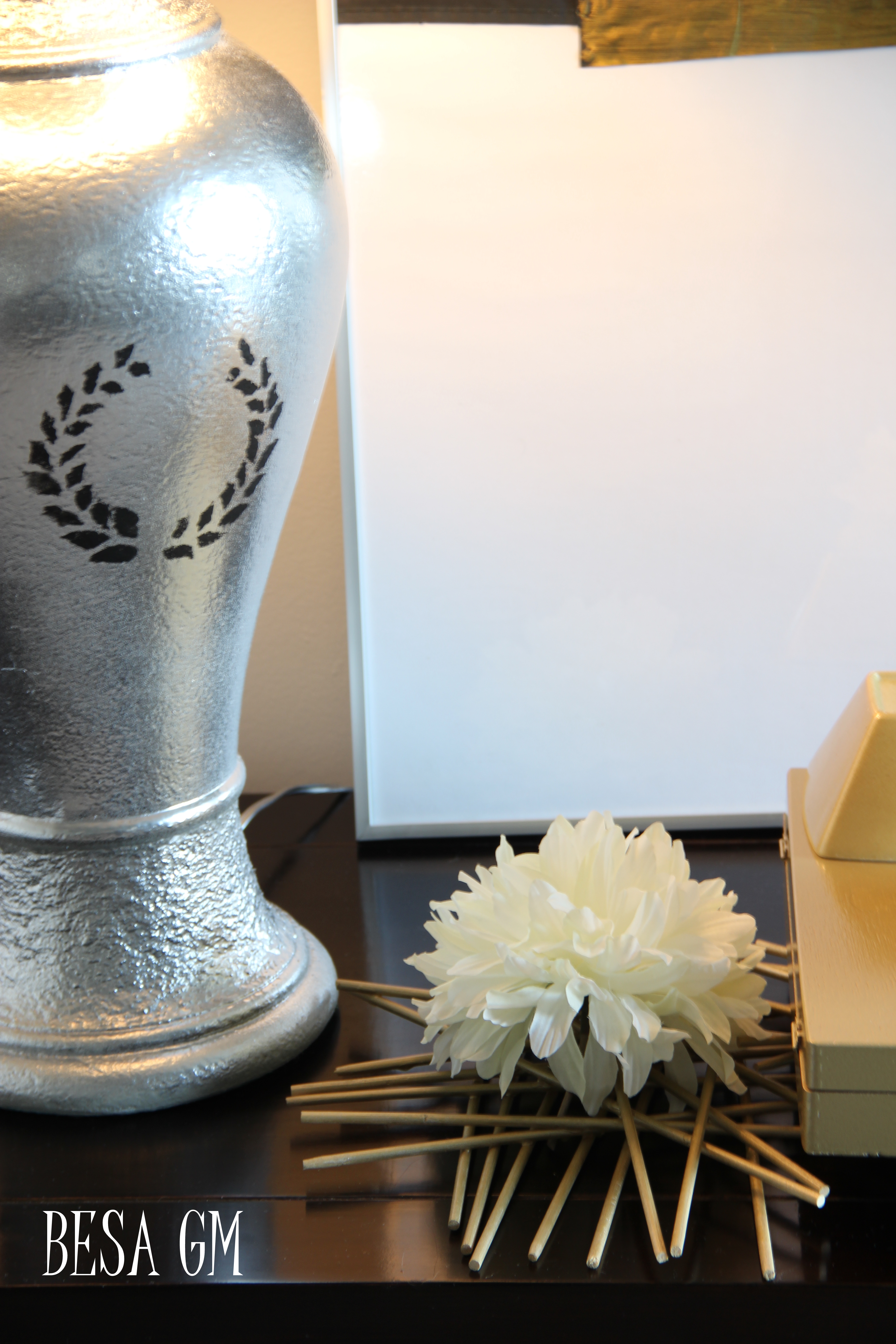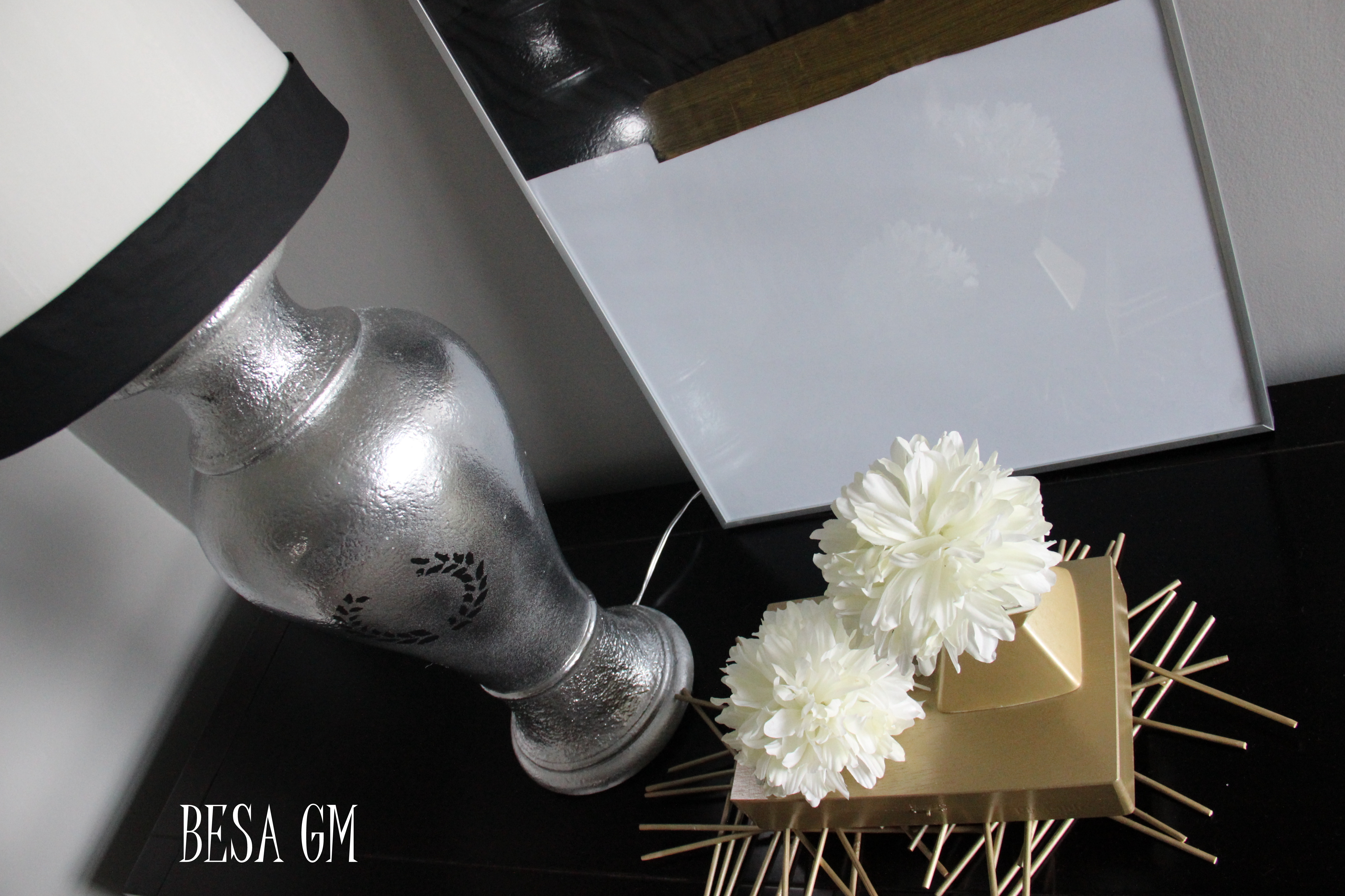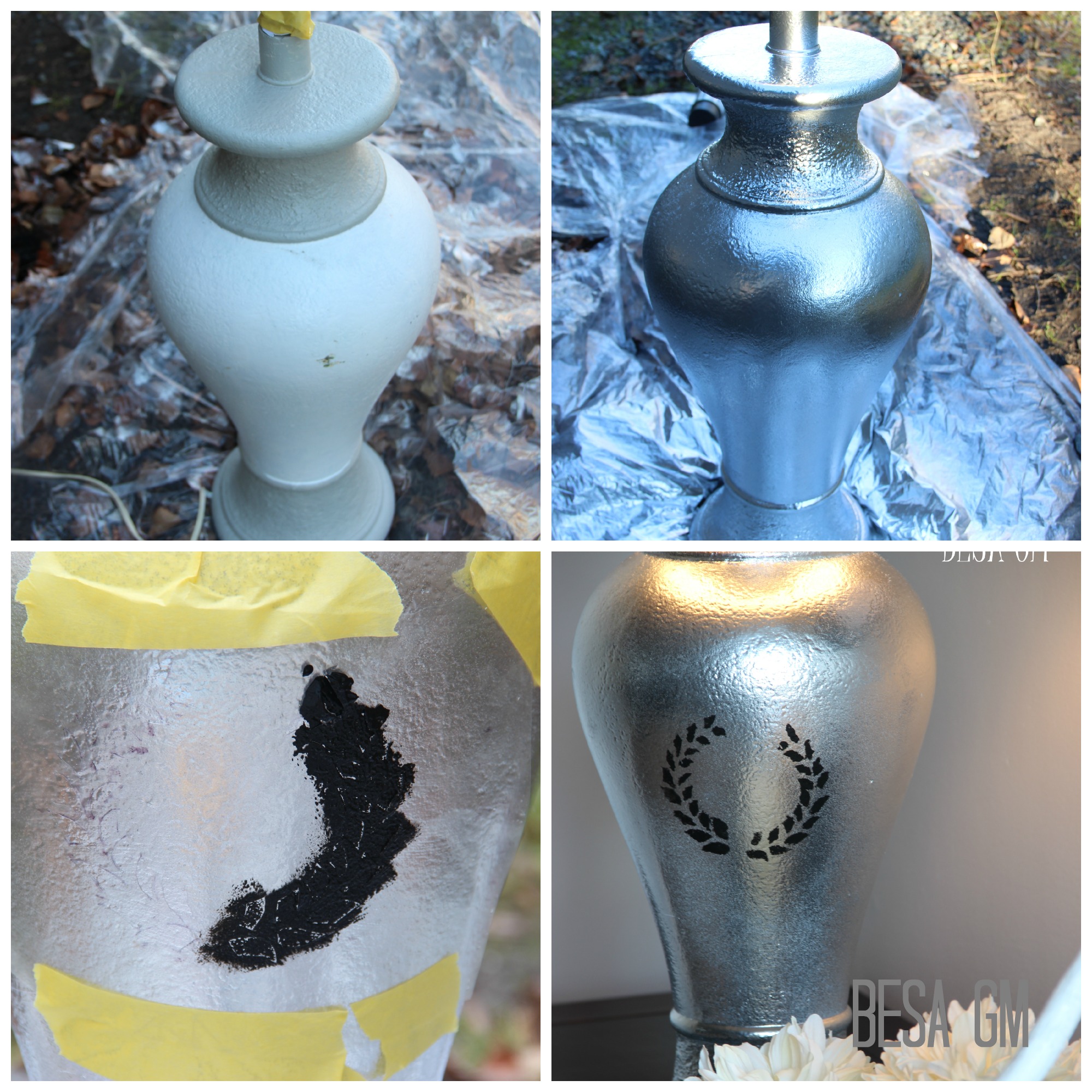 The silver look came partly because I had the silver spray paint “ in stock”. The shade was another item that I already had, so I was only required to come up with the idea of remodeling the shade. Well, considering that I love quick and easy projects I decided that a black 2 inch stripe around the shade’s top and the bottom edge would be quick and easy and would look nice, and it certainly did.