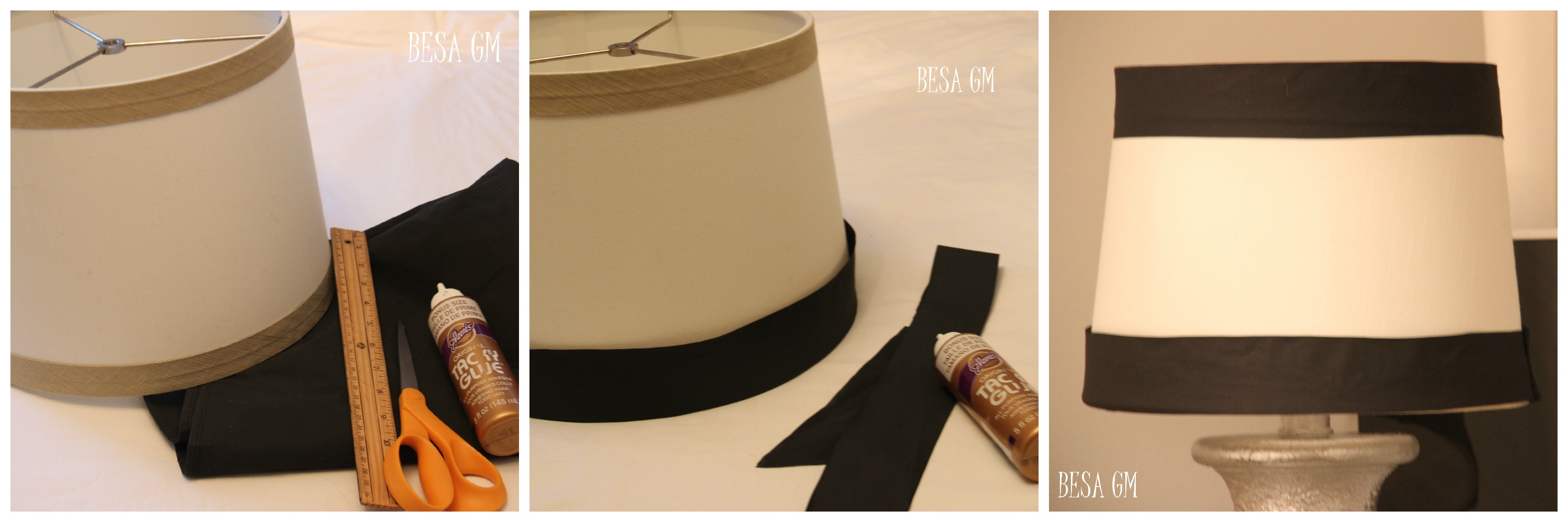 For the shade remodel I used a piece of black vinyl fabric which was cut in 2 inch width stripes, and in a length to fit the perimeter of the top and bottom of the lamp. I glued the stripes to the top and the bottom of the shade using craft glue.