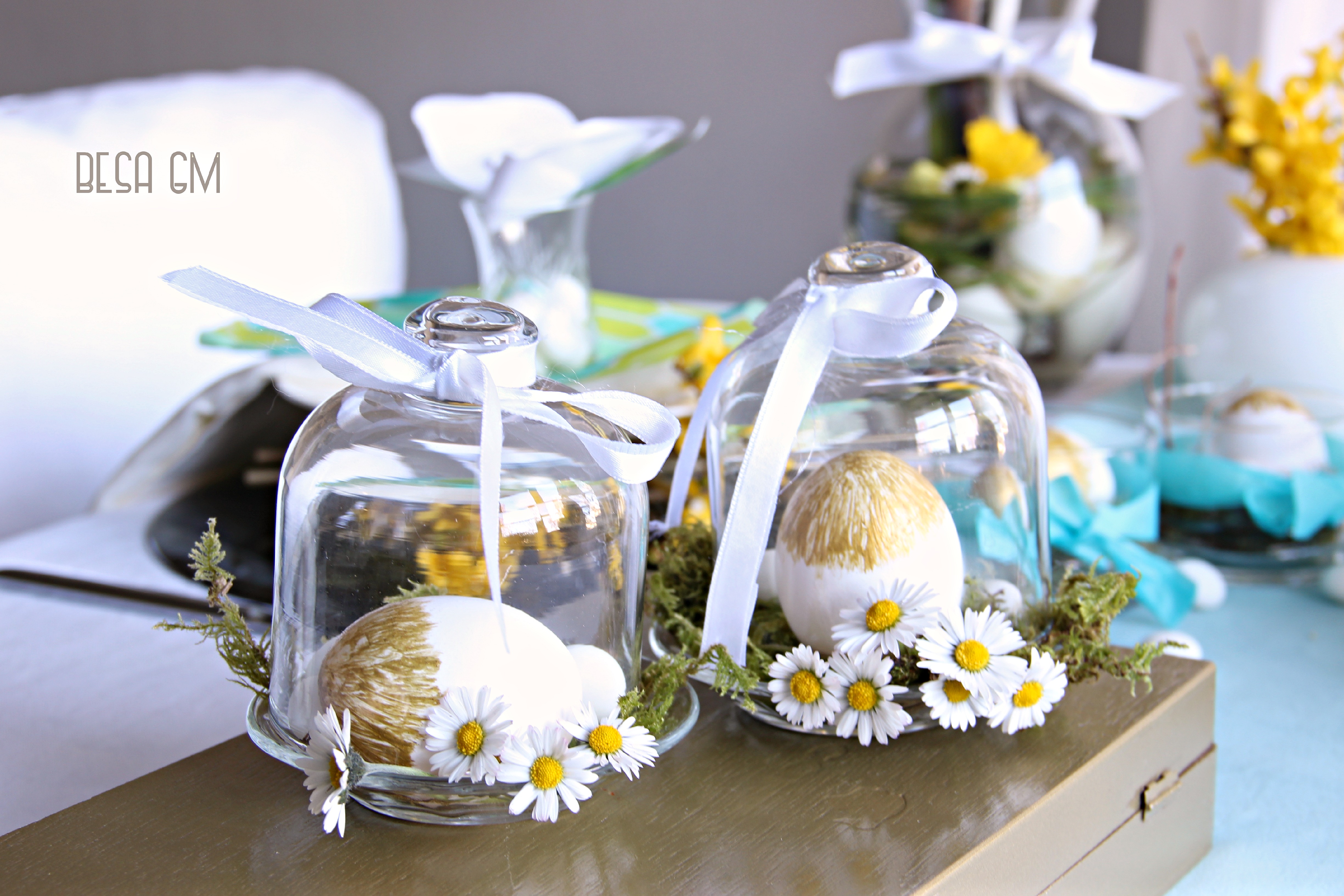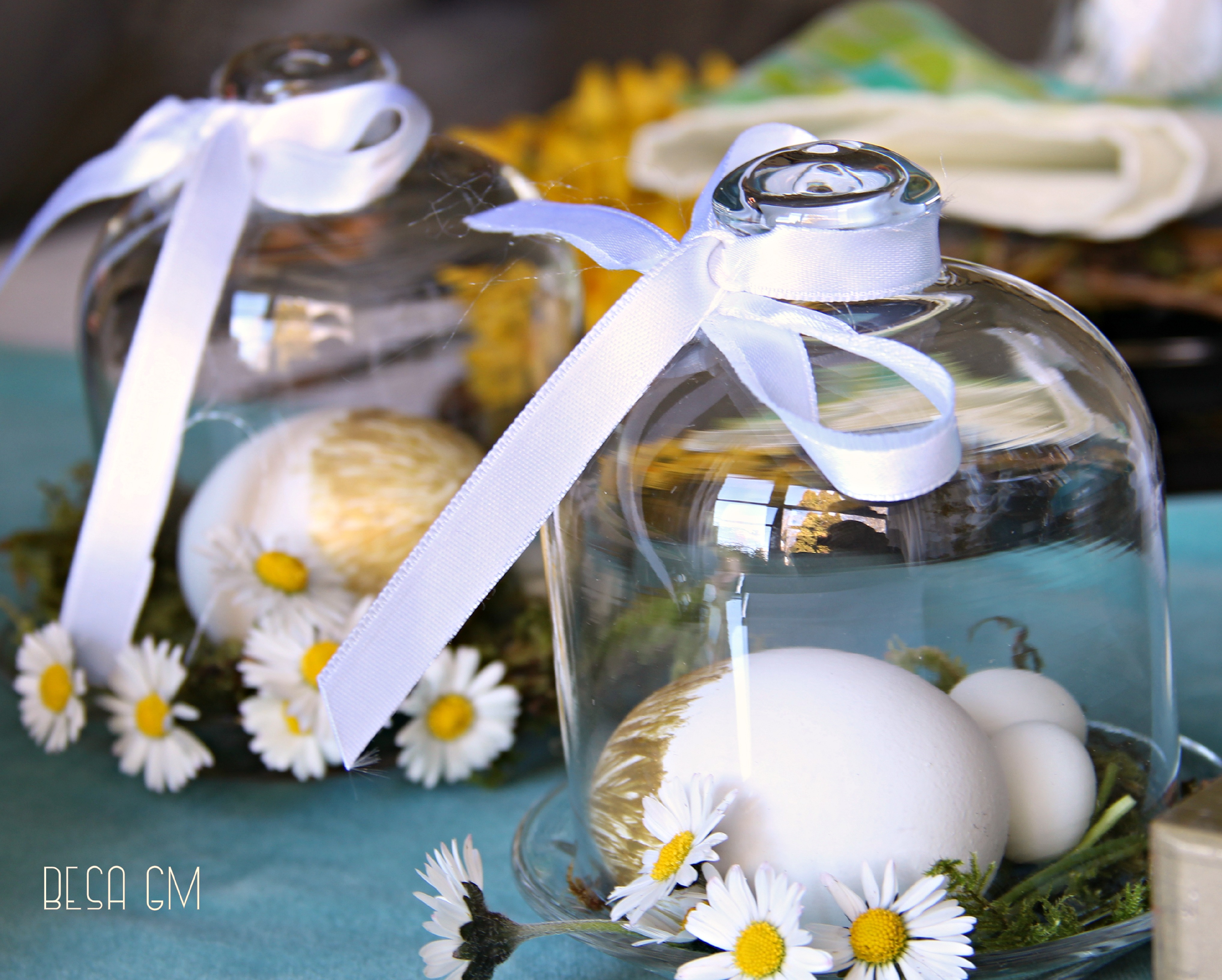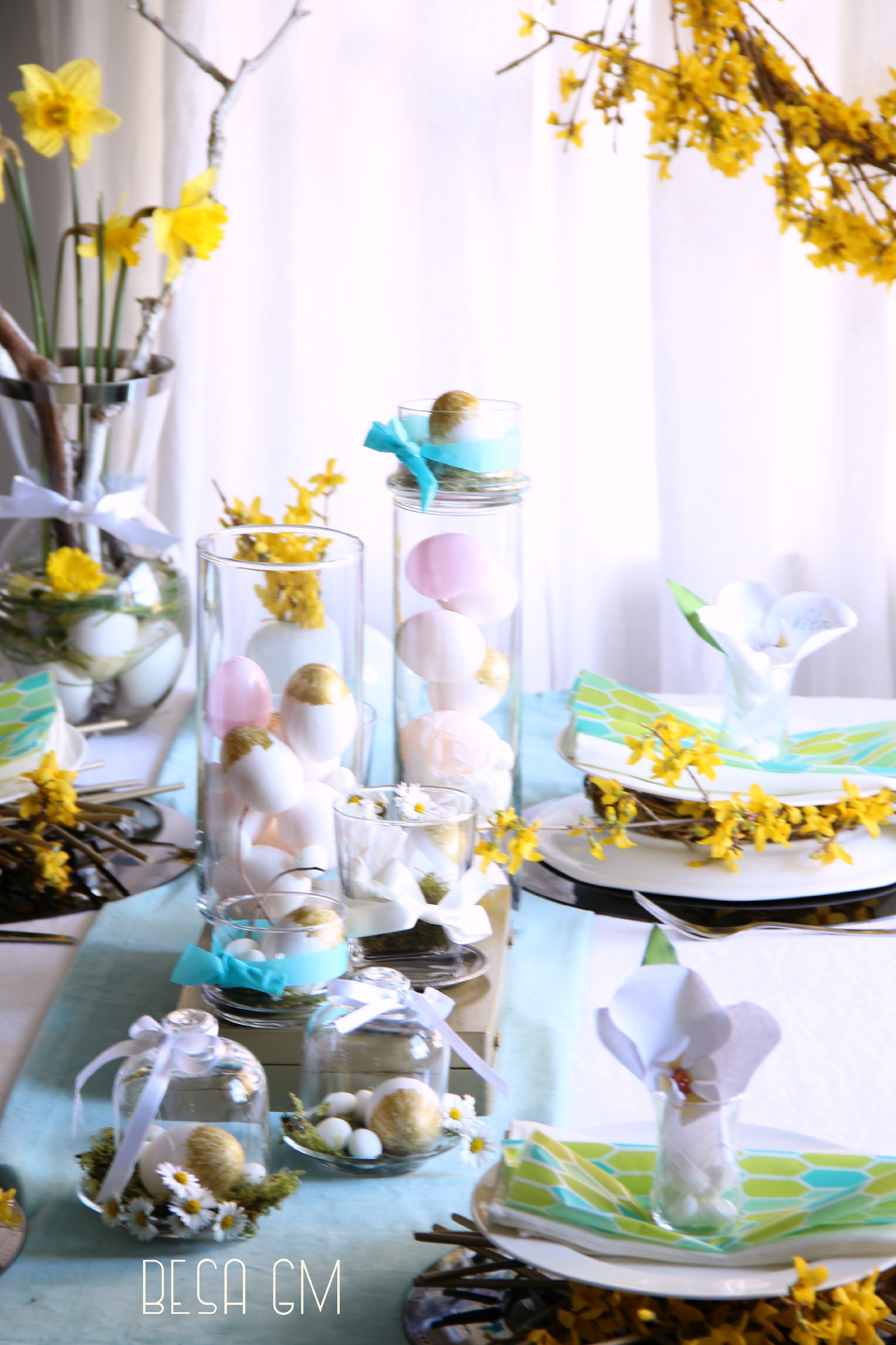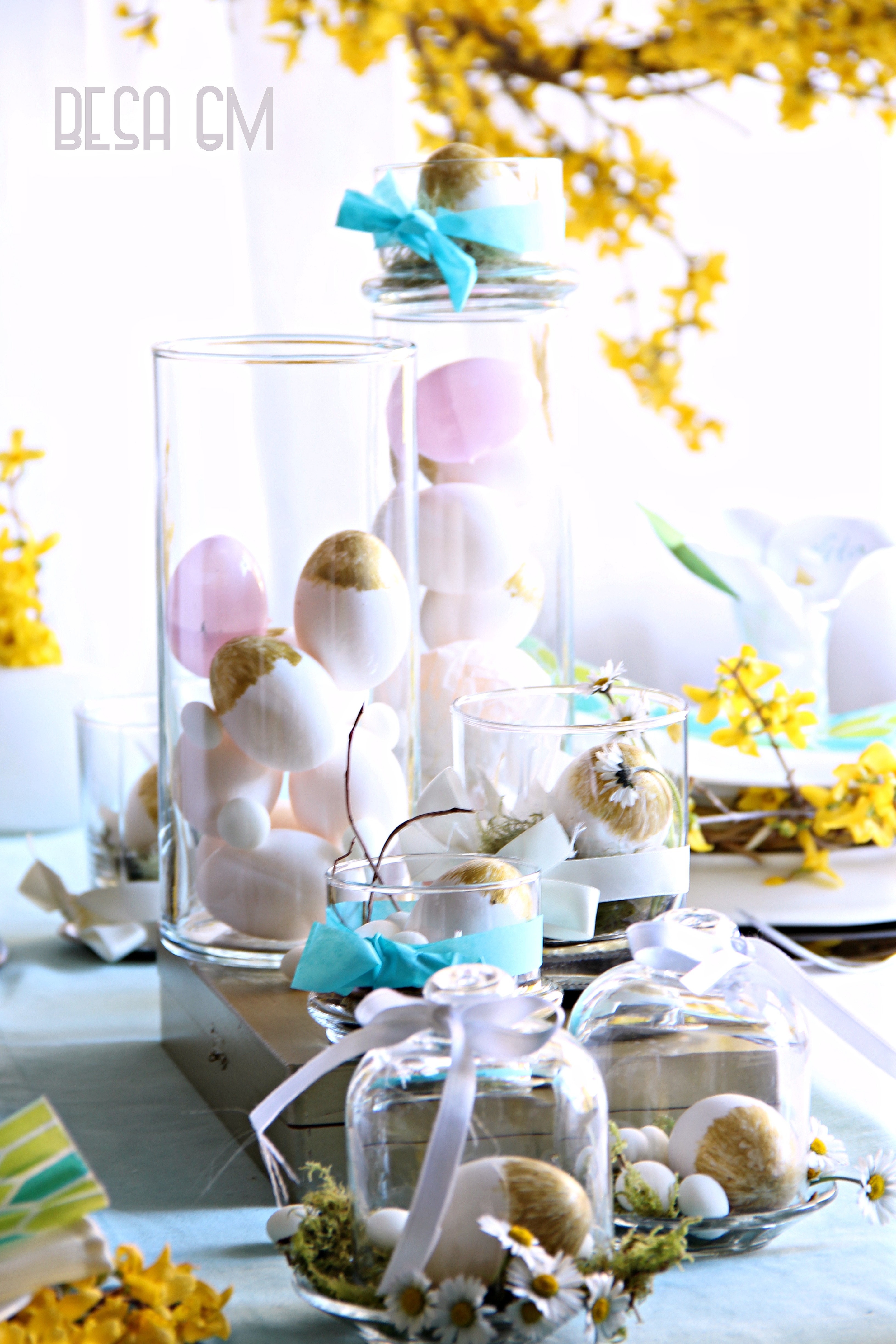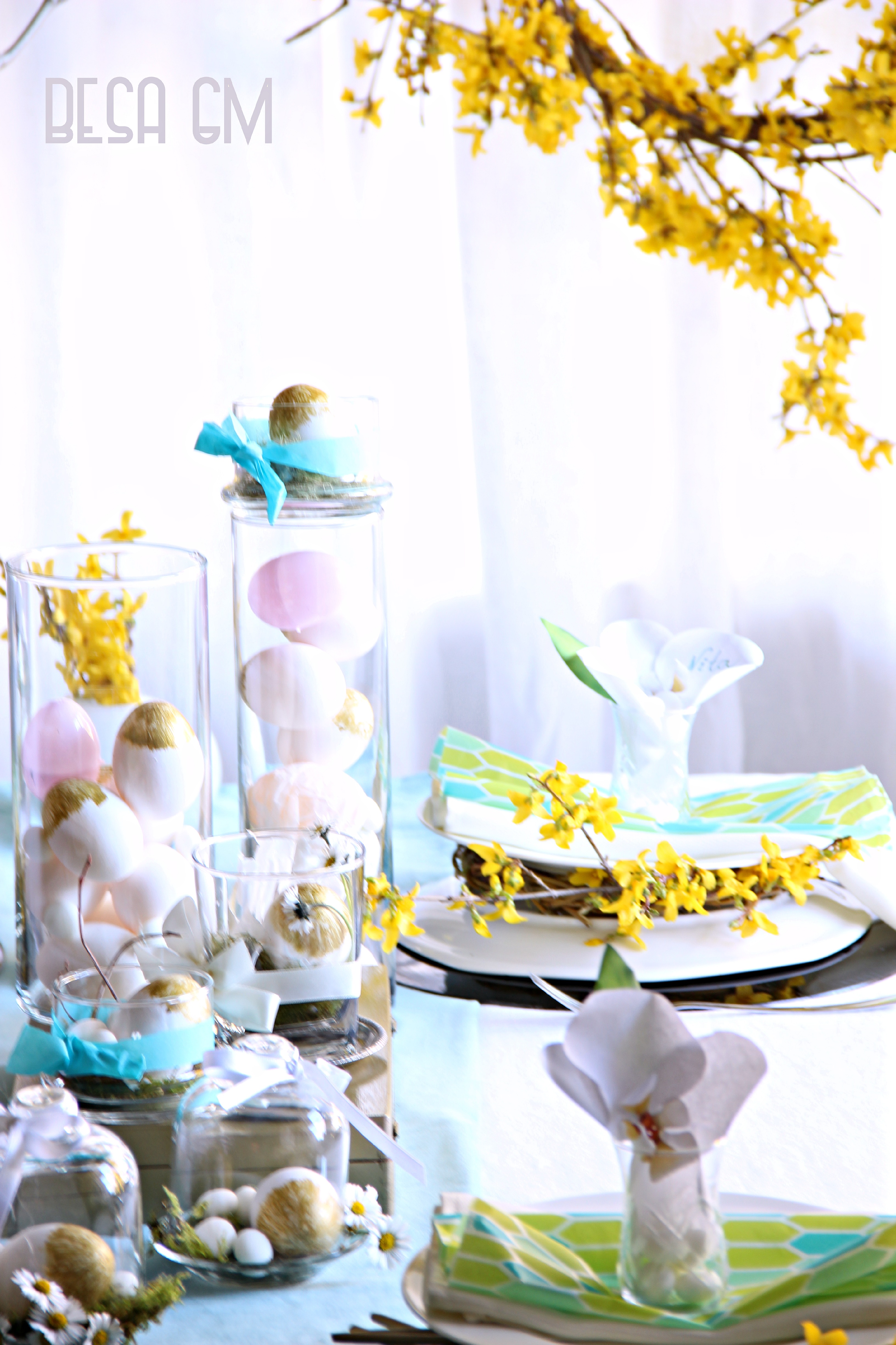 For the centerpiece I used clear glass vases of various heights and filled them with white eggs which were previously “dip died” in gold, and tied white and blue ribbons around the vases.