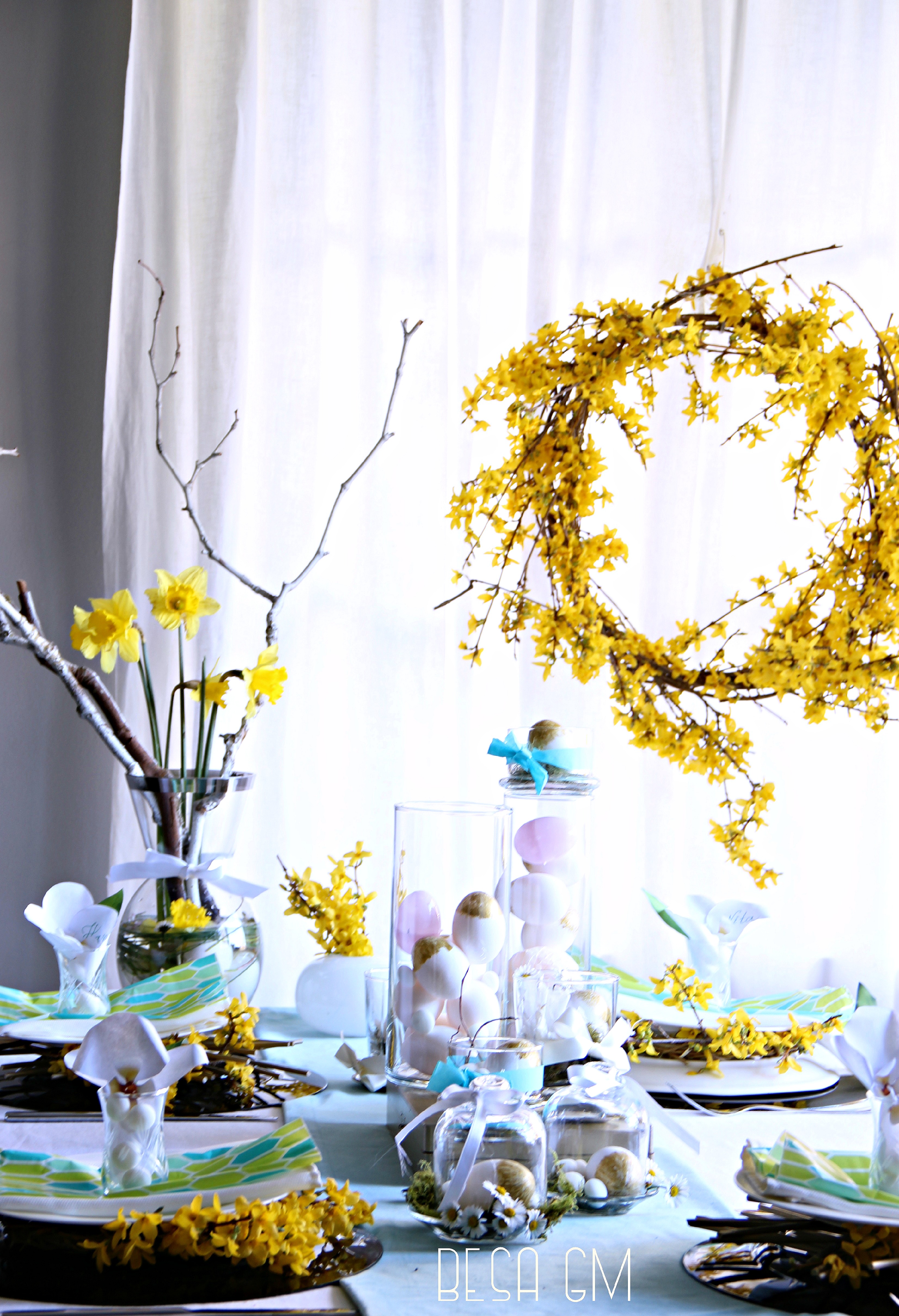 To incorporate yellow I used branches of yellow blossom from our backyard bush. I created an imperfect wreath and beside adding a color to the palette, the wreath’s imperfectness added a casual and springy feeling to the eating area.