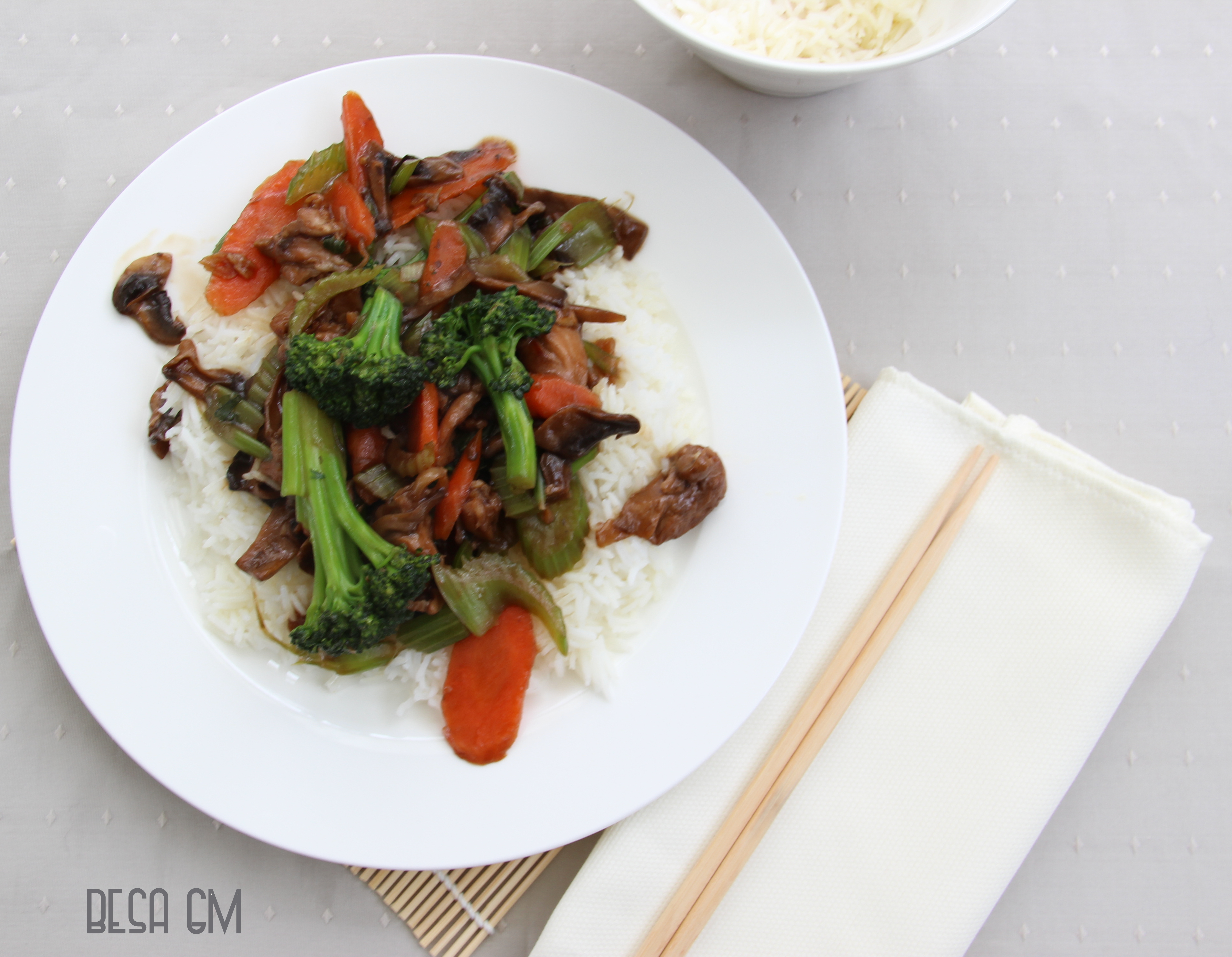 Heat olive oil in a wok or a large skillet. Add garlic and cook until golden brown. Add the chicken mixture and cook for about 5-8 minutes. Add sliced mushrooms and cook about 2 minutes. Add cooked veggies, toss and cook about 30 seconds. Add the cornstarch mixture and toss together until the mixture thickens and all ingredients are evenly coated with the mixture.