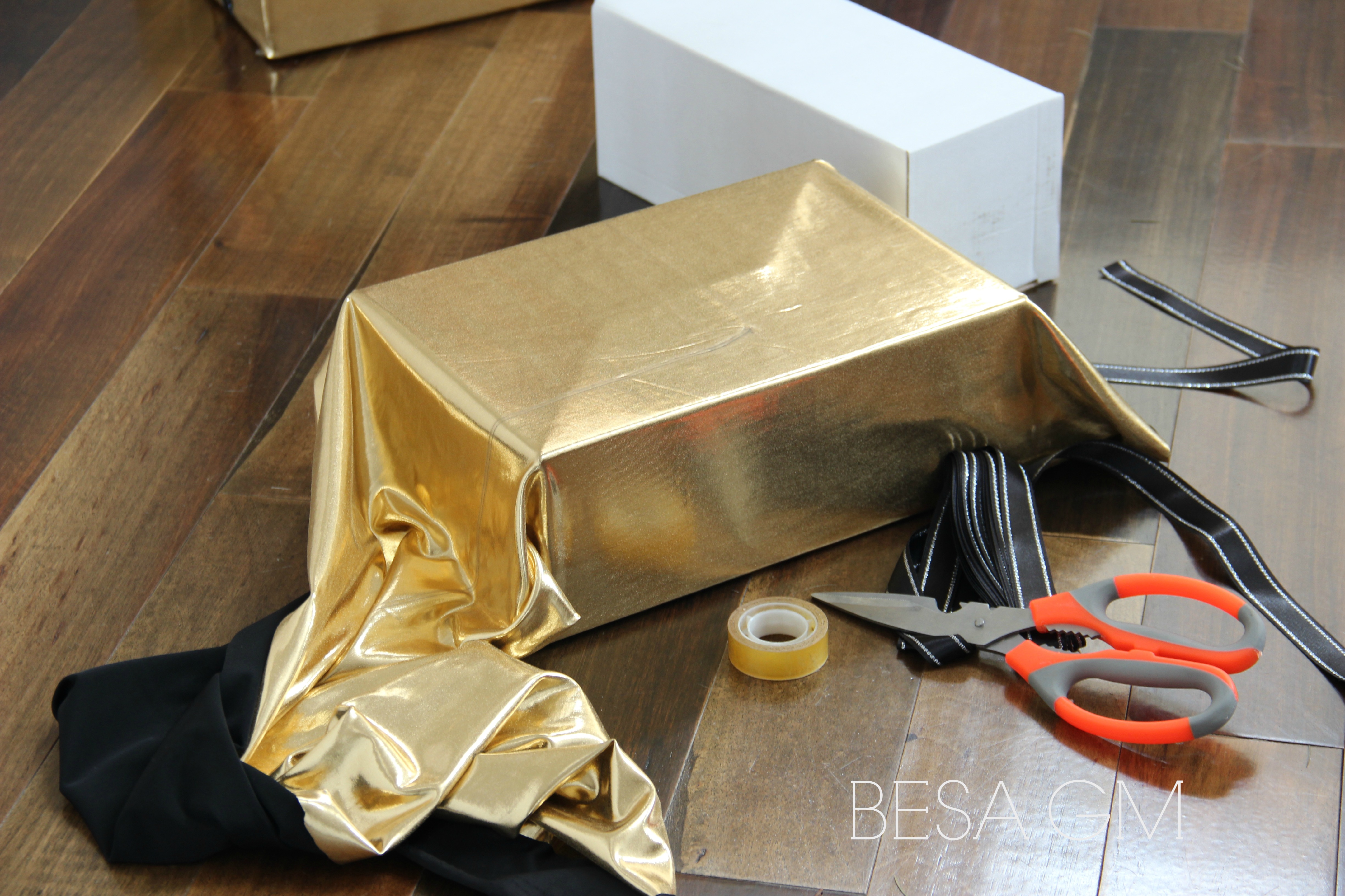 To create this look ( for three medium boxes) you need 60 cm of metallic stretch fabric, 5 meters of two sided black sateen ribbon, self adhesive tape, scissors, thread and a needle.