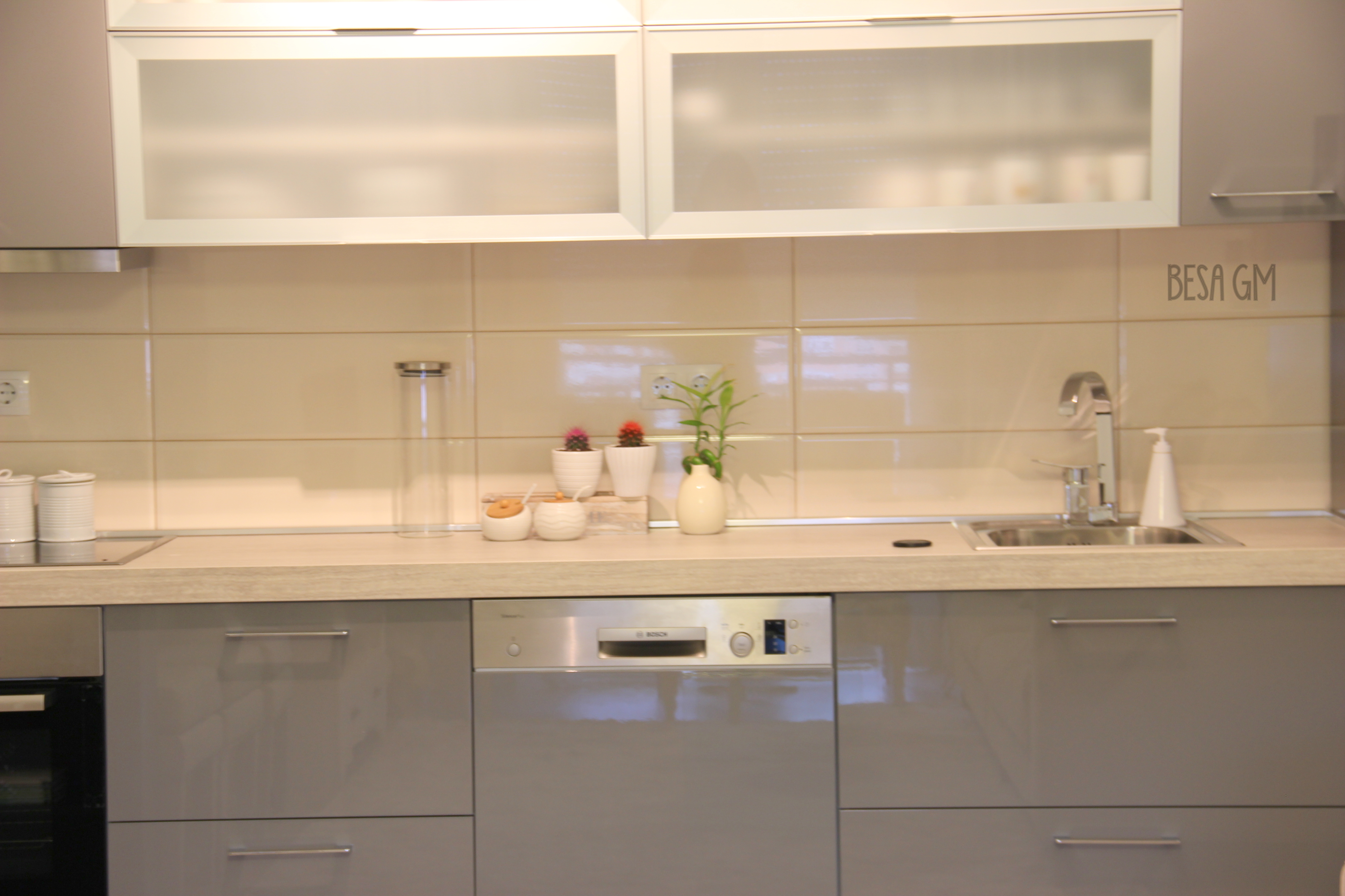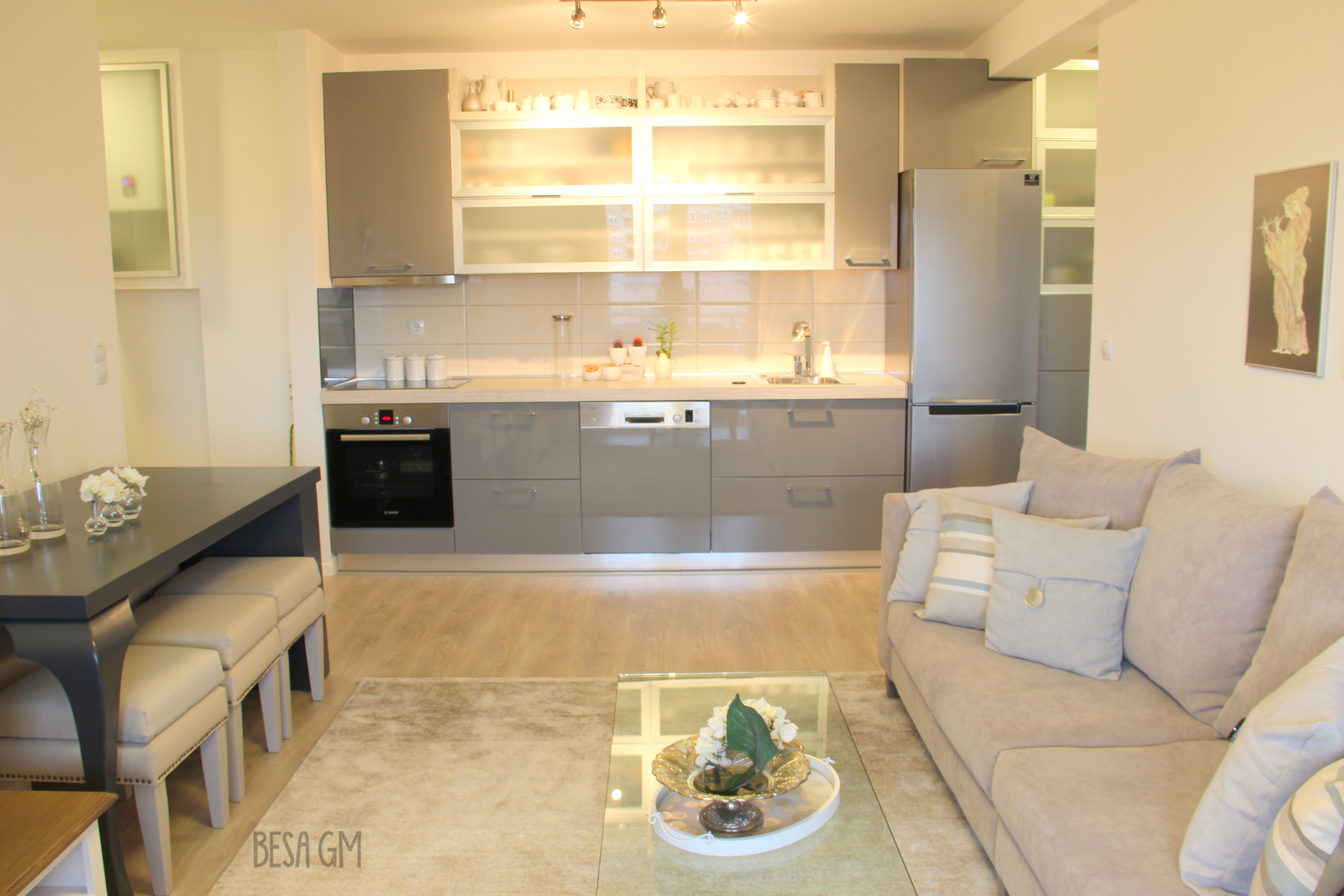 Since the best use of space did not allow for applying any kitchen shape other than straight line shape, I had to add some interest to the kitchen design by incorporating some horizontal glass cabinets and some open shelving at the centre of the kitchen. Glass cabinet door was also used to hide a central heating device which was unwisely installed (by the builder) right beside the kitchen wall and which was “dramatically” visible from all around the living area. For continuous flow, the etched glass doors were used for the shoe cabinet at the entrance.
