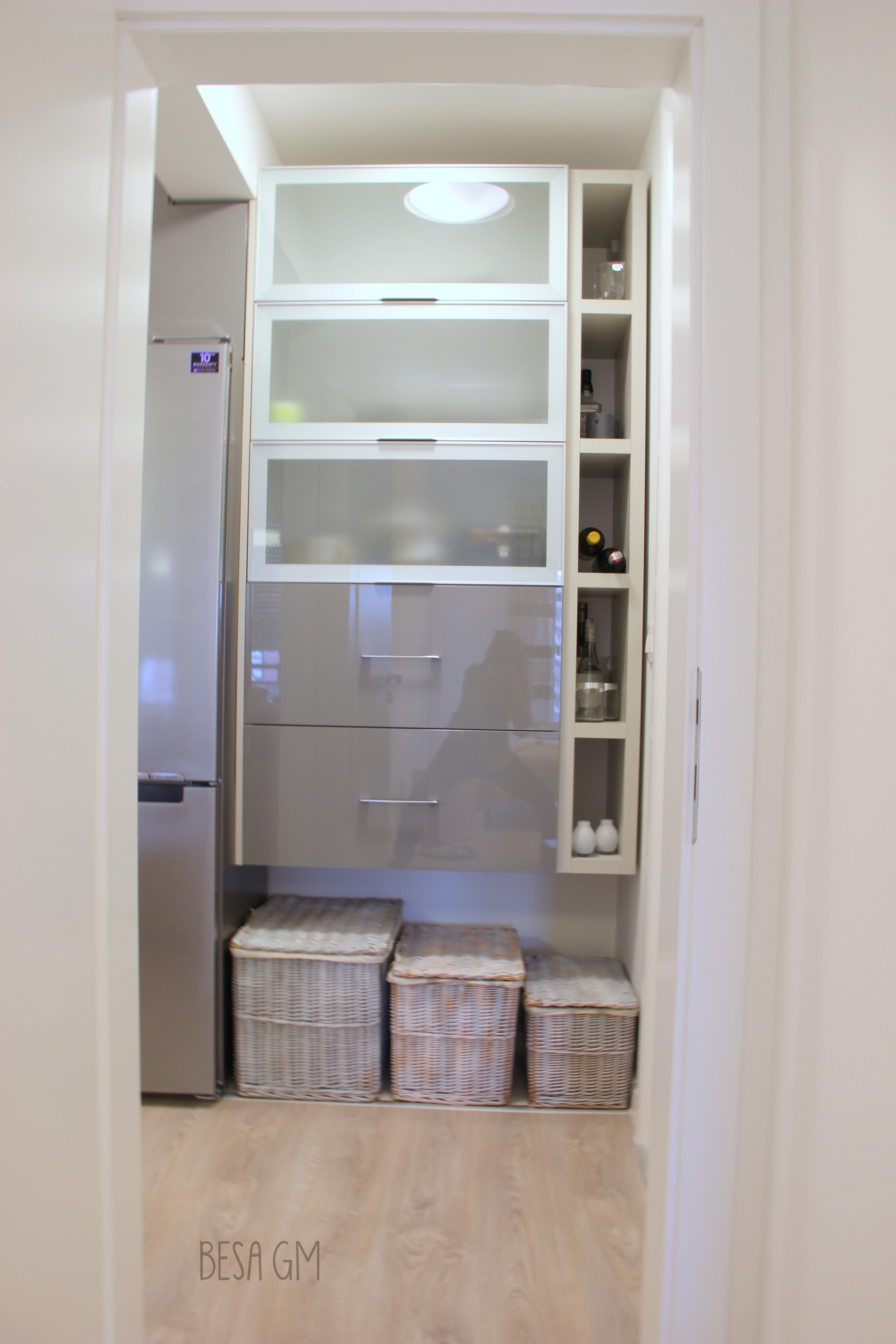 Initially, these drawers were designed to be custom made wider, but the cabinet maker did not properly follow the design and the measurements so during the installation of the kitchen we realized that we were ending up with a 20 cmm empty spot at the right side of the kitchen. This was a big fail from their part, but since the owners were in a rush to move in, and did not have time to wait for the drawers to be redone, I had to come up with the idea on how to fill that empty spot which would also serve somehow a function; hence, I designed this wine shelf which will provide for a plenty of storage for homeowners.