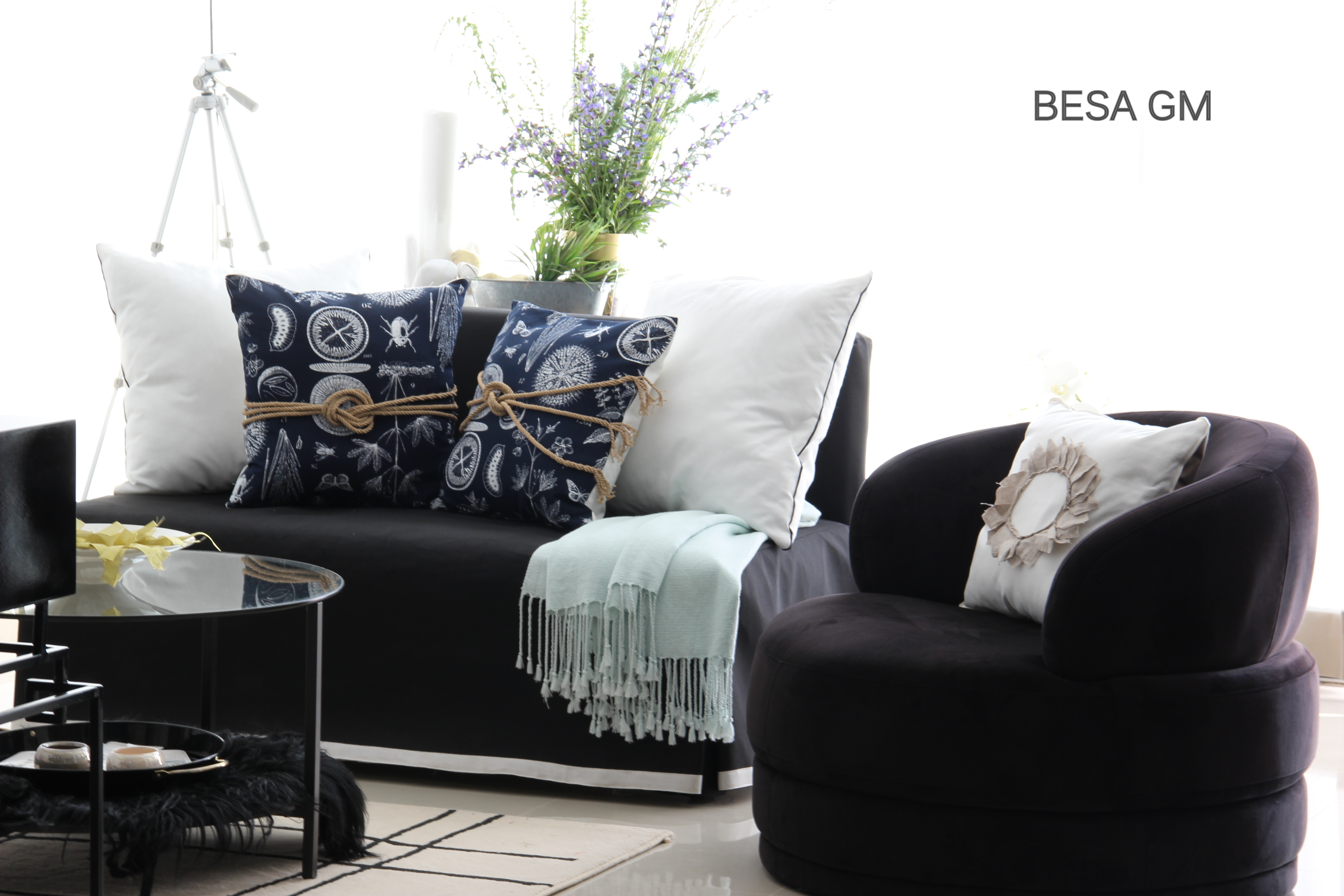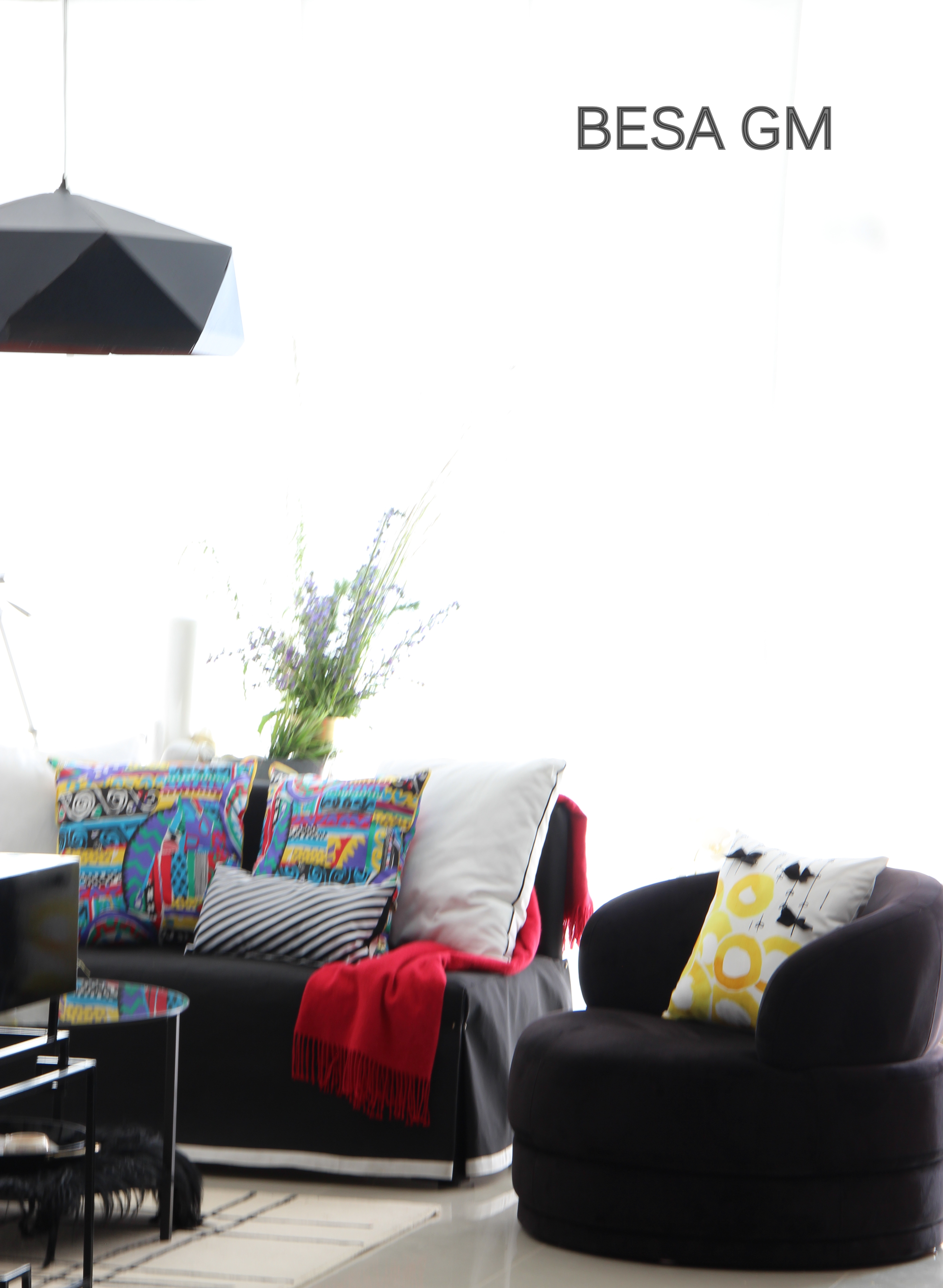 Using some of the pillows which I have designed for this summer collection I will try to demonstrate how you can change the looks of a very simple sofa using different pillows.