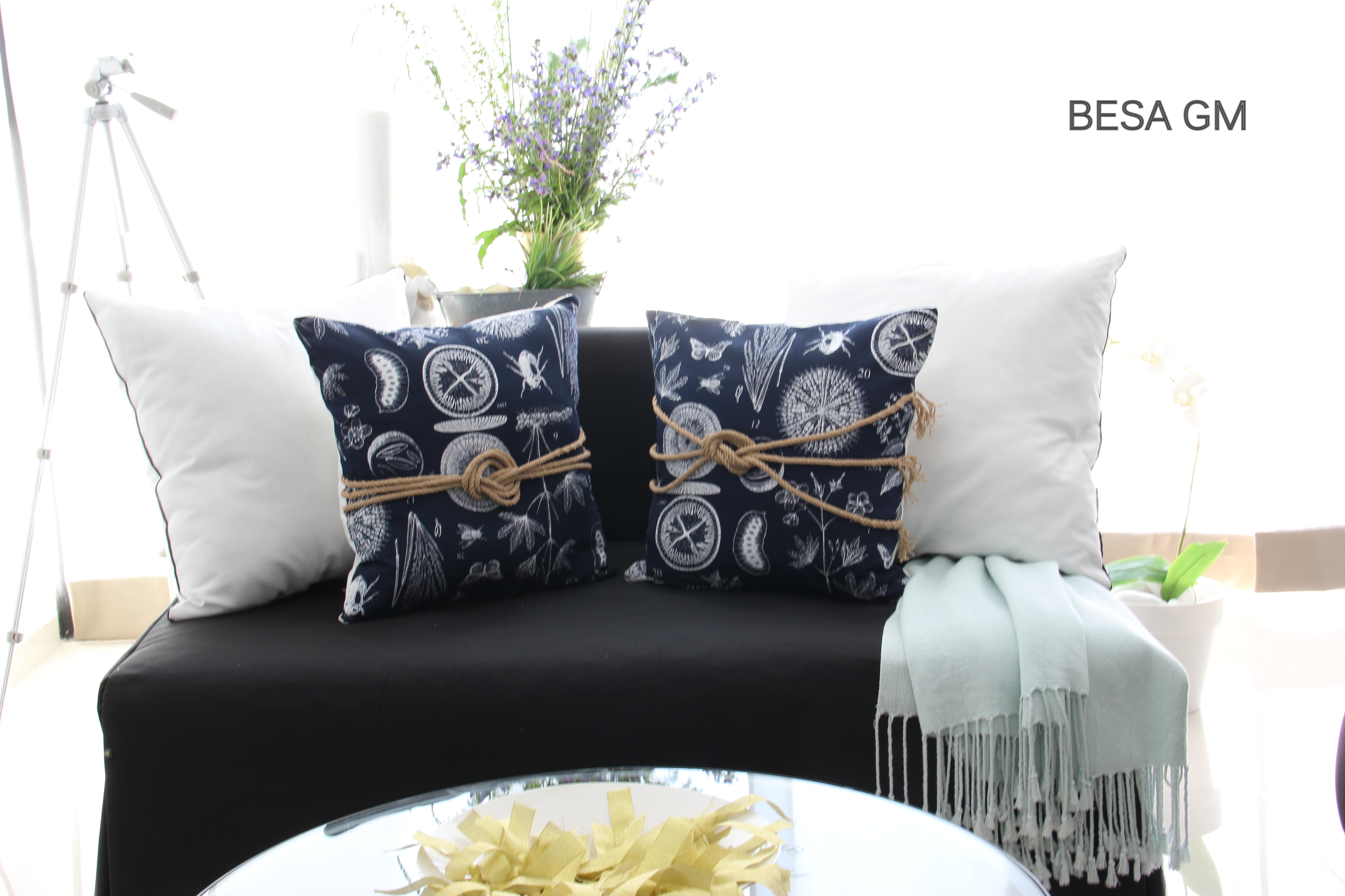 Me keta dy jastek blu te punuar me litar e kemi kriju nji pamje costale qe te perkujton bregdetin, pushimin dhe relaxin.