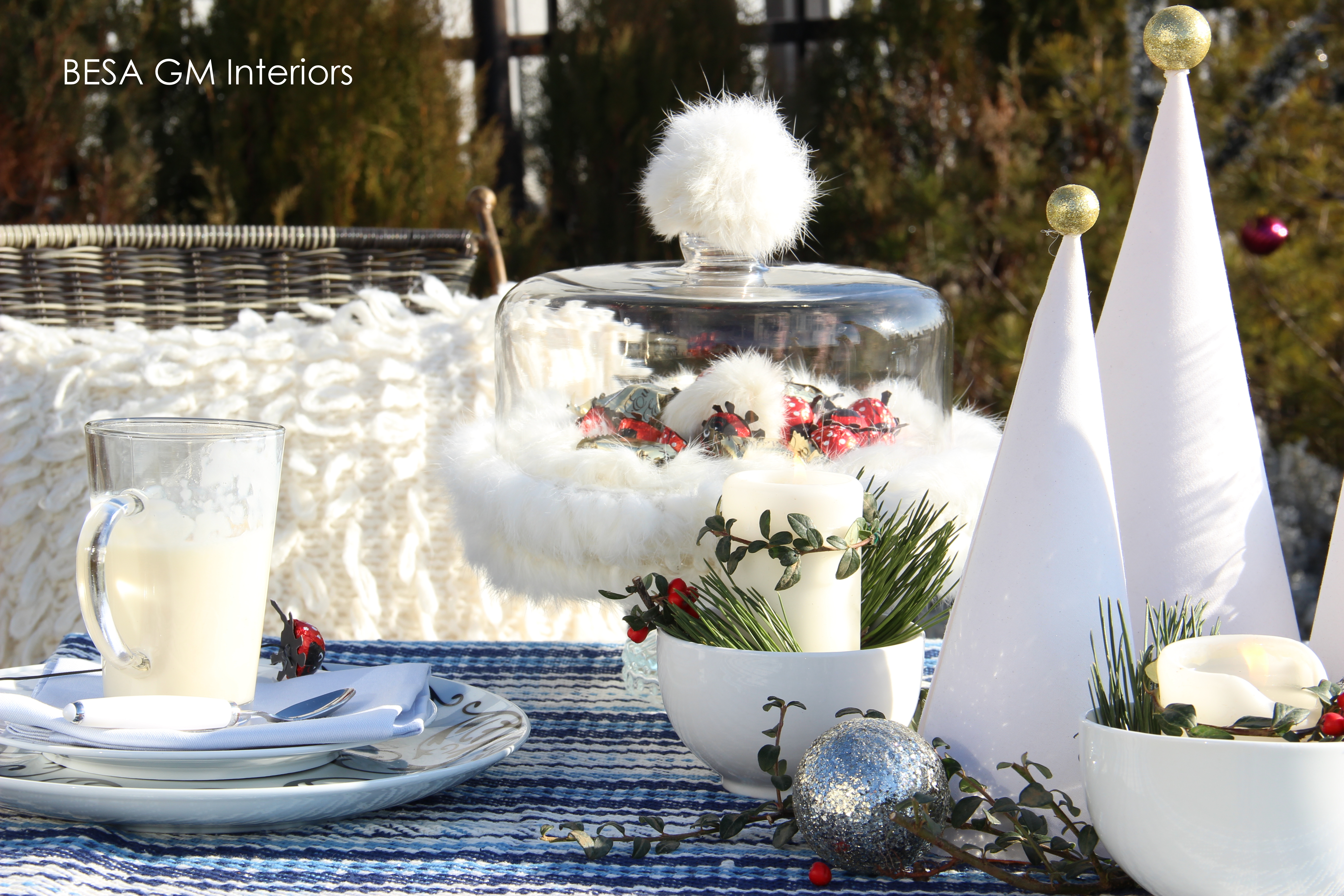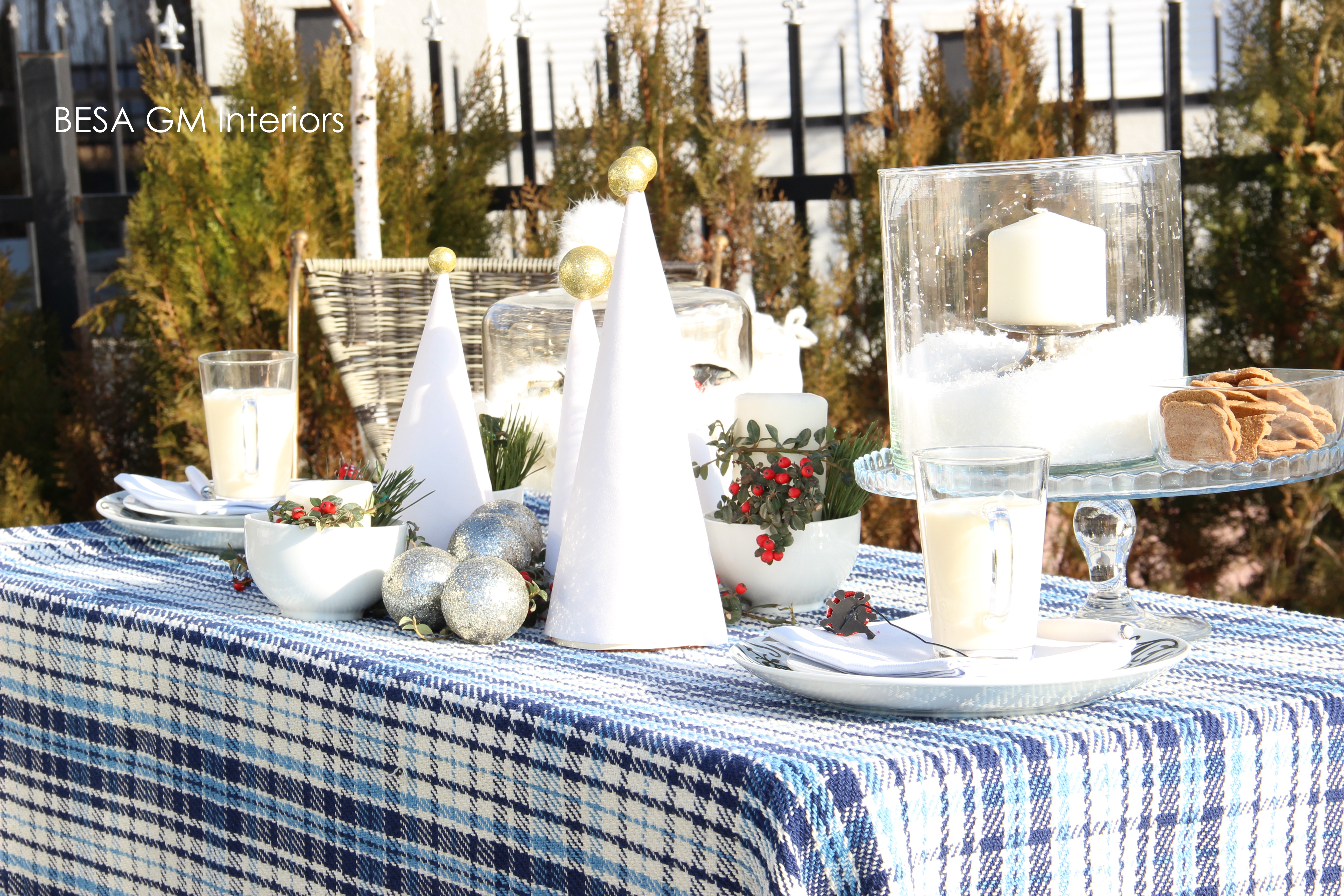 For a tablecloth I used a plaid cotton blanket in blue and I neatly tucked the candles in white cereal bowls which were previously staffed with the evergreens from my garden. I covered a cake stand with a white fur, on top of which I placed some chocolates, and on another cake stand I placed another vase with a candle and my favourite ginger cookies. Everything looked so wintery and chick so I took endless photos which I am sharing with you.