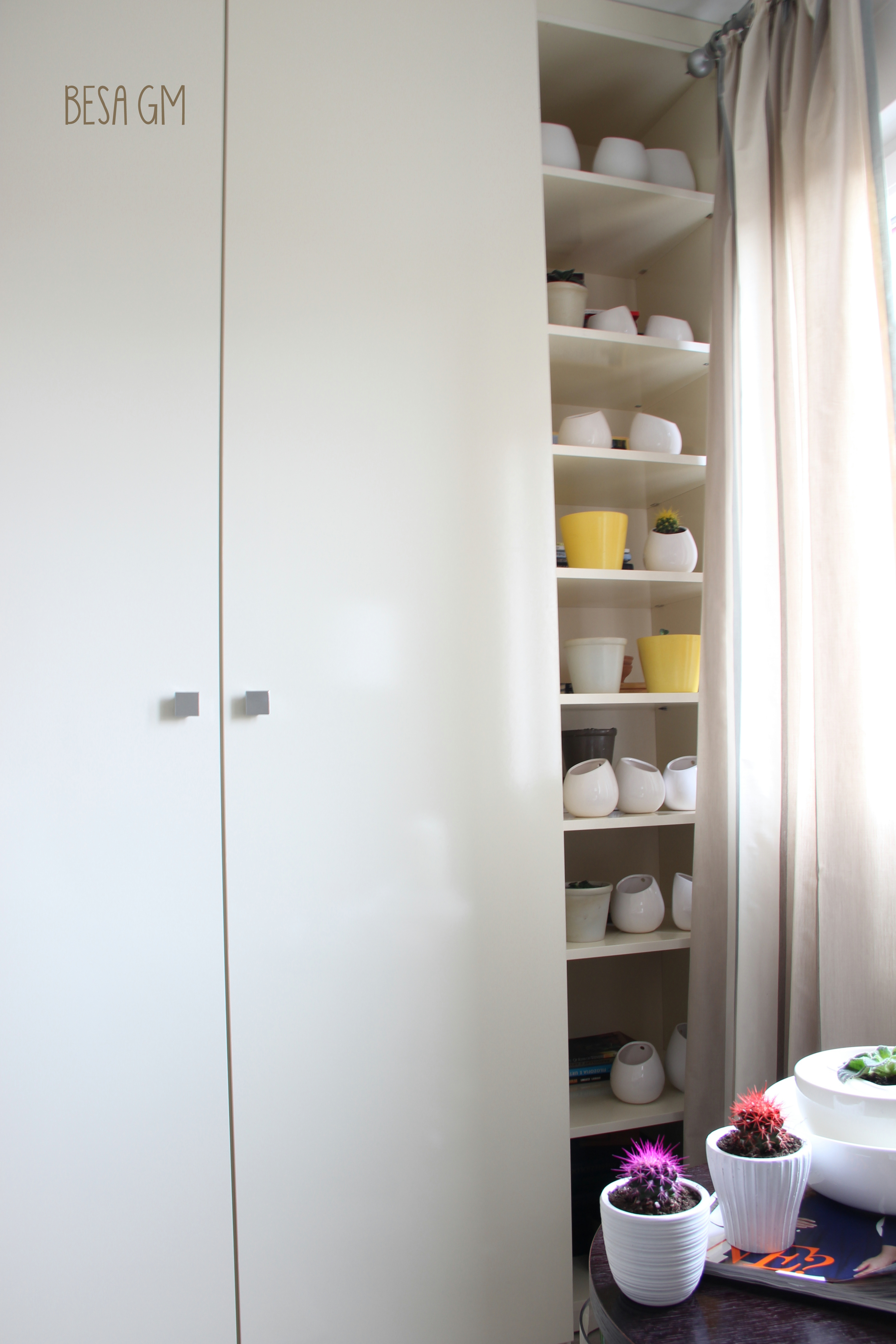 Since the client loves plants and has a large collection of african violets in all possible colours, I incorporated in this closet design a large number of shelves close to the window for her plant collection.