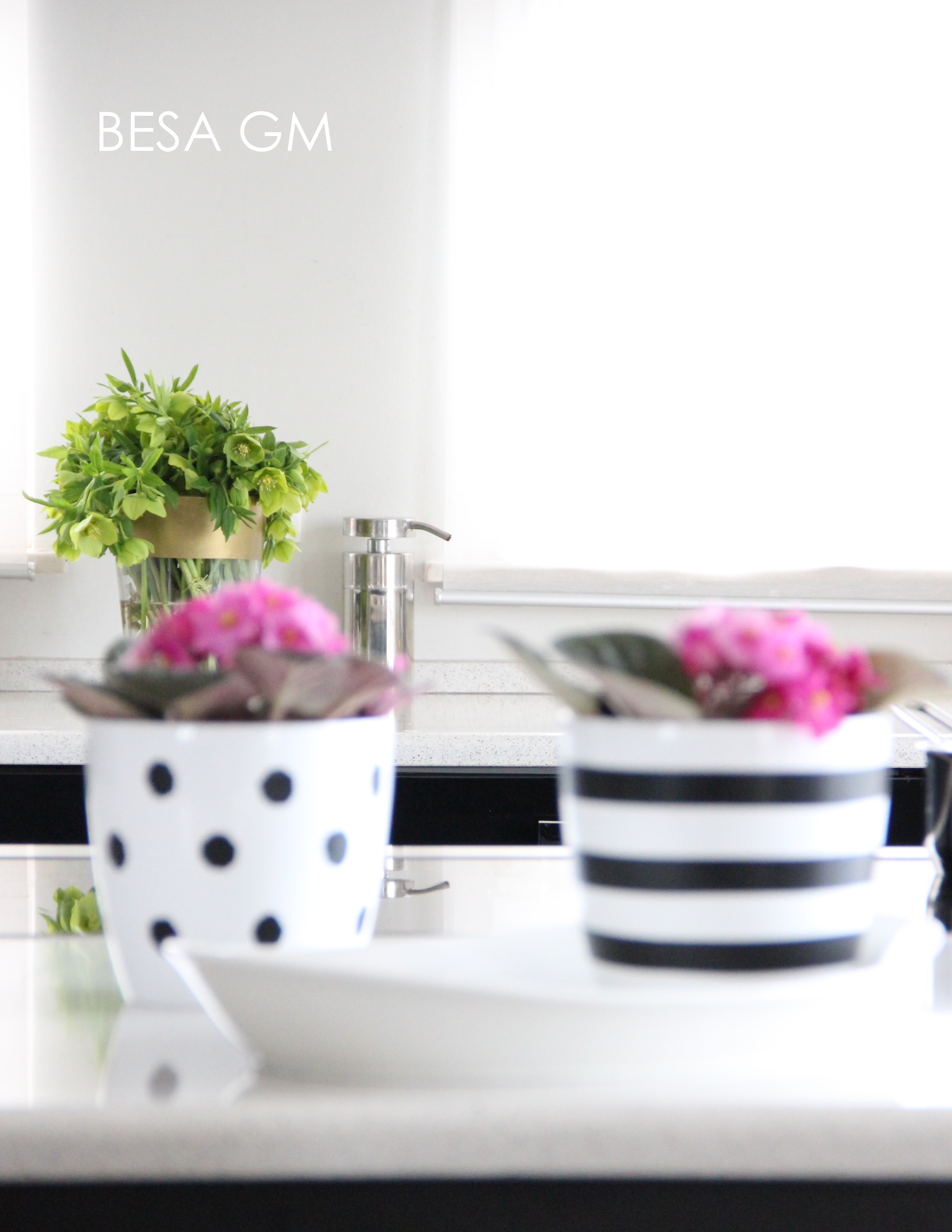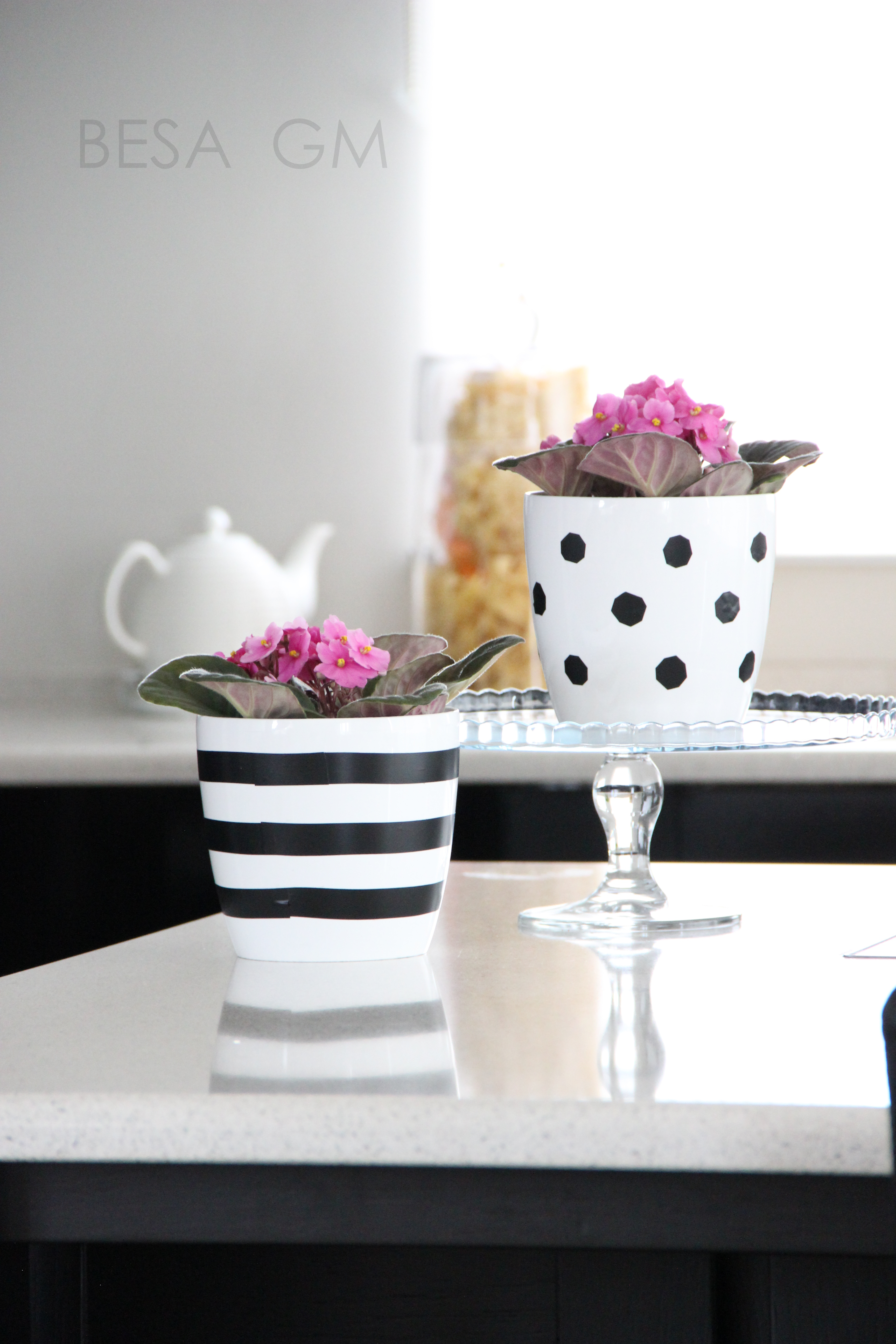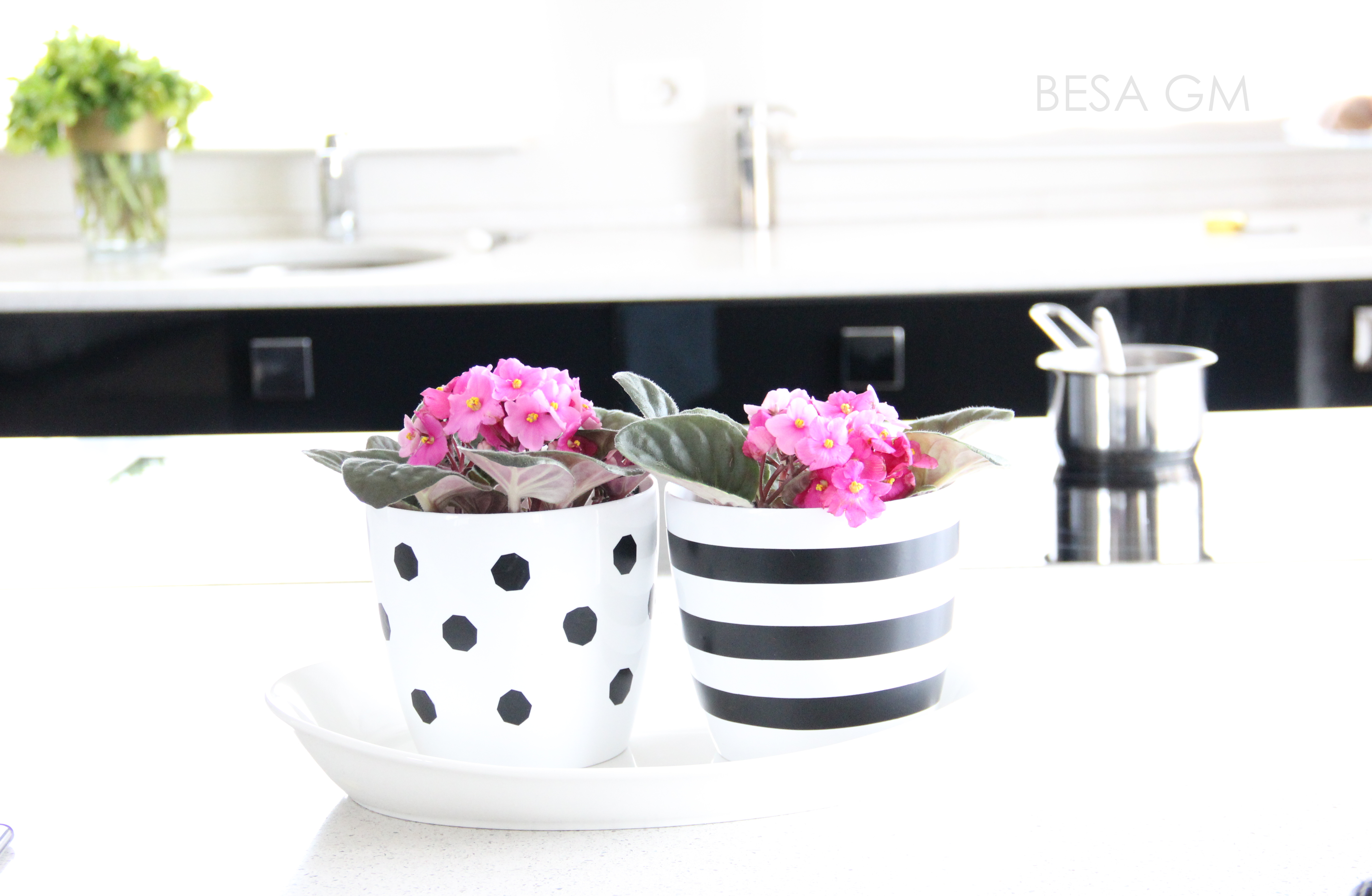 Gjersa isha duke bere shopingun per zarzavate ne marketin e afert, ne sy me rane disa vazo te bardha plastike, dhe poashtu isha me fat qe qellova ne ate moment ne market kur erdhi nje kontingjent i vjollcave afrikane ne te gjitha ngjyrerat egzistuese. I mora vazot dhe disa nga vjollcat roze, dhe posa u ktheva ne shtepi i hodha qeset e shopingut menjane dhe menjihere fillova me dekorimin e s saksive.