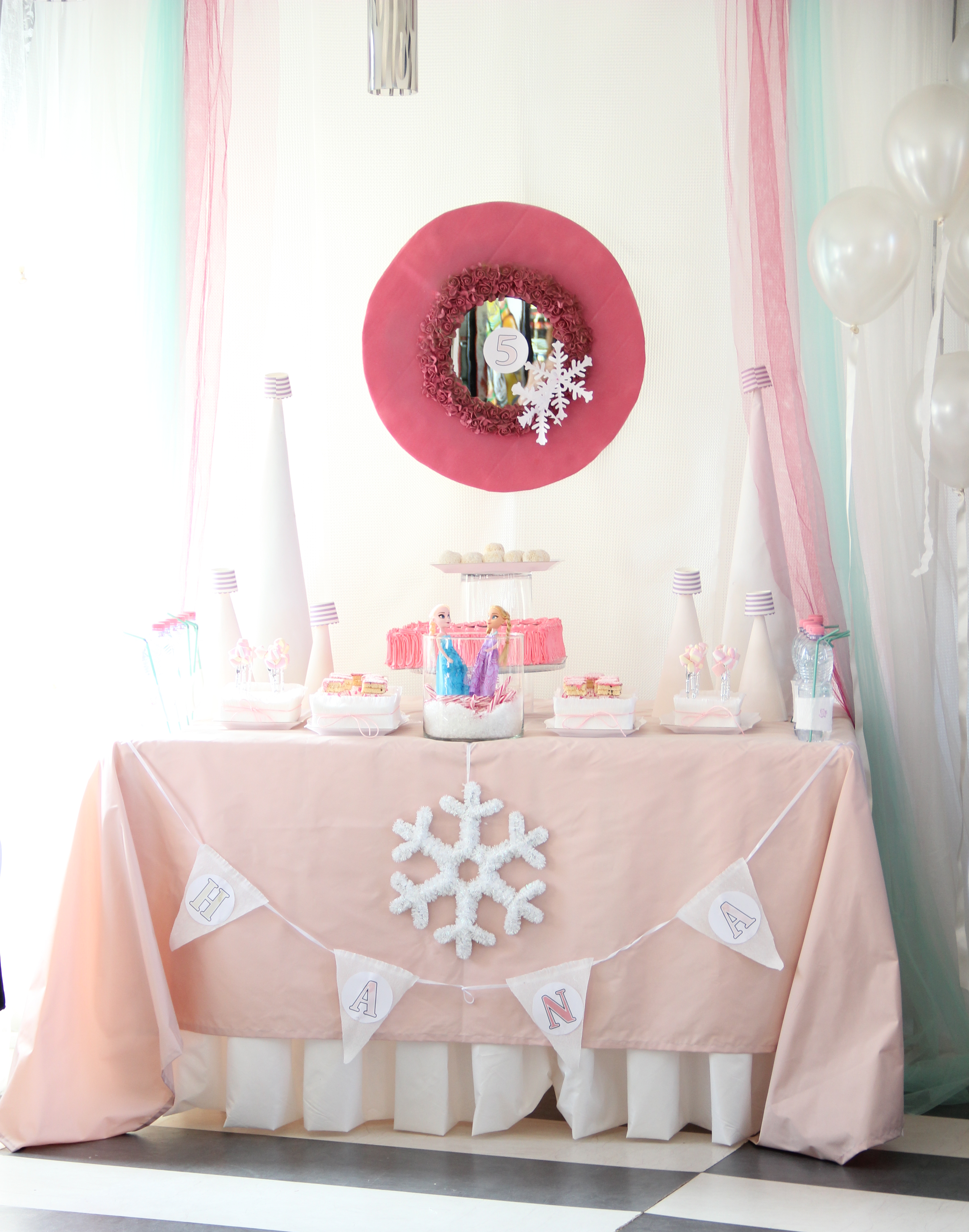 My super cute niece Hana turned five yesterday and since she adores Anna and Elsa from Frozen, her mother and I wanted to make her a surprise by decorating Hana’s 5th birthday event with a lot of her favourite colour PINK and beloved Anna and Elsa dolls. As a result we ended up with a very soft and elegant pinkish Frozen theme which was adored by the birthday girl and all her little friends.