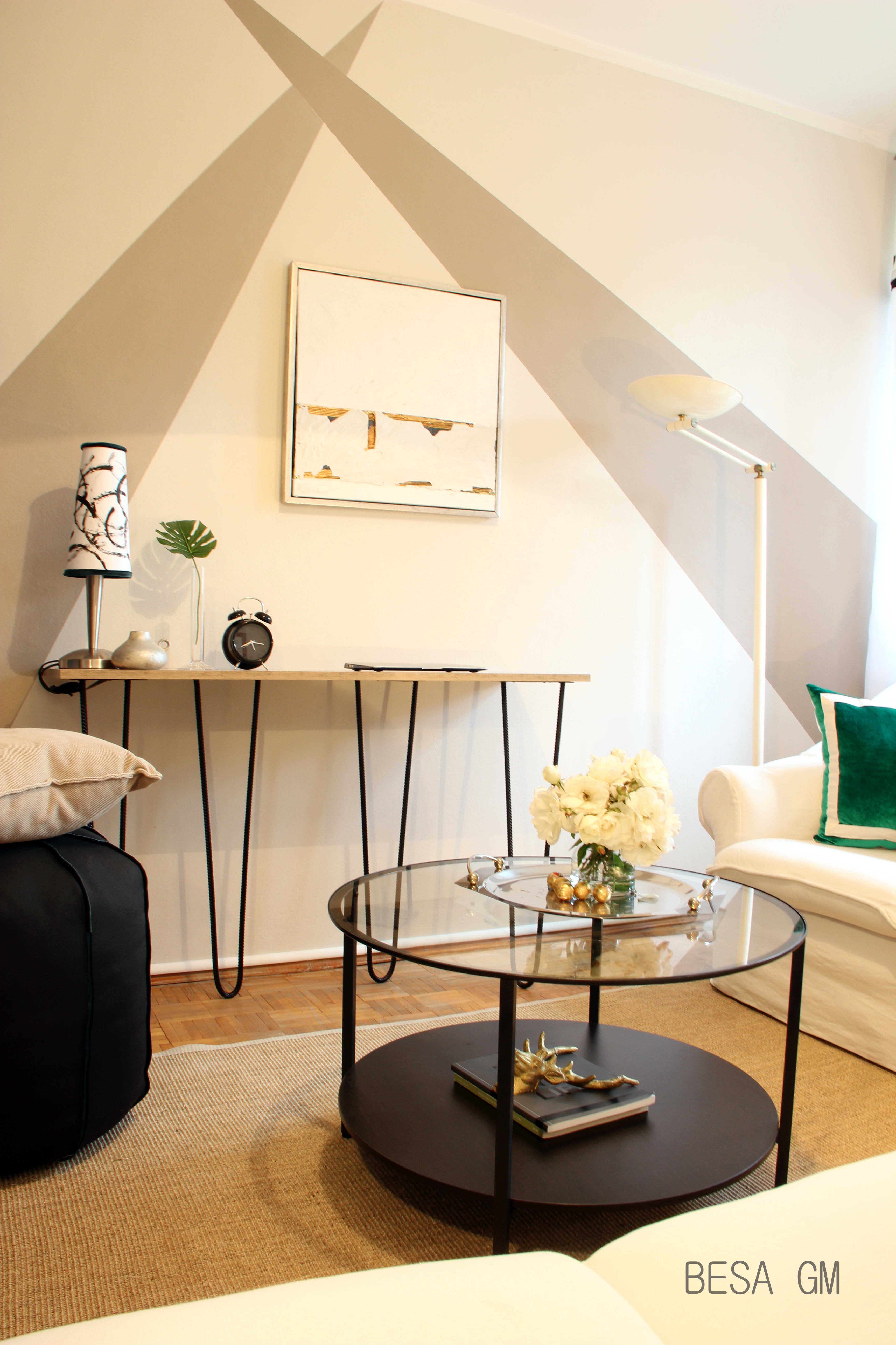 Qe t’e beja me interesant dhomen vendosa qe muri ballor te jet si pike fokale e dhomes ashtu qe e krijova nje mural me dizajn gjeometrik ne ate mure. Gjithashtu, edhe piktura e vendosur ne murin me mural eshte nje DIY projekt.