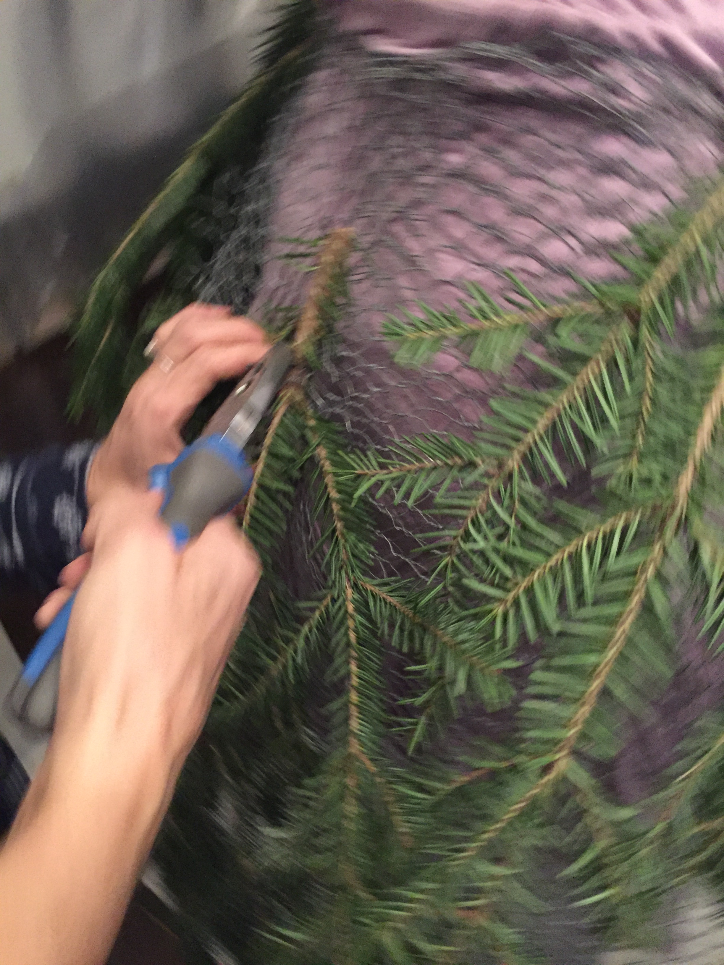 Afterwards we started covering the surface of the wire with tree branches by securing each of them with florist wire.