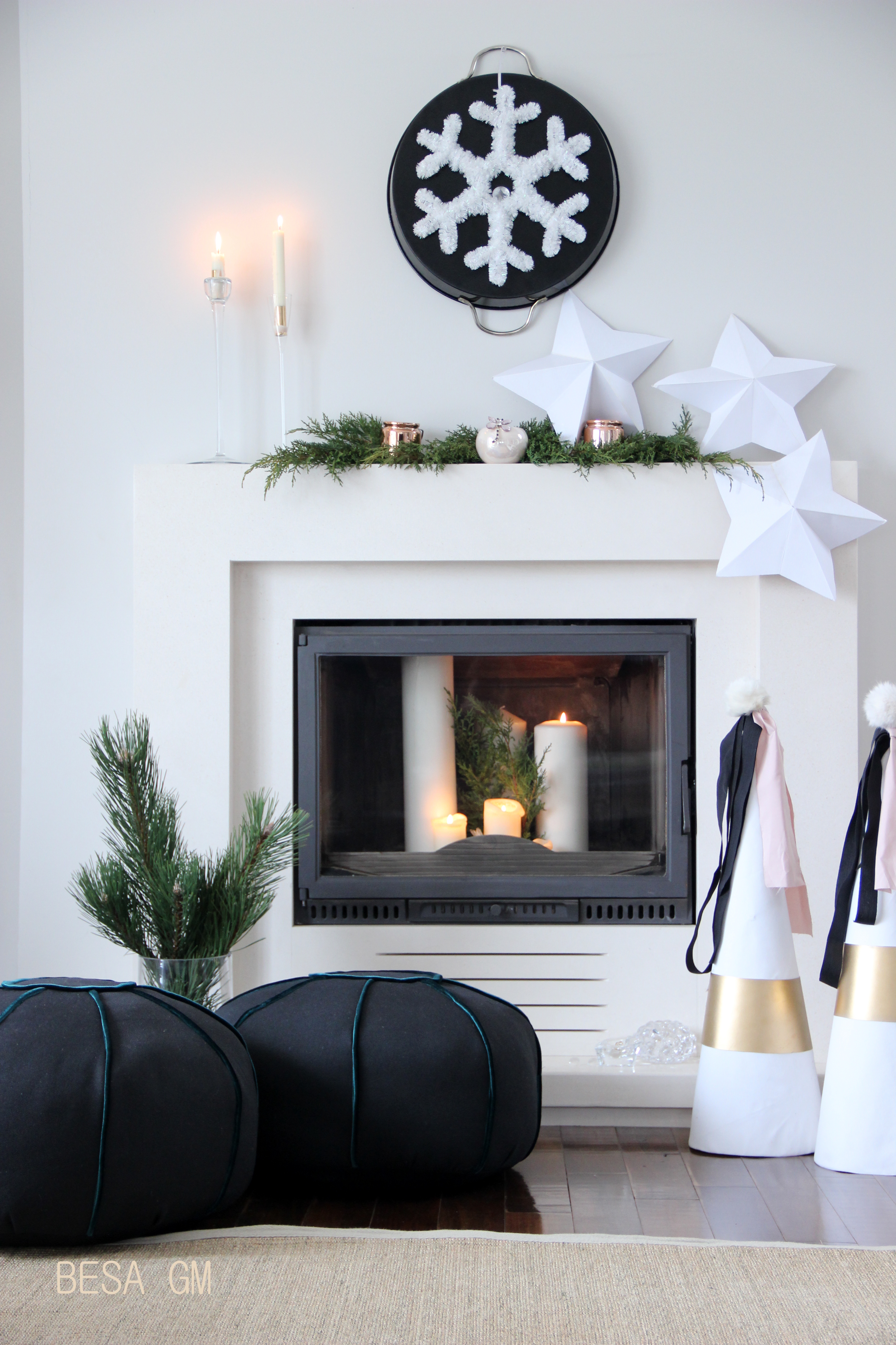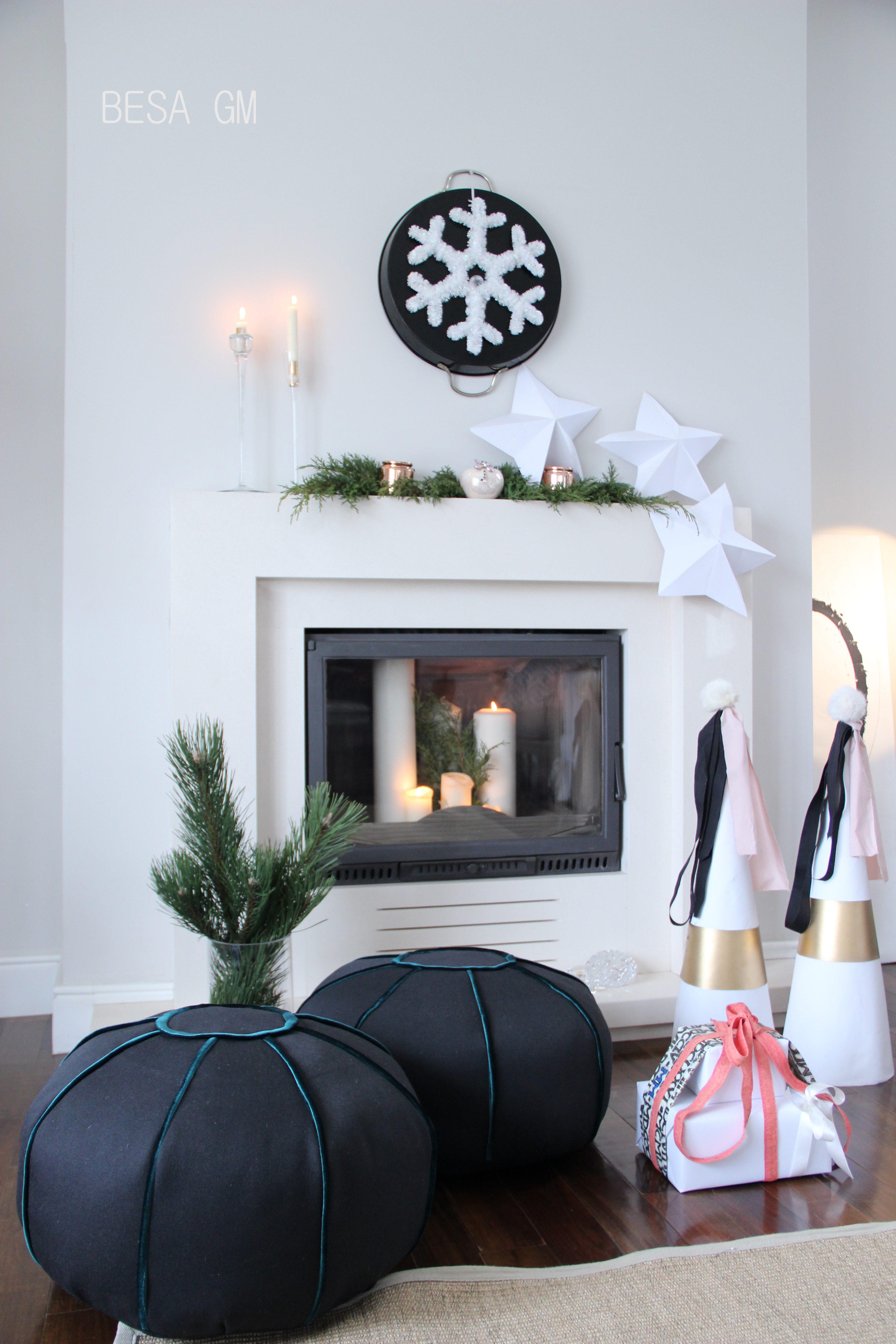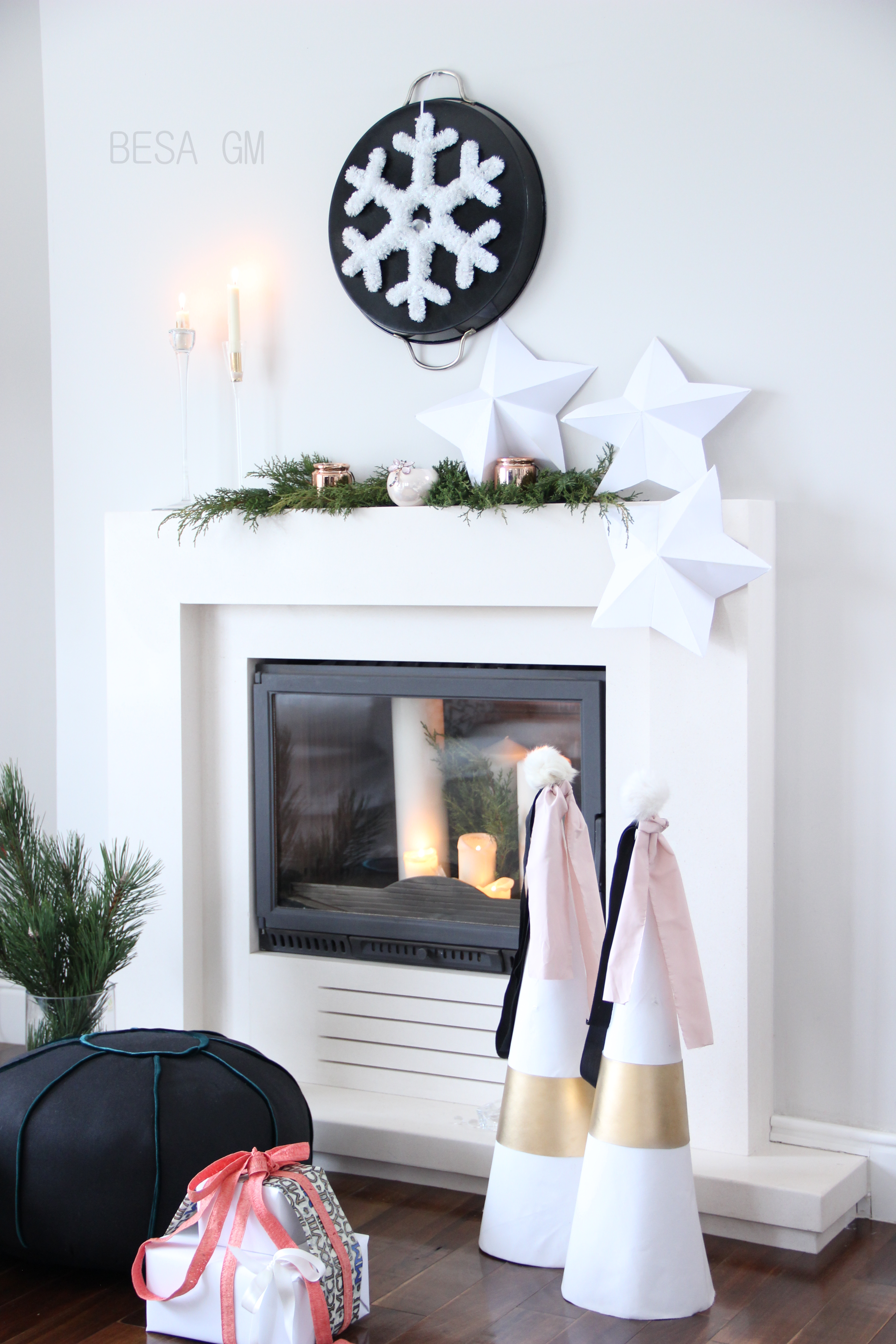Dekorimi e ketije kamini u be per me pak se 15 minuta. E perdora nje tabake te zeze me doreza ngjyre ari te cilen e kam qe sa vite. E ktheva nga ana e pasme dhe i vendosa nje dekor fluske bore siper, te cilen gjithashtu e kisha nga viti i kaluar . Siper kaminit vendosa degeza bredhi nga kopshti, dhe siper tyre vendosa disa mbajtese festive te qirive. Ne njeren ane te kaminit vendosa disa ylleza punim dore nga letra e bardhe, ndersa ne dysheme afer kaminit vendosa konat nga materiali dhe letra e bardhe te punuar vitin e kaluar per dekorin e kaminit. Per t’ju dhene nje dukje te re konat i redekorova dhe ja pershtata konceptit dekorues per kete vit. Per nje pamje moderne, ne anen tjeter te kaminit, ne dysheme, poashtu vendosa edhe dy jasteket e dyshemes (poufs) te qepur rishtazi. Nje te tille e kisha qepur disa vite me pare, dhe instrukcionet per qepje gjenden ne kete link.