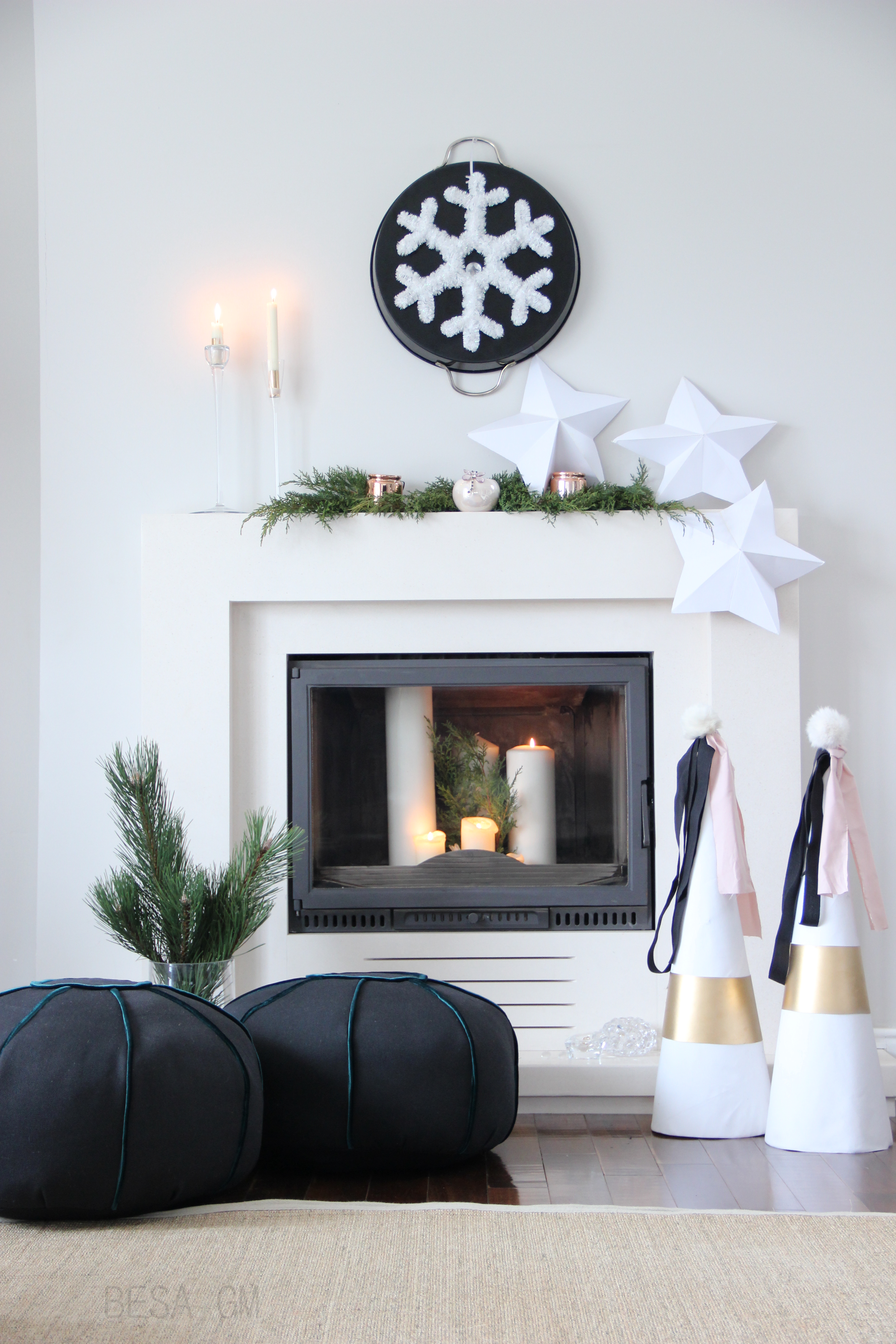 On the floor I placed two paper/fabric cones which I DIY-ed last year for my mantel decor, and I gave them a new look for this year.
