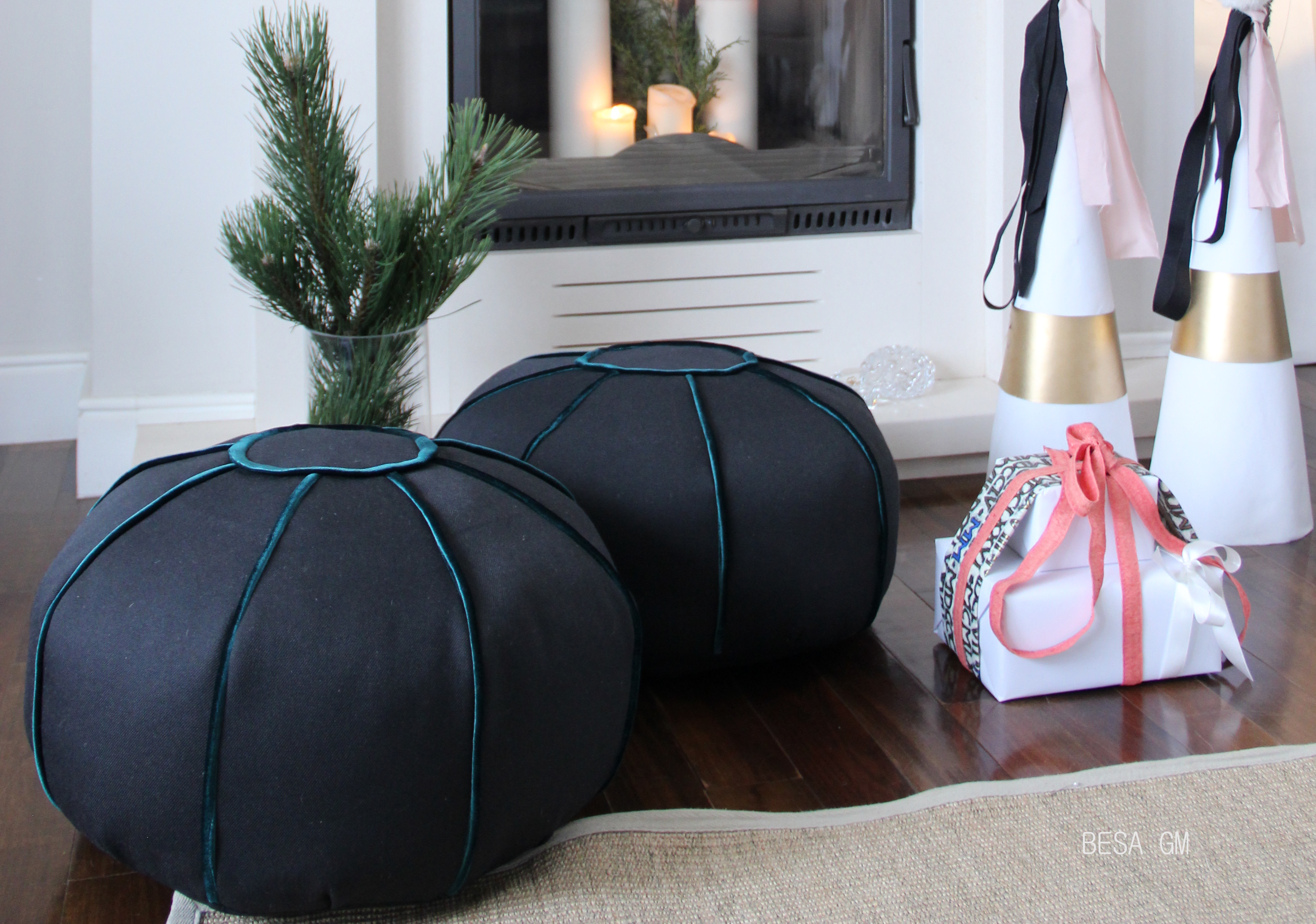 For a modern look, instead of placing a chair on a side of the fireplace, I placed two DIY poufs. You can find instructions for making this pouf here.