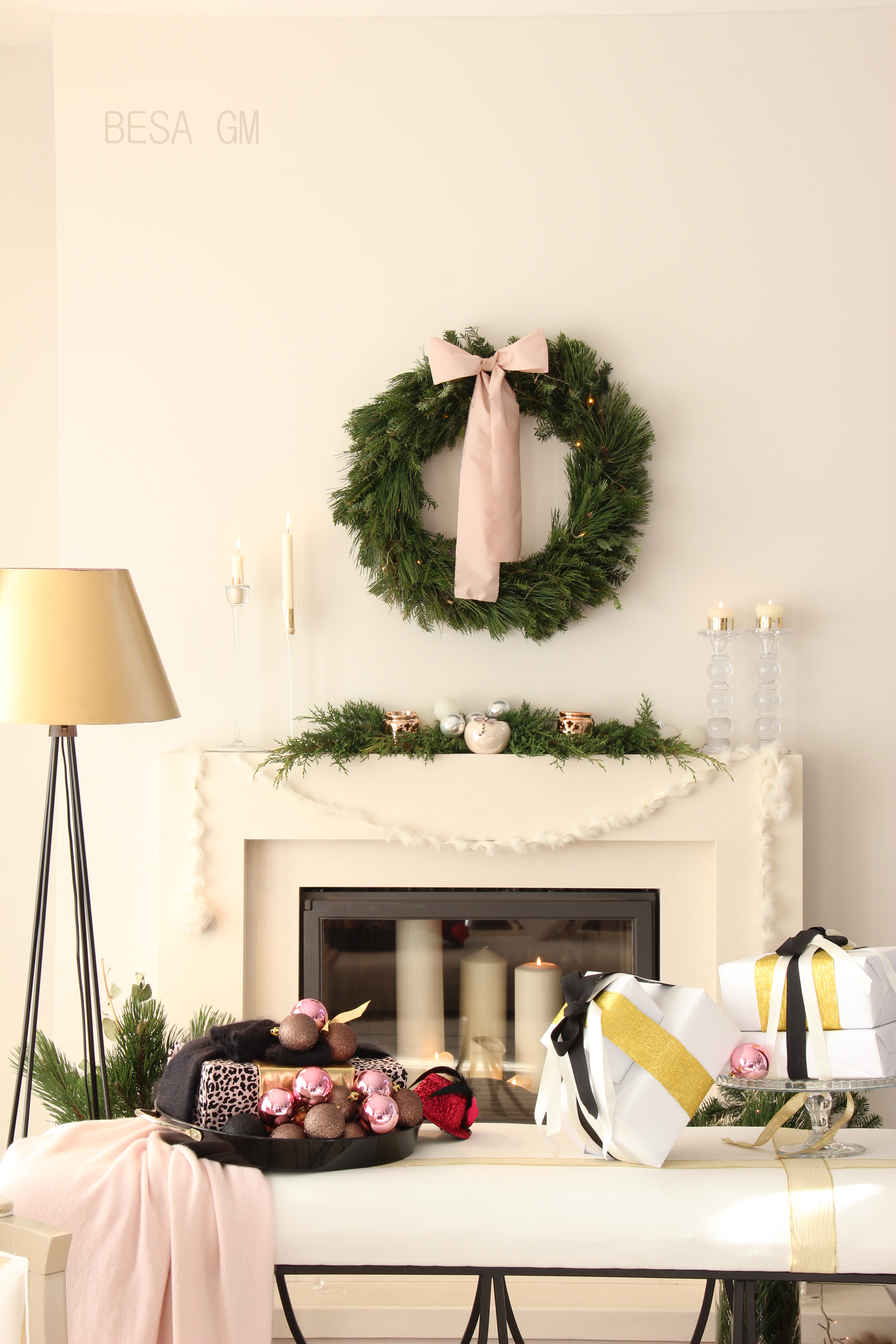 Per te arijtur nje pamje te tille, siper kaminit vendosa nje nder kurorat e fresketa te punuara gjat weekendit, ndersa ne mantelin e kaminit vendosa dege pishash te fresketa nga kopshti im, dhe ne mes te tyre vendosa disa qirinje ne lartesi te ndryshme.