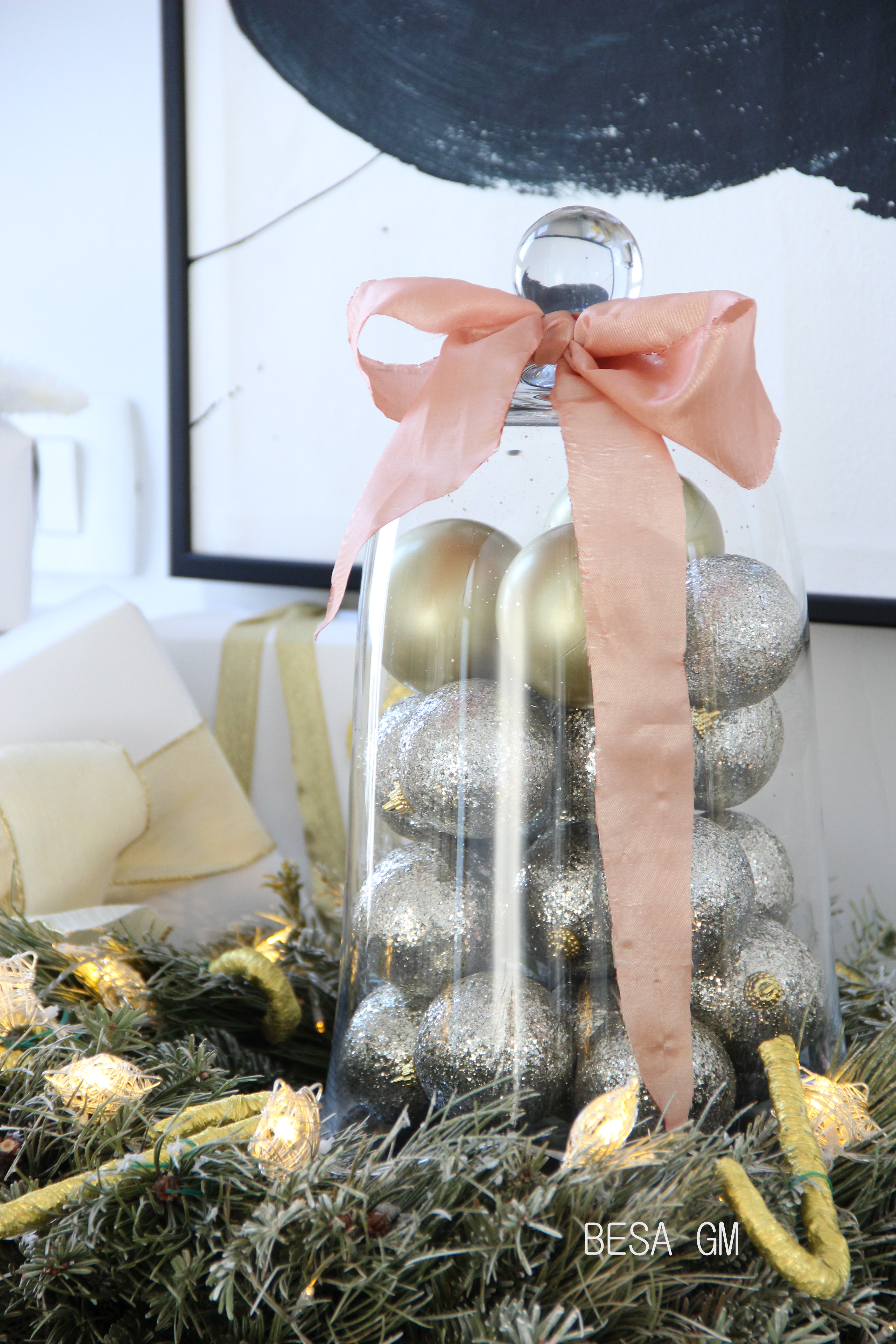 I filled this cloche with ornaments, found a piece of fabric in the colour which has been trending this year in Holiday decorating and tied it on the top of the cloche, placed the cloche filled with ornaments on a cake stand and fitted those in a flocked wreath that was DIY-ed by me few weeks ago.