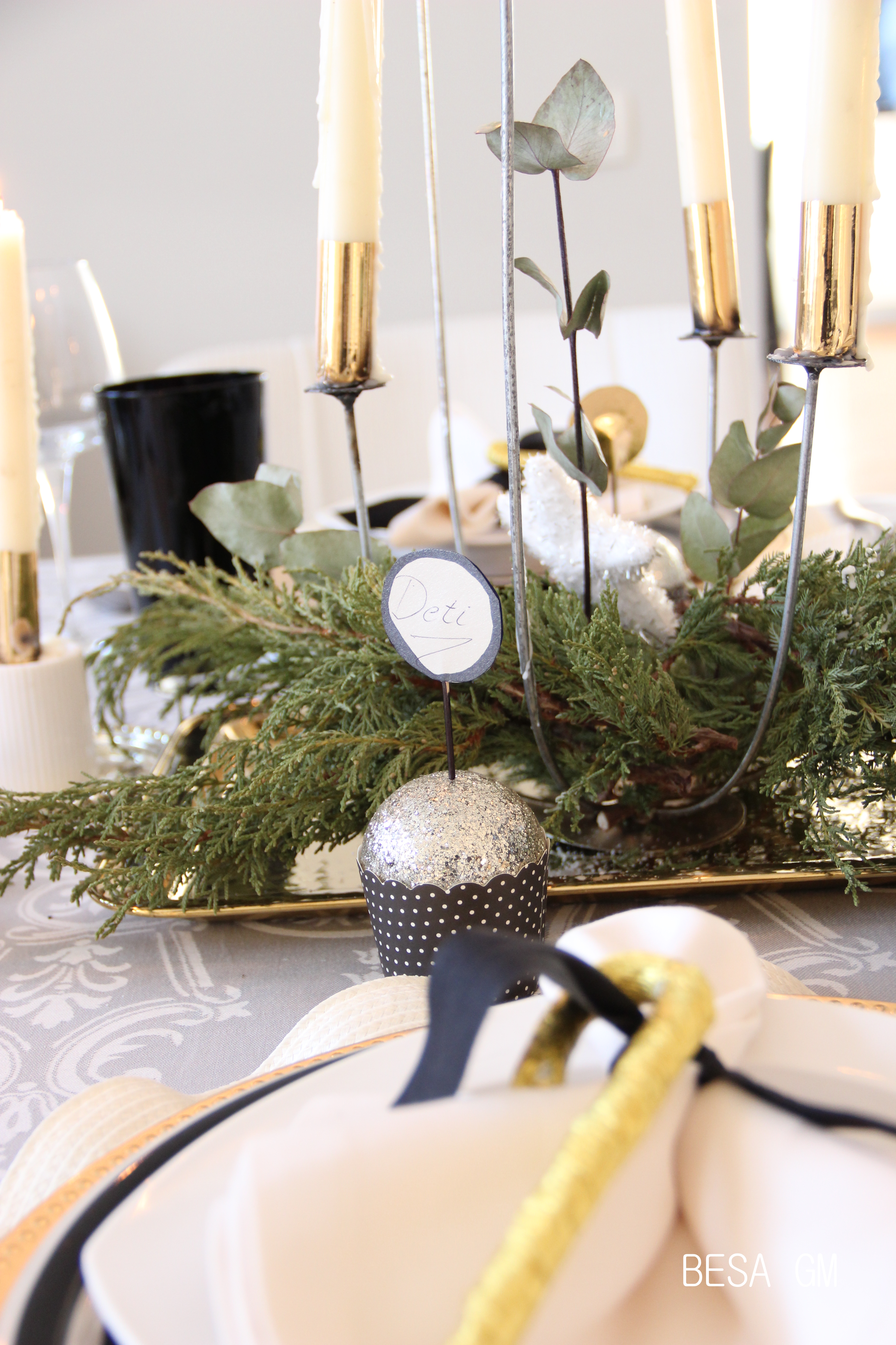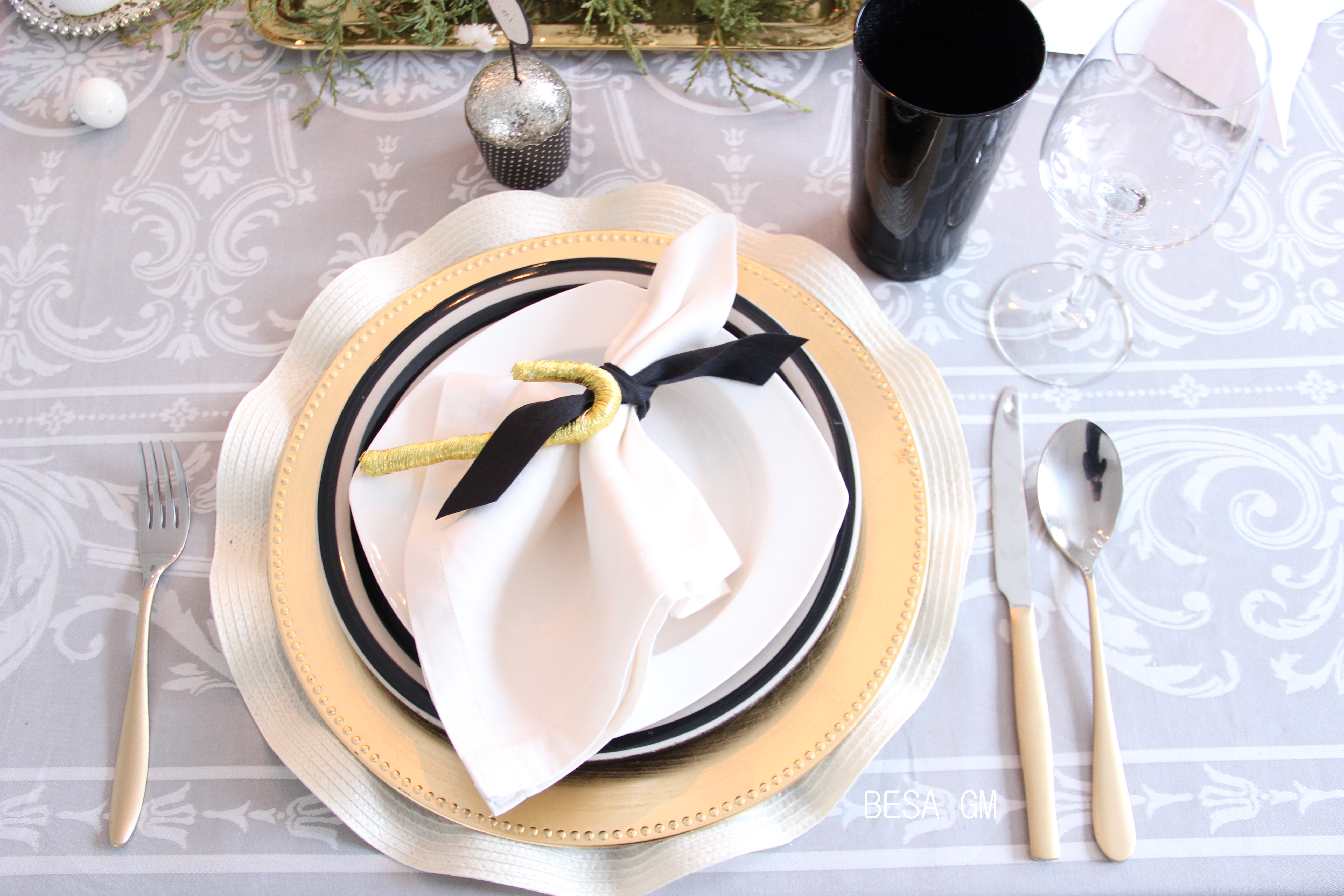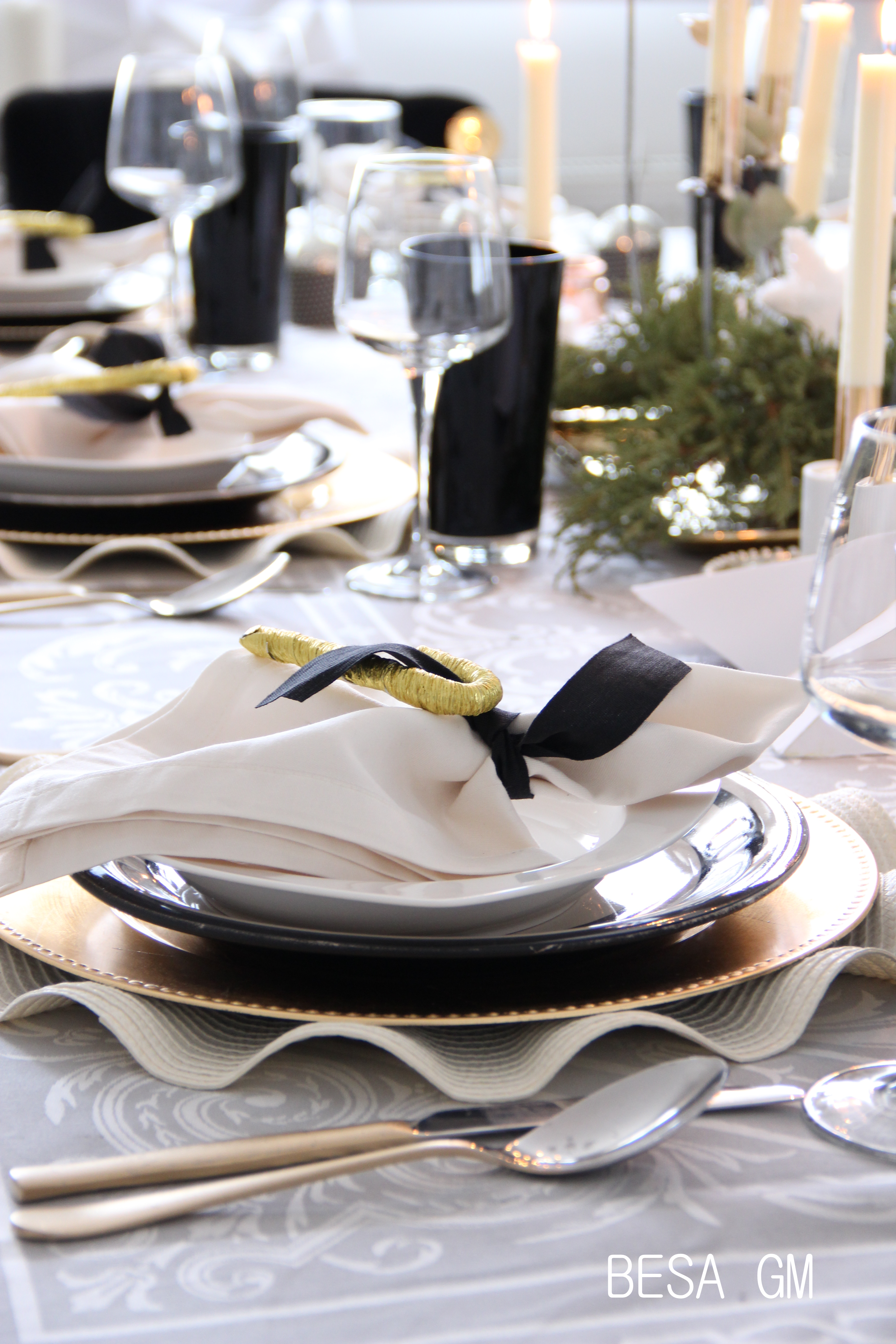 Per t’i shtuar nje detal glamuros,ne vend te unazes per salveta, i lidha salvetat me nje fjongo te zeze nga pambuku kualitativ dhe e vendosa siper salvetes nje detaj ngjyre ari. Detaji ngjyre ari ne te vertet eshte nje detaj Beje Vet, dhe eshte nje dhurate e vogel per mysafiret, ndersa metoden se si e bera do ta ndaje me ju se shpejtin, ne njerin nga postet e ardhshme.
