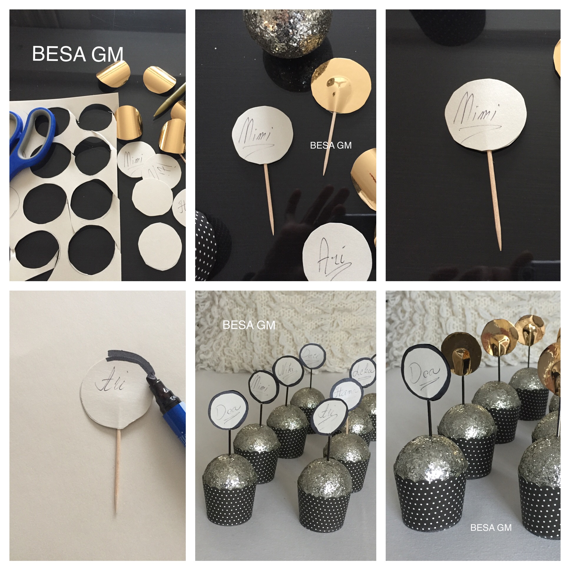 I krijova keto dekore qe mbajne emrat e mysafireve te ftuar qe te duken sikurse embelsira te volga (cupcake) dhe ato dolen shume simpatike dhe vertete e komplementuan temen e dekorit te tryezes.