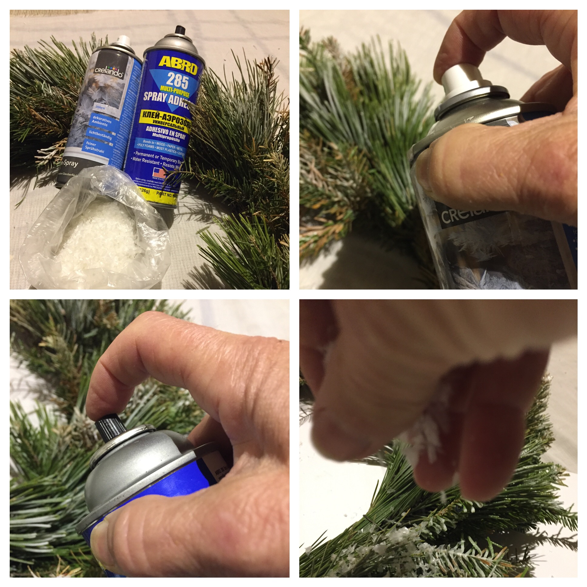 Gjithshtu i bera me debore artificiale kurorat nga gjethet e fresketa te pishes te cilat i kisha punuar shume me heret. Pas disa javeve ato filluan paksa te vyshken andaje edhe nevojitej nje intervenim. Efektin e debores ne to e fitova duke i sperkatur me sprej te bardhe dekorativ dhe pastaj i bera me sprej ngjites dhe menjehere mbi to hudha fluska artificiale debore.