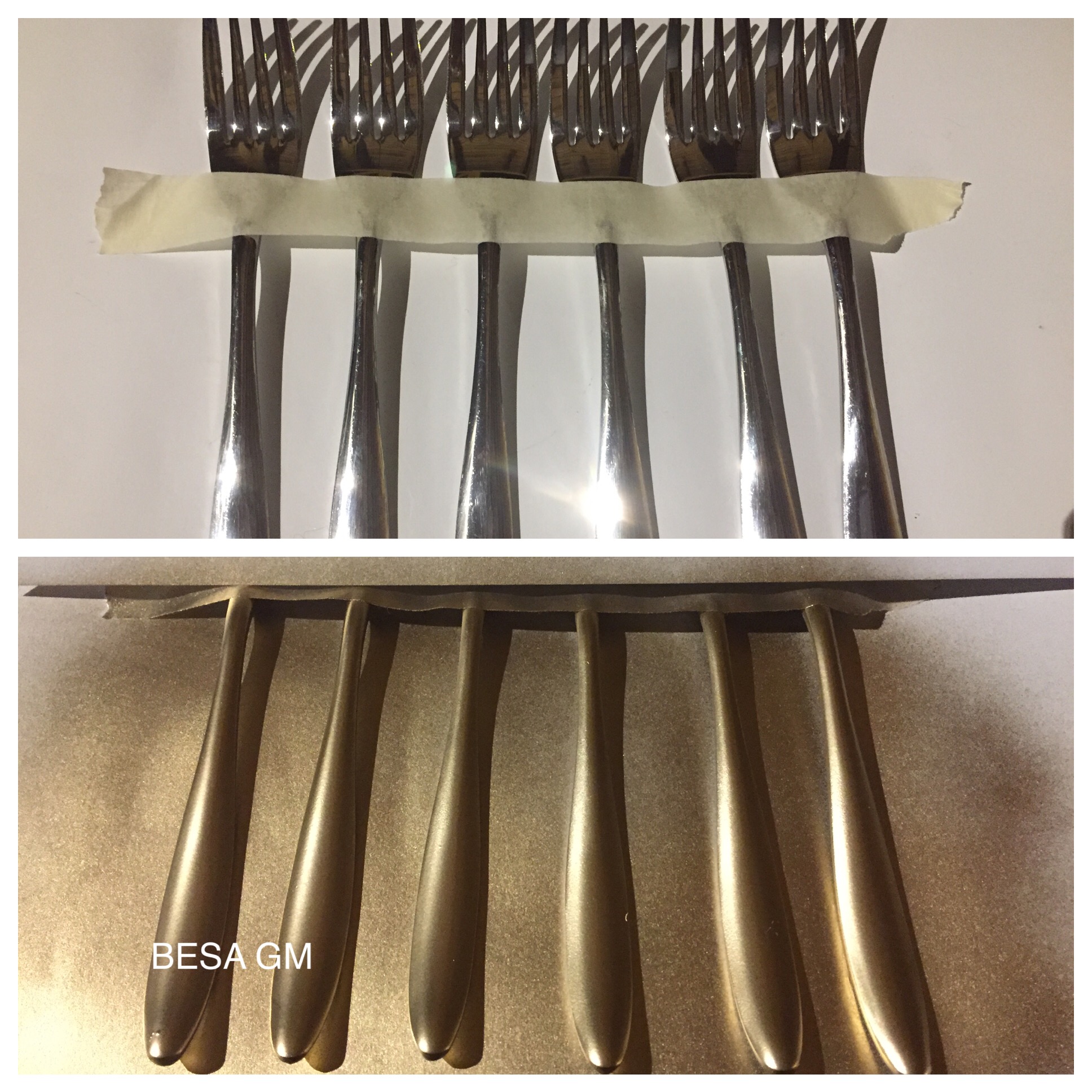 Dhe perfundimisht nderhyra edhe tek thikat dhe pirunjet. Kete vit deshiroja qe t’i kisha gjithsesi luget,thikat dhe pirunjet me ngjyre metalike te arit. Megjithate, cmimet te cilat ishin neper shitore per nje komplet te tille ishin tej mase te larta dhe une nuk isha e pergaditur te shpenzoj aq shume para per to, dhe fatkeqsisht nuk e kam ndonje Target (mega shitore Amerikane qe ofron produkte moderne me cmime te ulta) afer qe t’i blej me cmim te volitshem; por me metoden Beje Vet e arita pamjen e tyre cfare e deshiroja duke i ngjyrosur dorezat e tyre me sprej ngjyre ari.