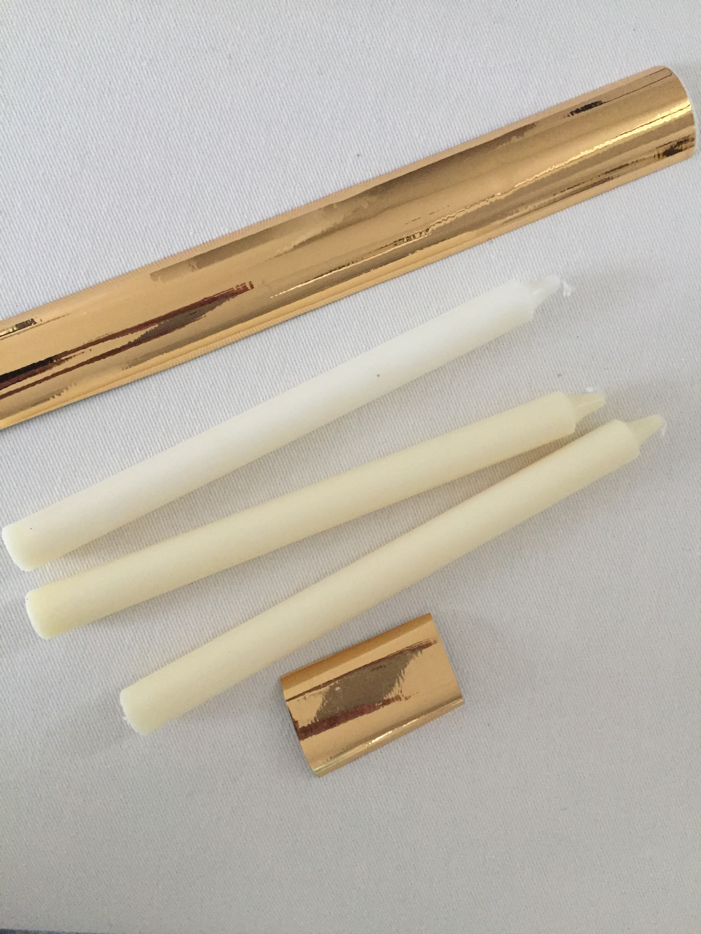 The candles are also altered with this simple DIY. I wanted some golden sparkle on candles, so i wrapped the bottom of a candle with a 2 “ stripe of a golden self adhesive foil.