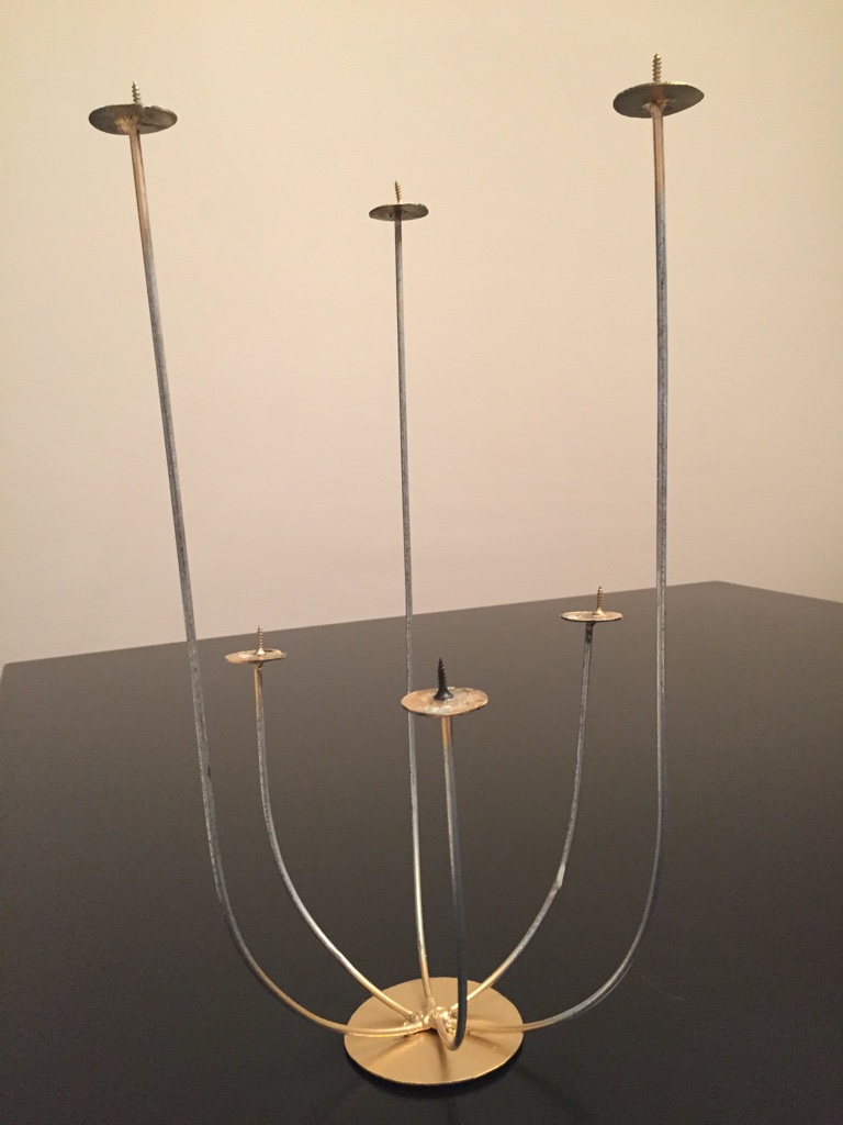 Per sa i perket dekorit qendror te tavolines, deshiroja qe te ishte me shume qirinje por nuk gjeja mbajtese qirinjesh qe i pershtatej visionit tim, andaj edhe e dizajnova mbajtesen dhe permes nje skicimi te thjeshte ajo u realizua nga nje mjeshter saldues. Produkti final nuk e ka ate finalizimin sic do ta kishte nje produkt i fabrikuar, por me rendesi eshte qe mbajtsja e ka pamjen qe une e deshiroja dhe duket shume bukur me qirinje.