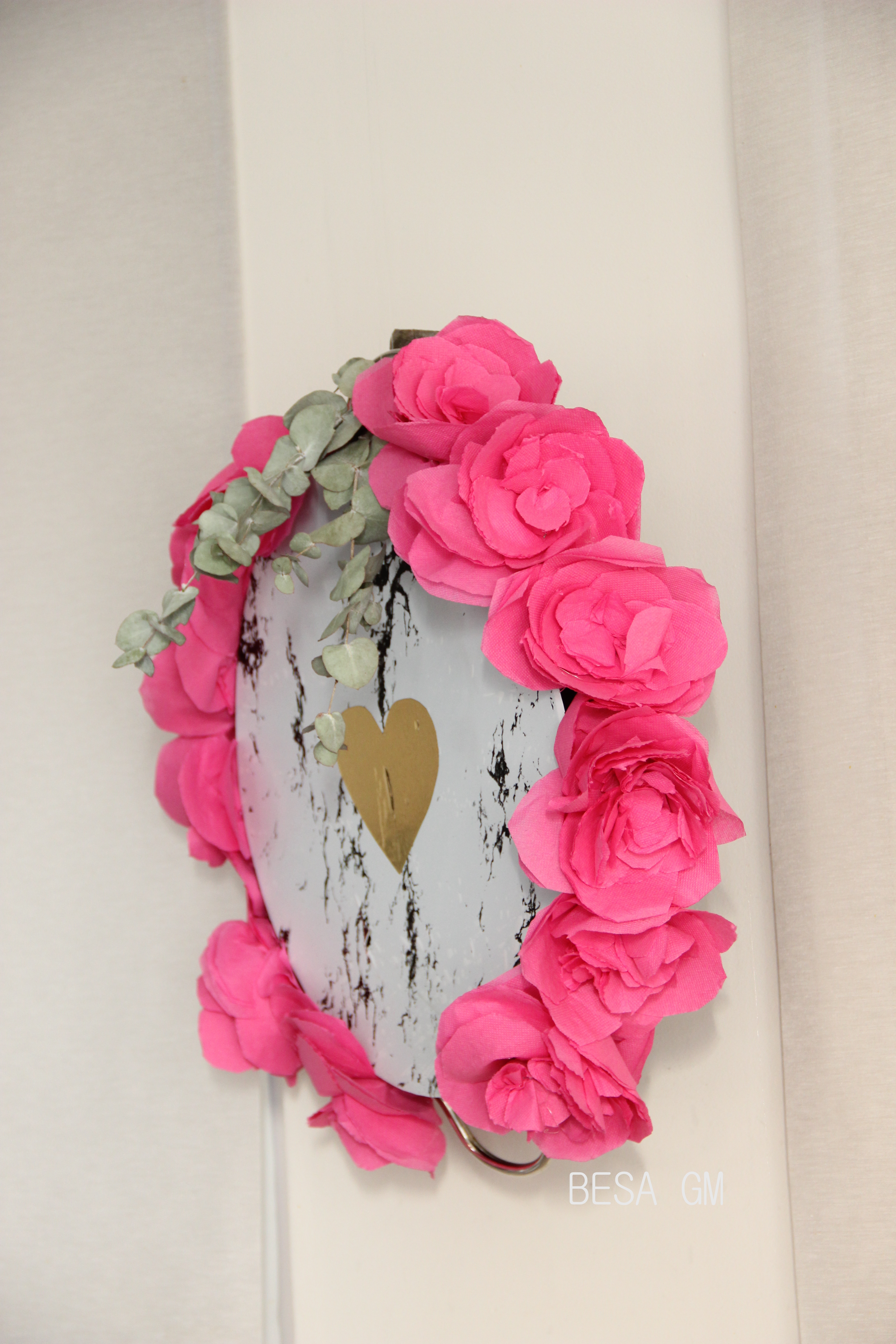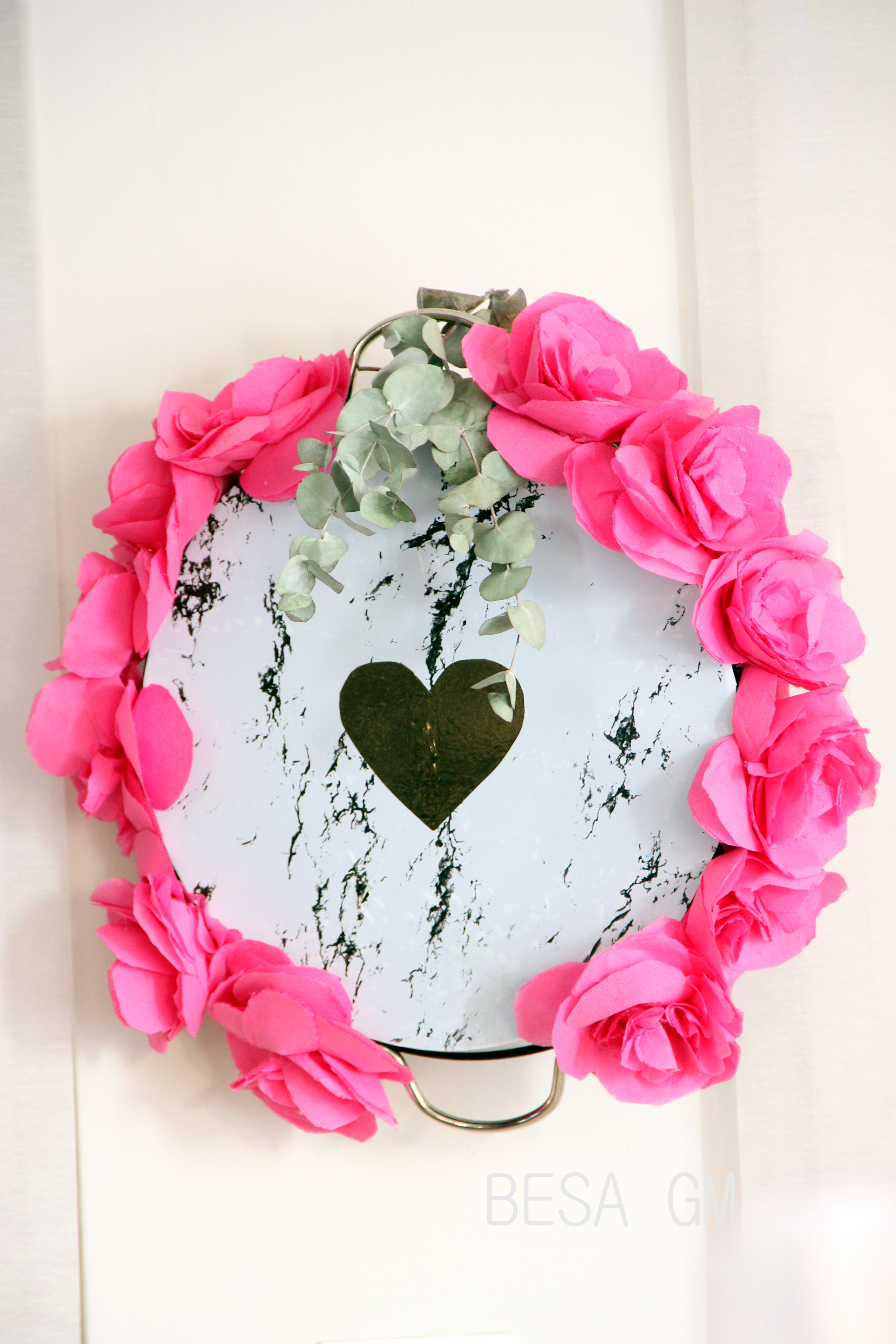 Get a a round tray. Flip it back and layer it with a self adhesive marble look paper. Using self adhesive gold colour paper, draw and cut a little heart shape, and stick it in the middle of the tray. Start gluing the flowers around the tray edge. Your wall hanging decor is ready to by hung.