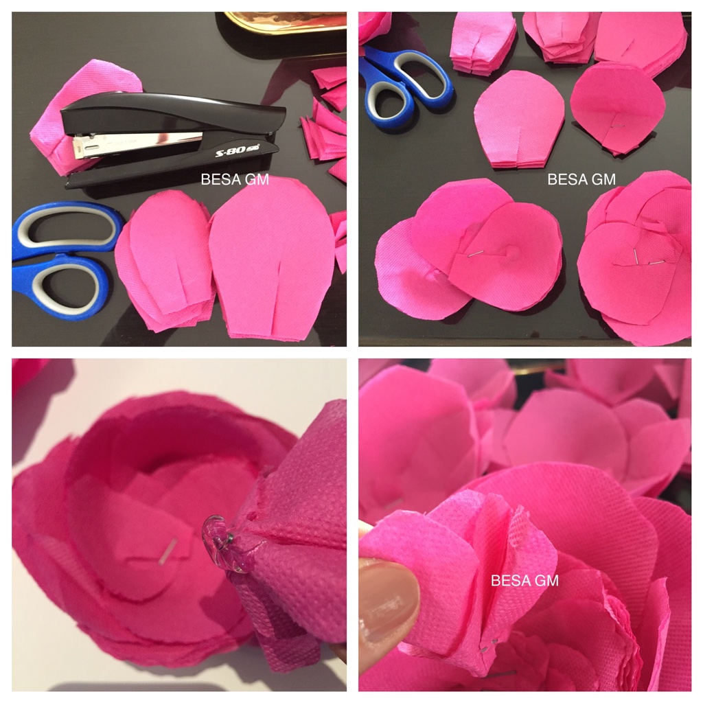 Filloni me prerjen e petaleve ne tre madhesi te ndryshme. Madhesia e petaleve varet nga ajo se sa te medha do t’e deshironit t’i keni lulet. Ne pjesen e poshtme te petaleve e beni nje carje te vogel ne mes (shih fotot) dhe filloni me palosjen e pjeses se poshtme te petalit duke e vendosur njeren siper tjetres dhe duke i kapur me kapese letre (stapler). Filloni me petalet me te medha dhe vazdhoni me madhesite tjera sipas radhes. I bashkoni nga tre petale ne nje vend dhe pastaje i bashkoni nga dy grupe te tilla se bashku. Vazhdoni me bashkimin e petaleve duke vendosur siper njera tjetres palet e petaleve te tre madhesive te ndryshme dhe do te perfundoni me nje lule te bukur. I shprishni petalet duke i ndare shtresat e salvetes se letres. Per kete projekt ju nevojiten 12 lule.