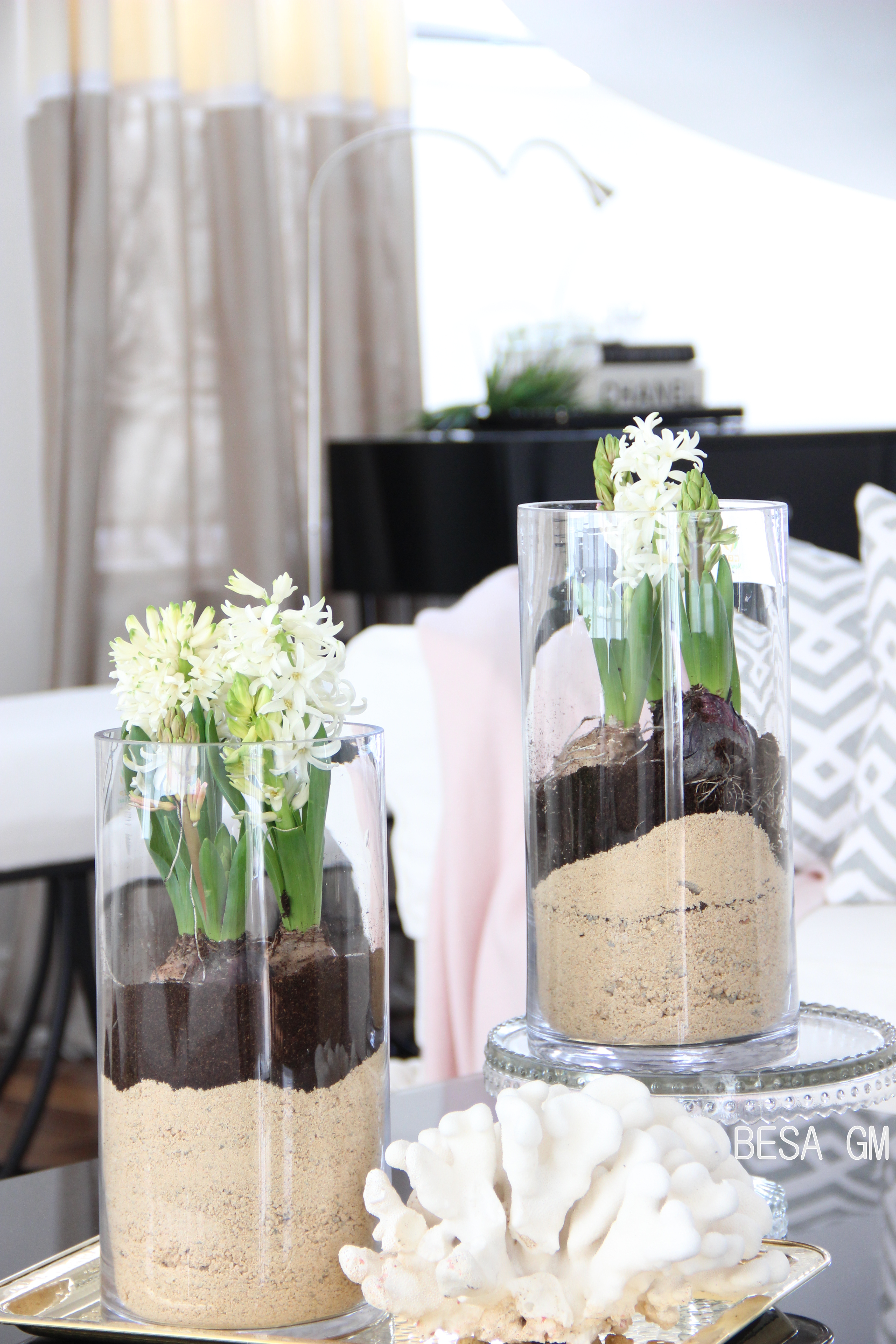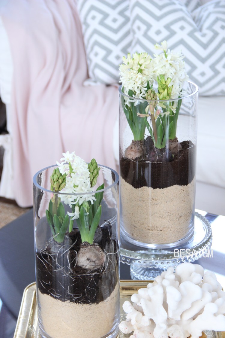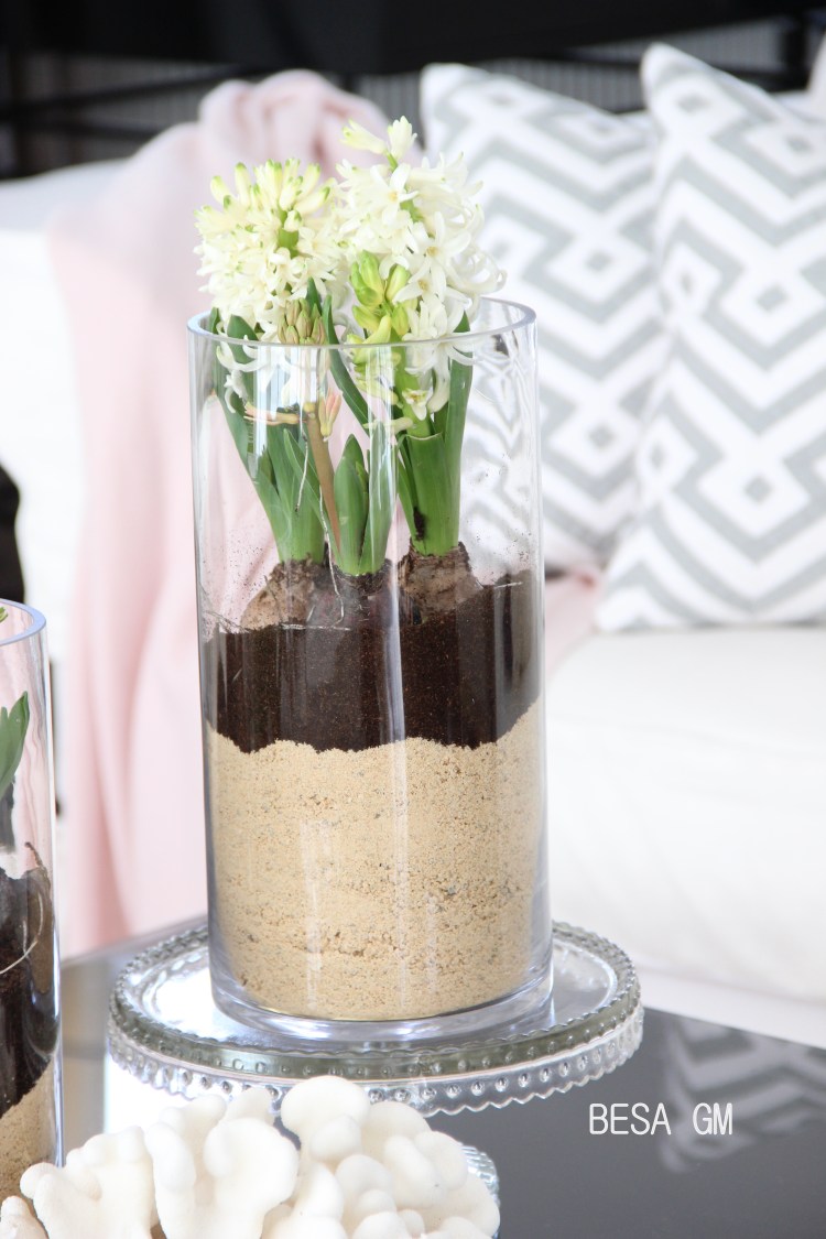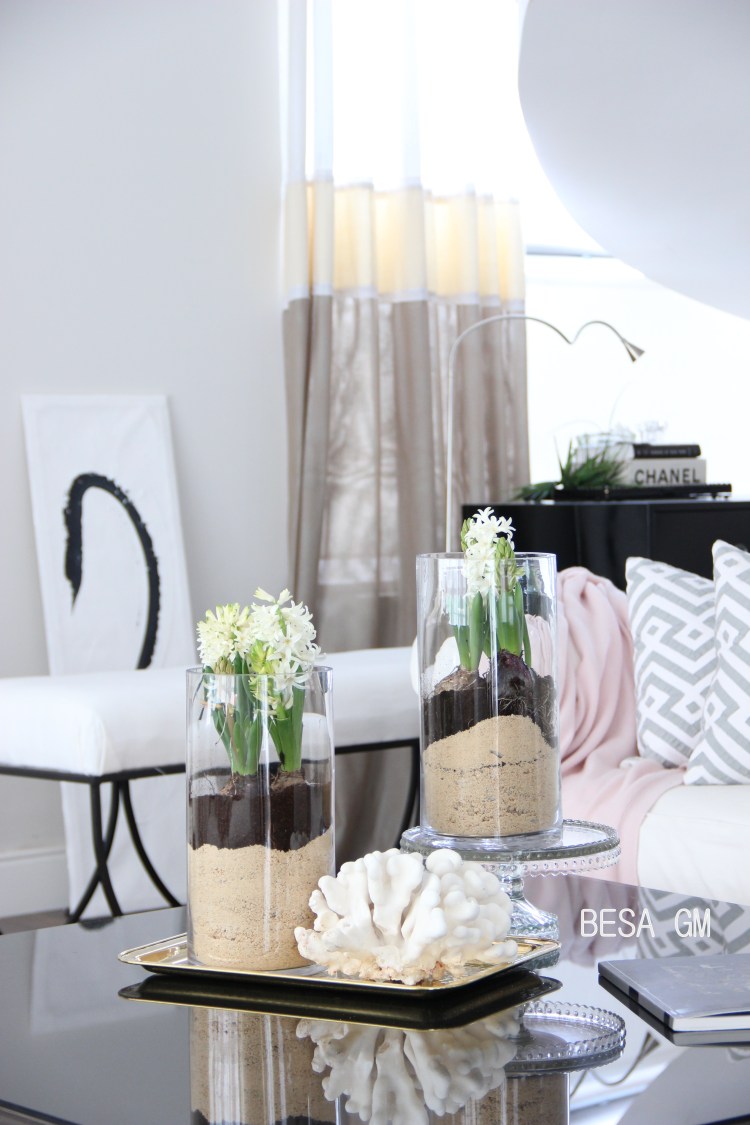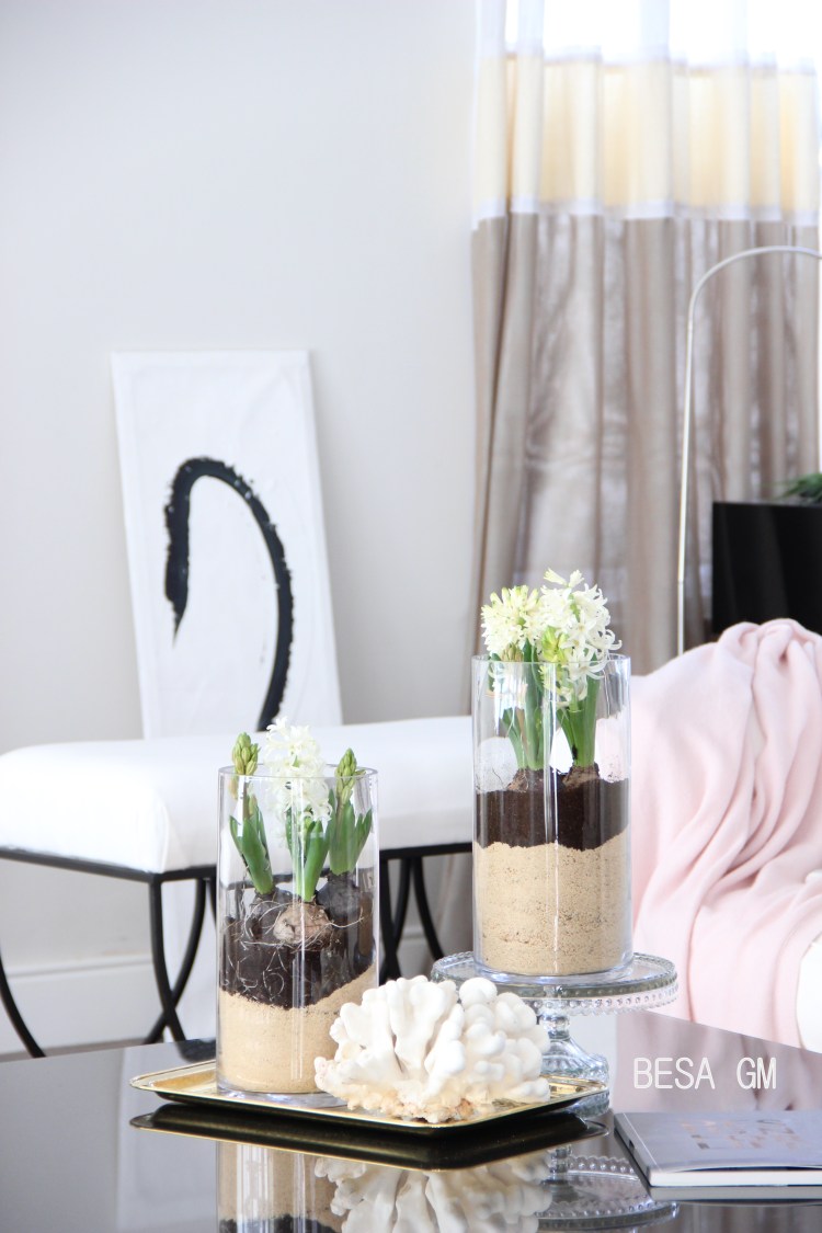 However, this does not mean that I had to wait and do nothing until spring comes! Last weekend I picked up a couple of vases filled with hyacinth in a local market and rearranged them in hurricane vases. They came pretty nice and really turned my home on a spring mode. They look pretty and have filled my home with a beautiful scent.