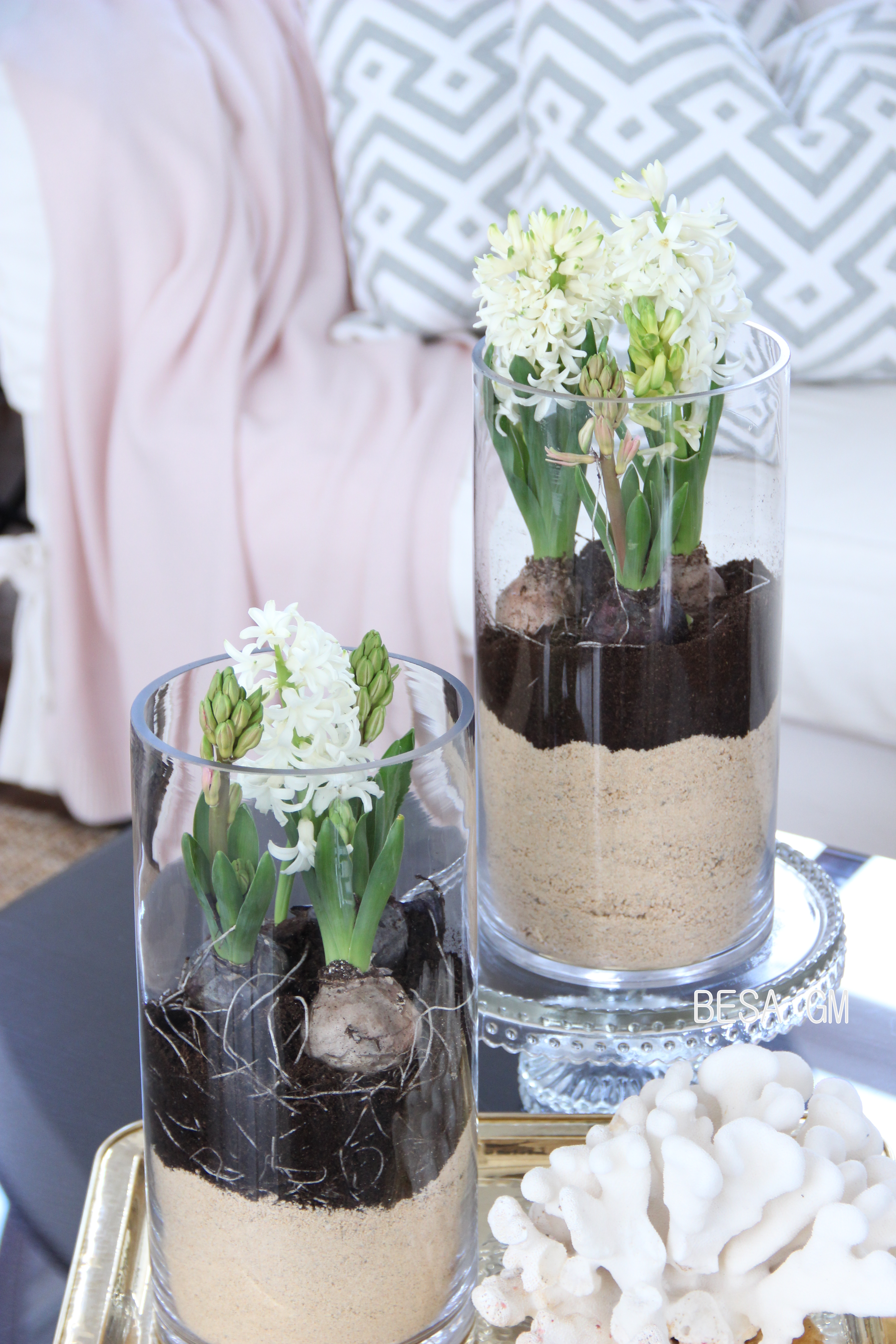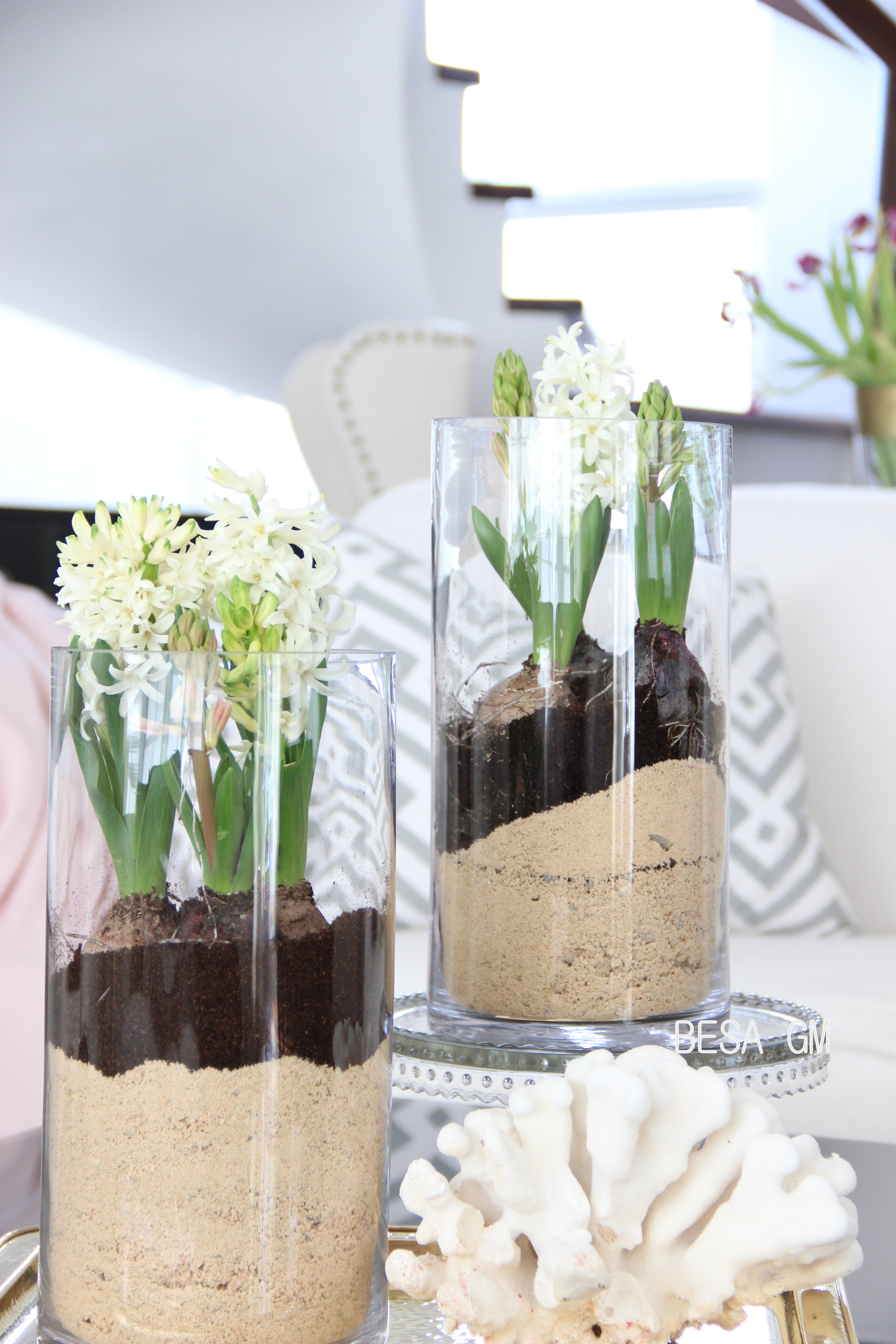 Place a generous amount of sand in a vase. Make a shallow hole in the middle of the sand, and place the bulbs. Add some remaining soil to fill the gaps between bulbs, and you are done.