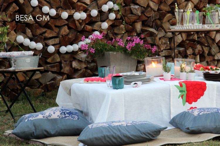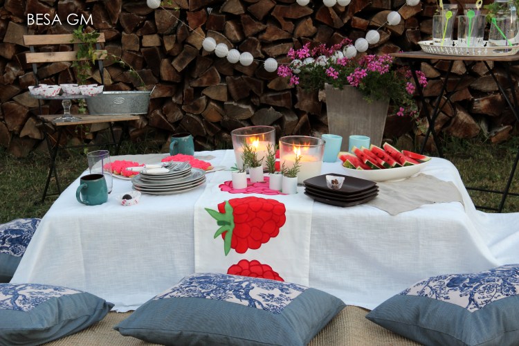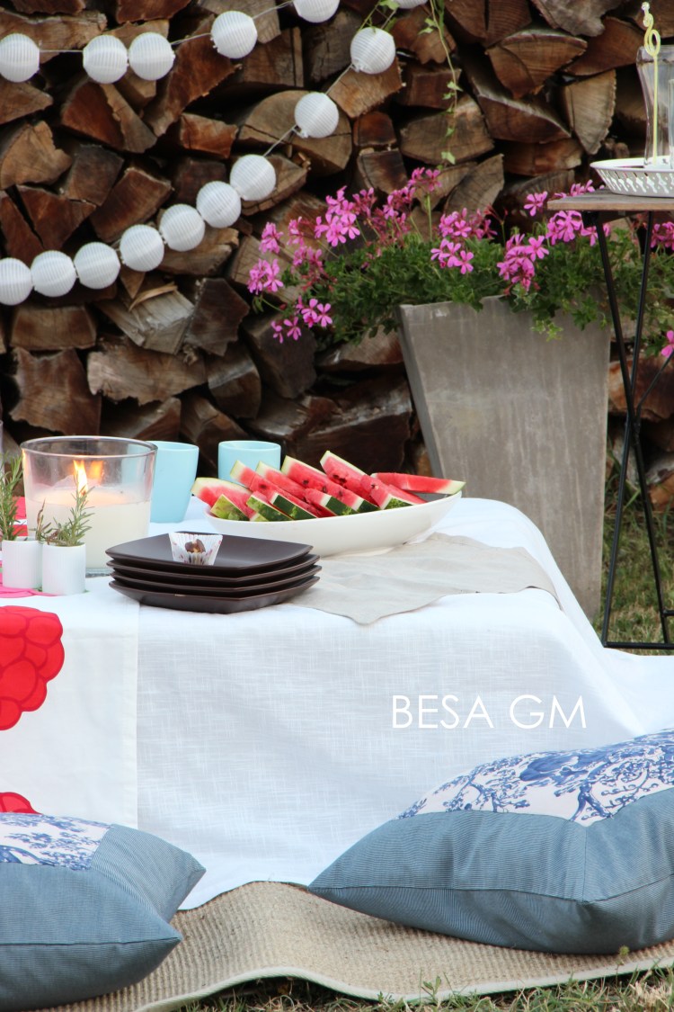 For our picnic I used my oversized decorative sofa cushions and instead of a blanket I used my patio carpet which is for an outdoor use. The use of these cushions gave this picnic that boho chic vibe.