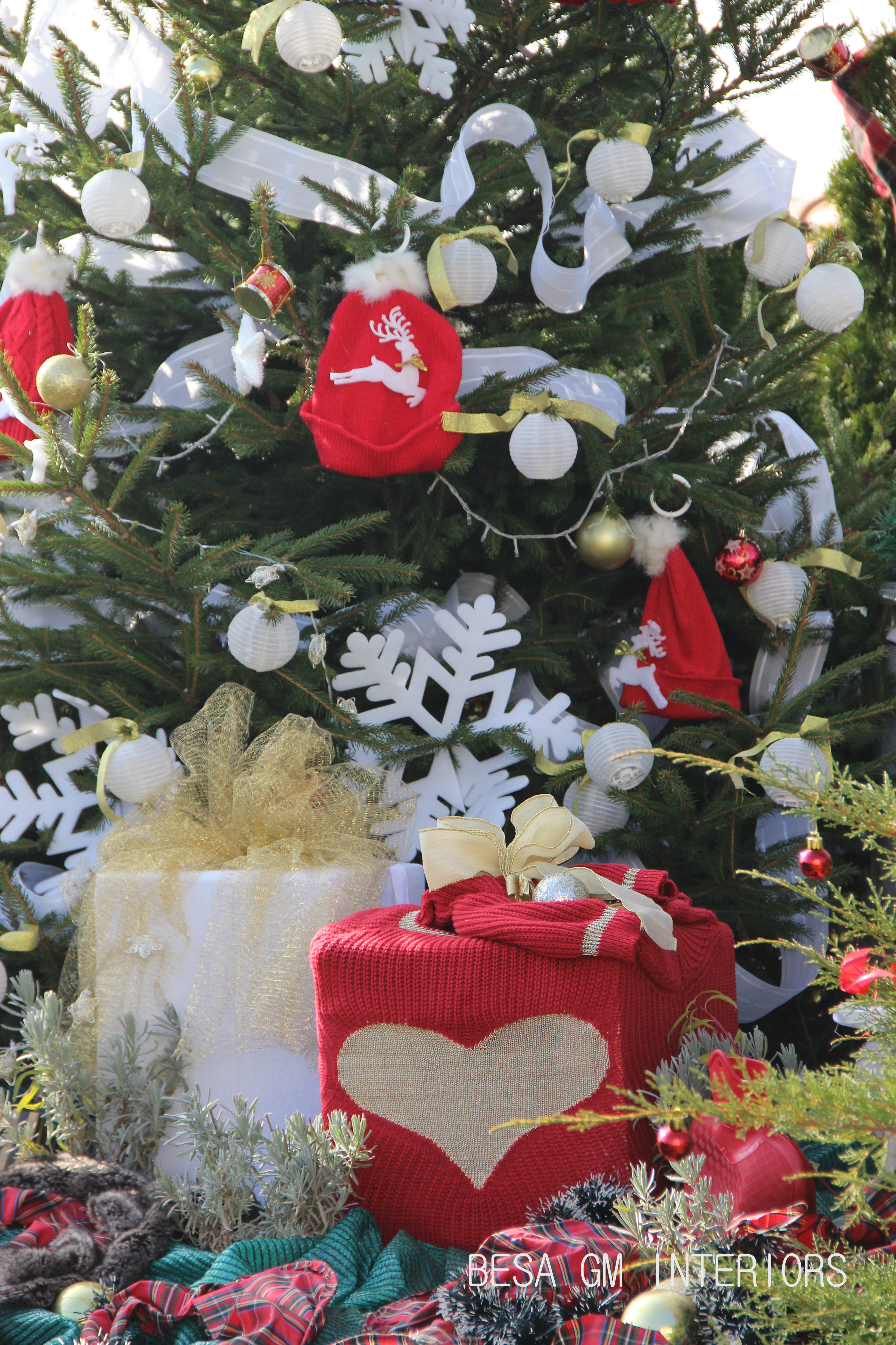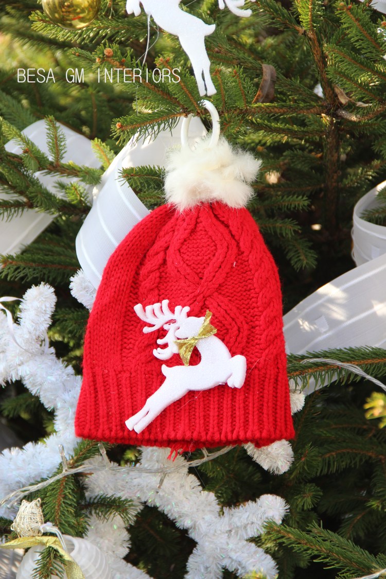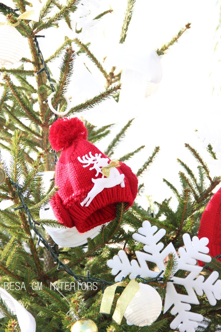 I decorated the tree mostly with white ornaments, white and gold ribbon and added a lot of white snowflakes, and lastly I hung the red knitted hats.